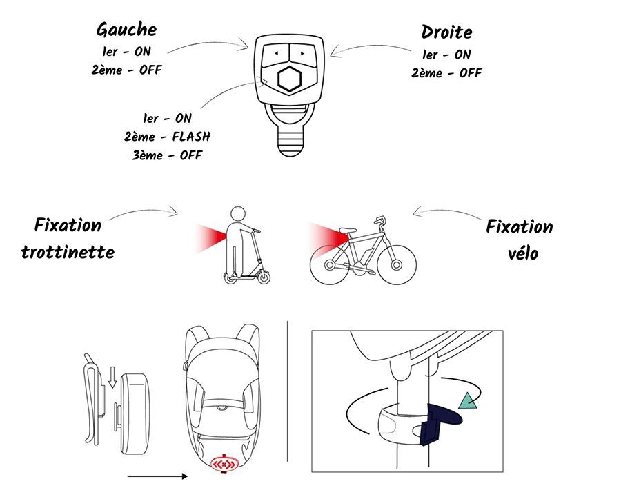 La batterie peut être rechargée grâce à un câble USB inclus, en moins de 3 heures. Le feu se fixe facilement sur la tige de selle du vélo ou sur un sac à dos, pratique pour les sorties en trottinette.