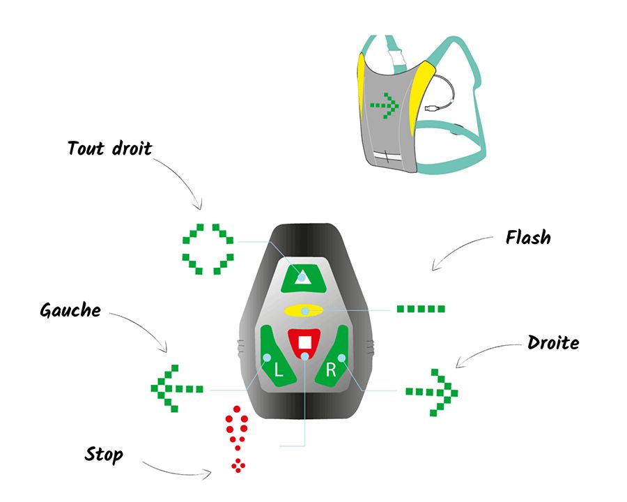 Le dossard se commande à l'aide d'un boitier sans fil amovible, conçu avec le système Quick Release qui permet un retrait facile de l'appareil. Il se fixe sur le guidon du vélo ou de la trottinette.