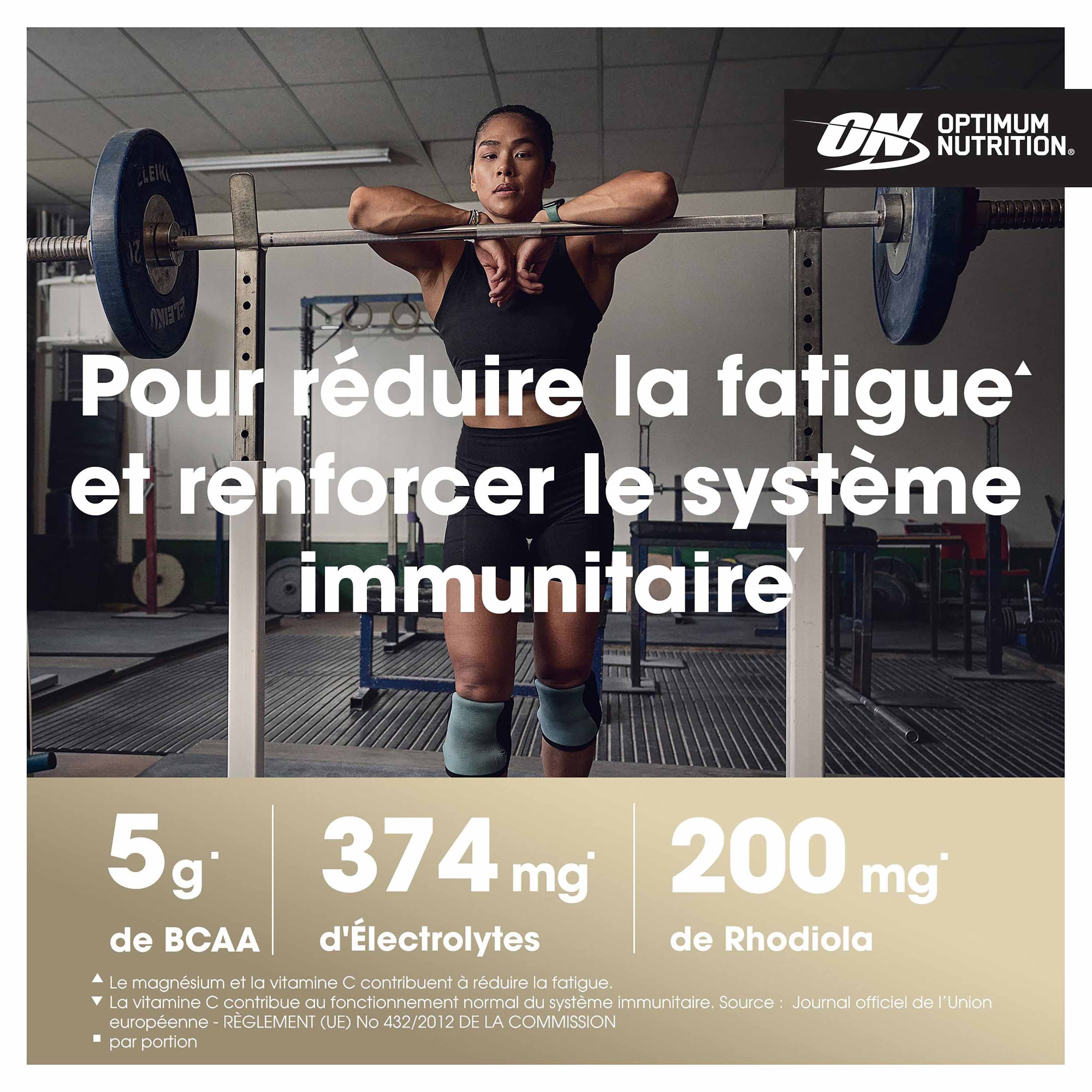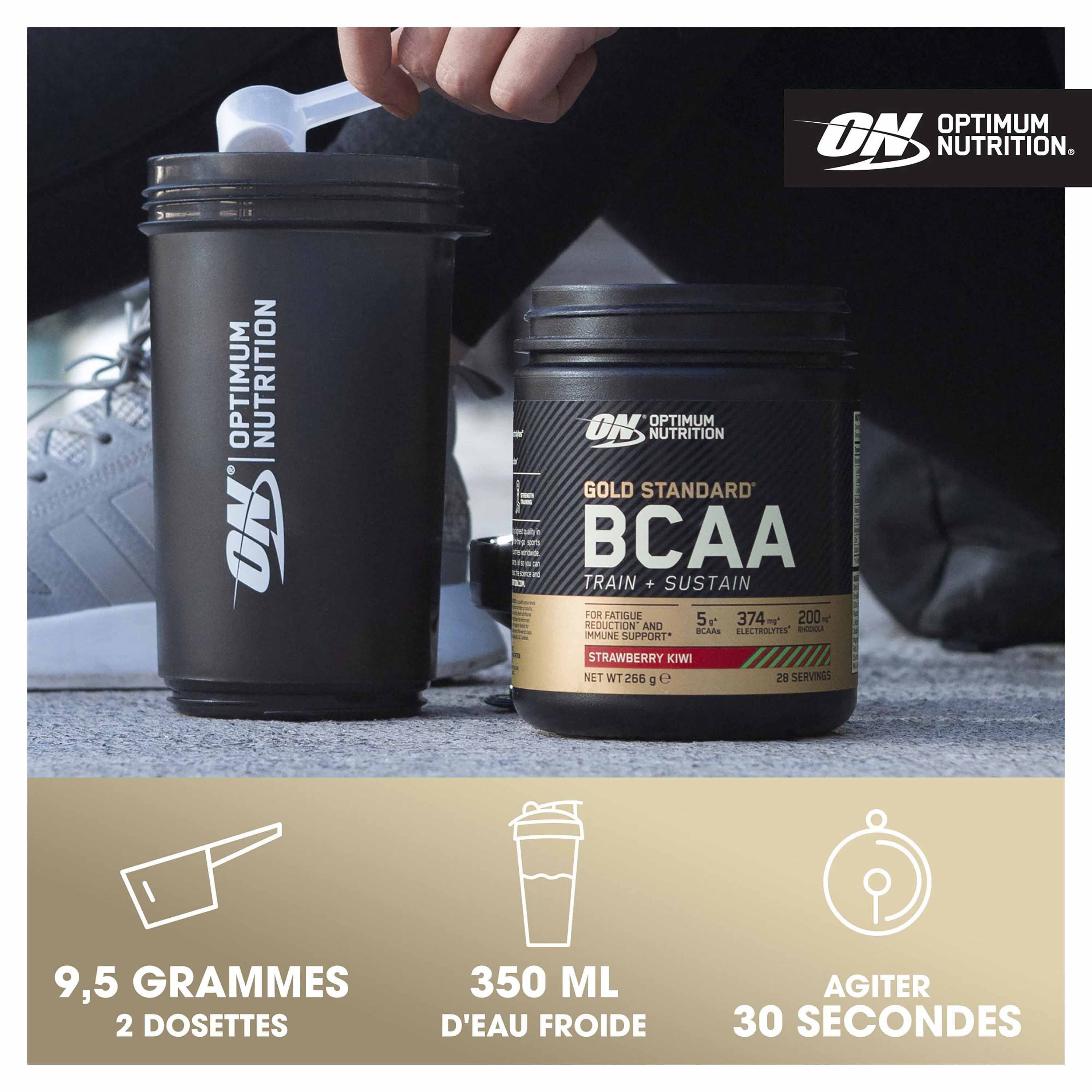 Les BCAA (acides aminés à chaîne ramifiée) sont un groupe de trois acides aminés essentiels (la leucine, l’isoleucine et la valine), considérés comme des composants clés des protéines. Gold Standard BCAA Train + Sustain en poudre fournit des BCAA ainsi que des vitamines et des électrolytes, et constitue donc une option pratique pour couvrir tes besoins nutritionnels pendant l’effort.