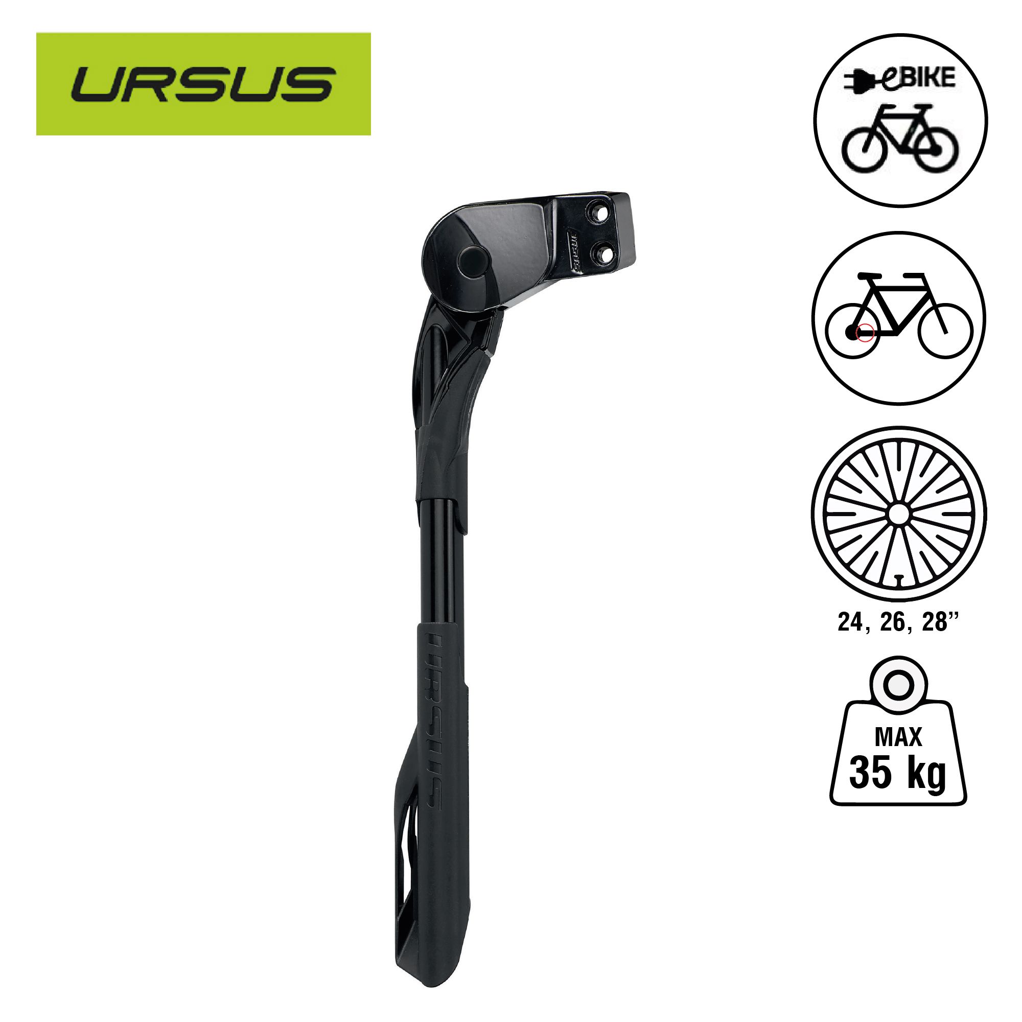 Elle est compatible avec les vélos et les vélos électriques en 24, 26 et 28". La longueur de la béquille est ajustable grâce à une vis de réglage.