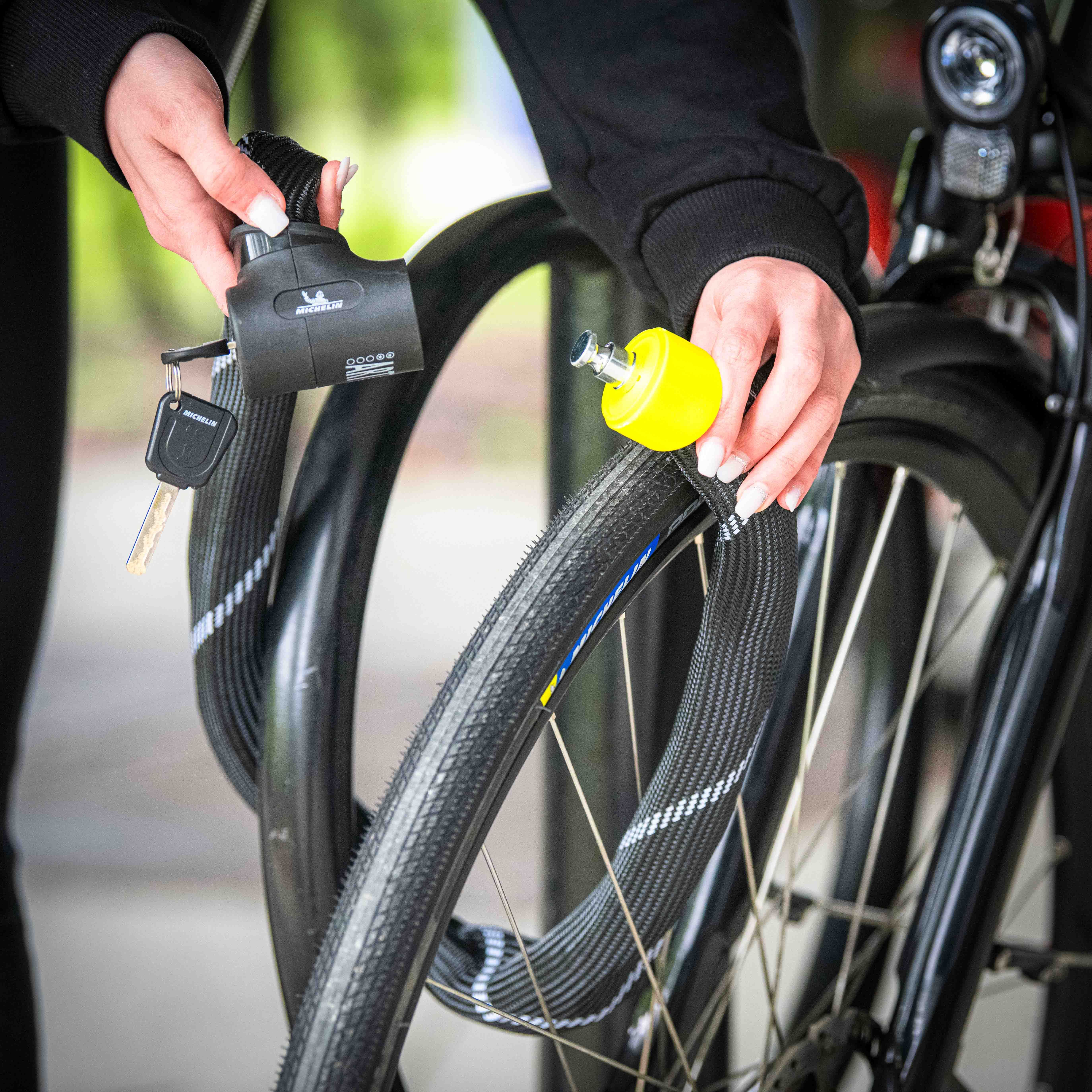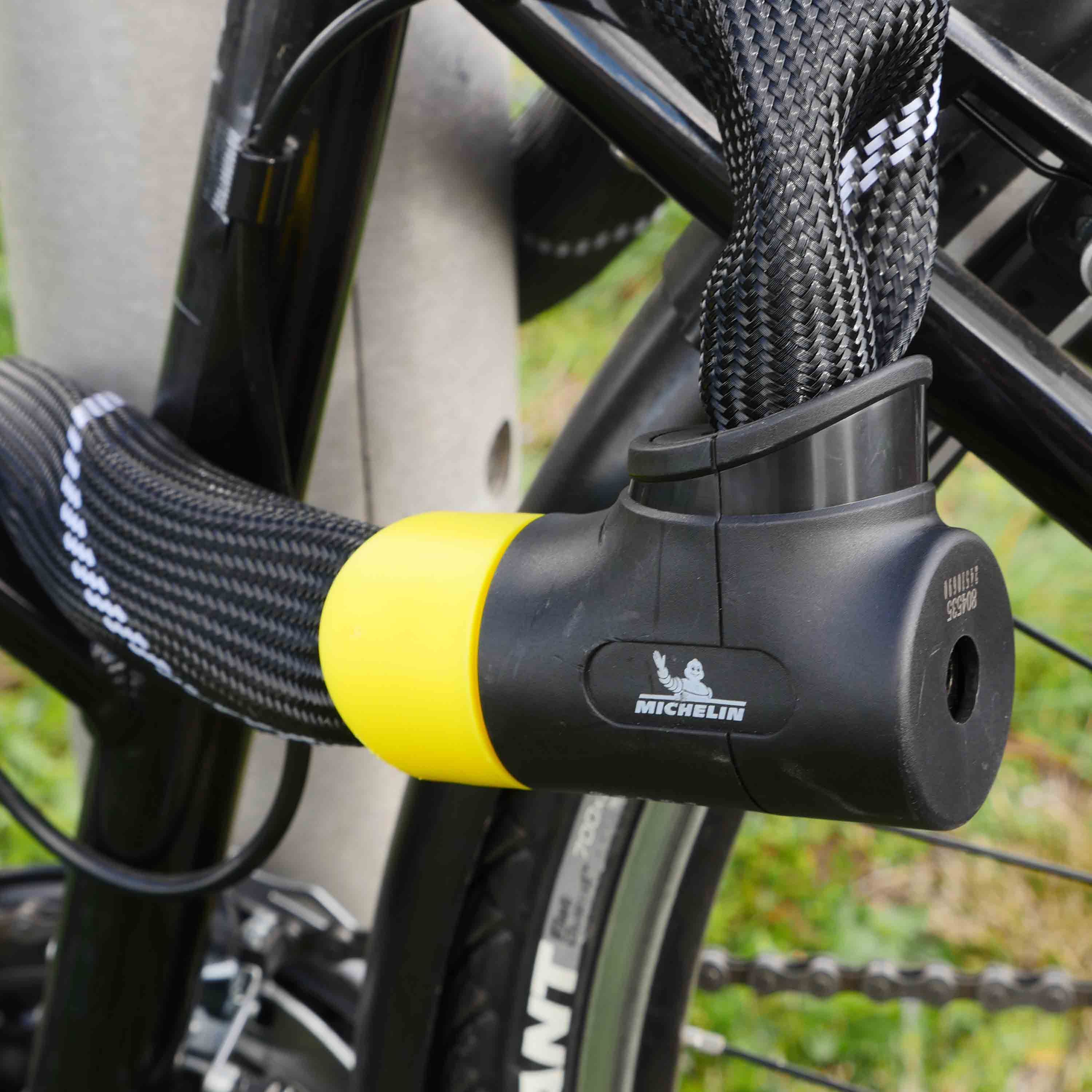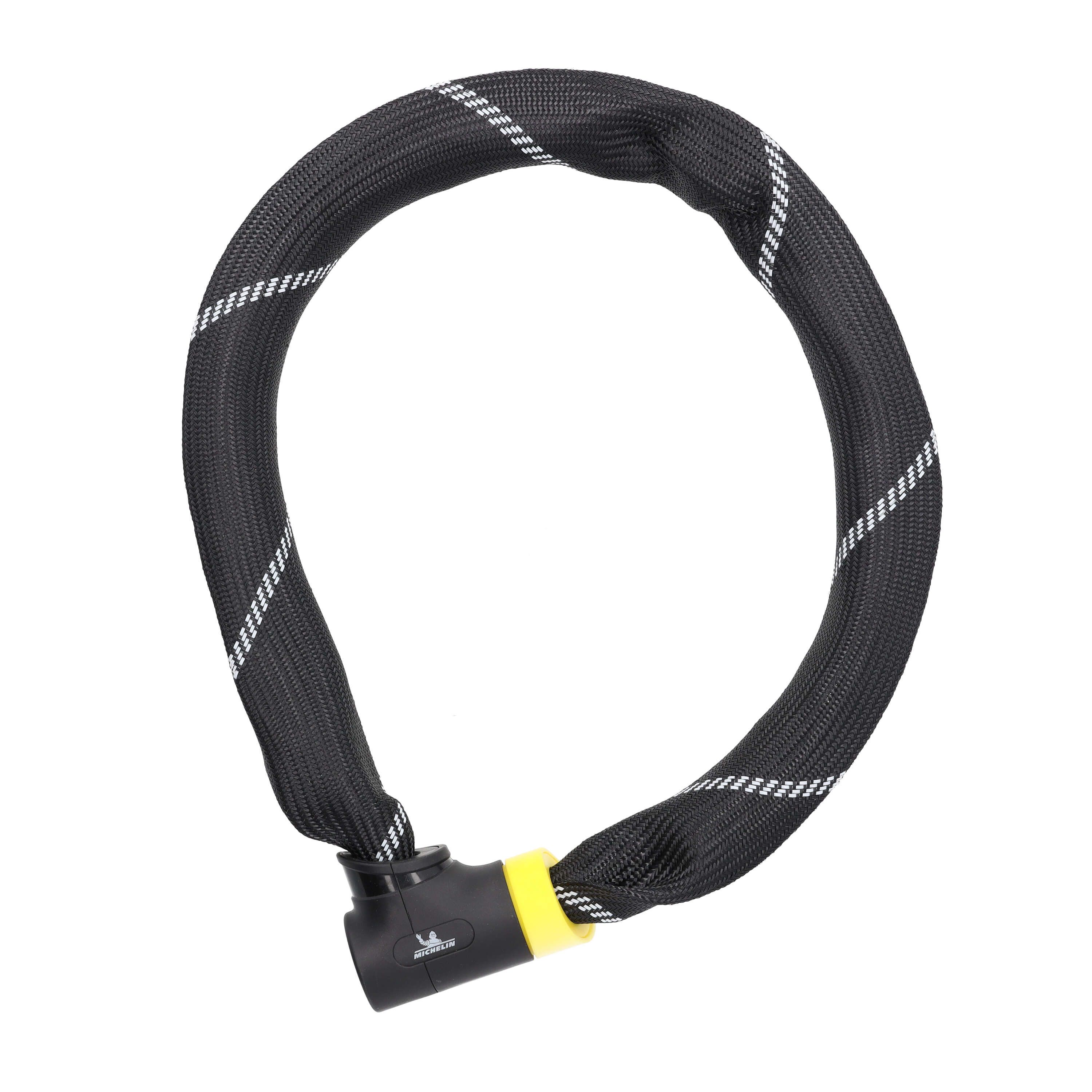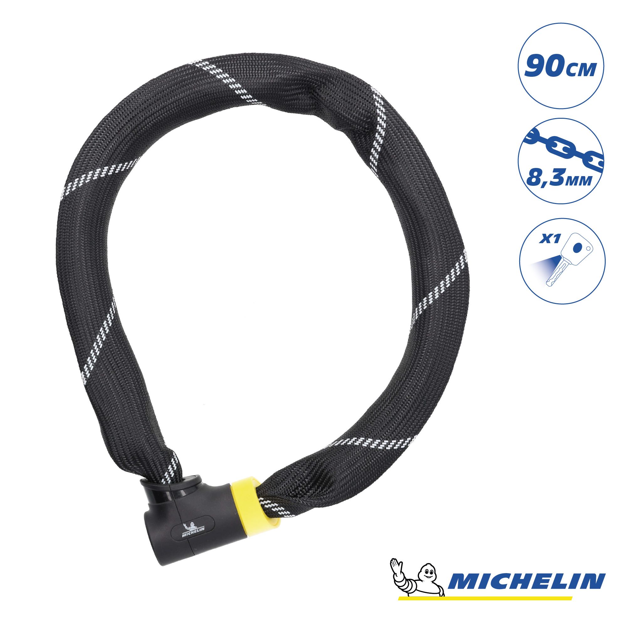 Équipé de maillons en acier trempé, l'antivol chaîne 900/83 MICHELIN permet d'attacher votre vélo à des points fixes de formes différentes (poteaux, grilles, garage a vélo, etc...).
