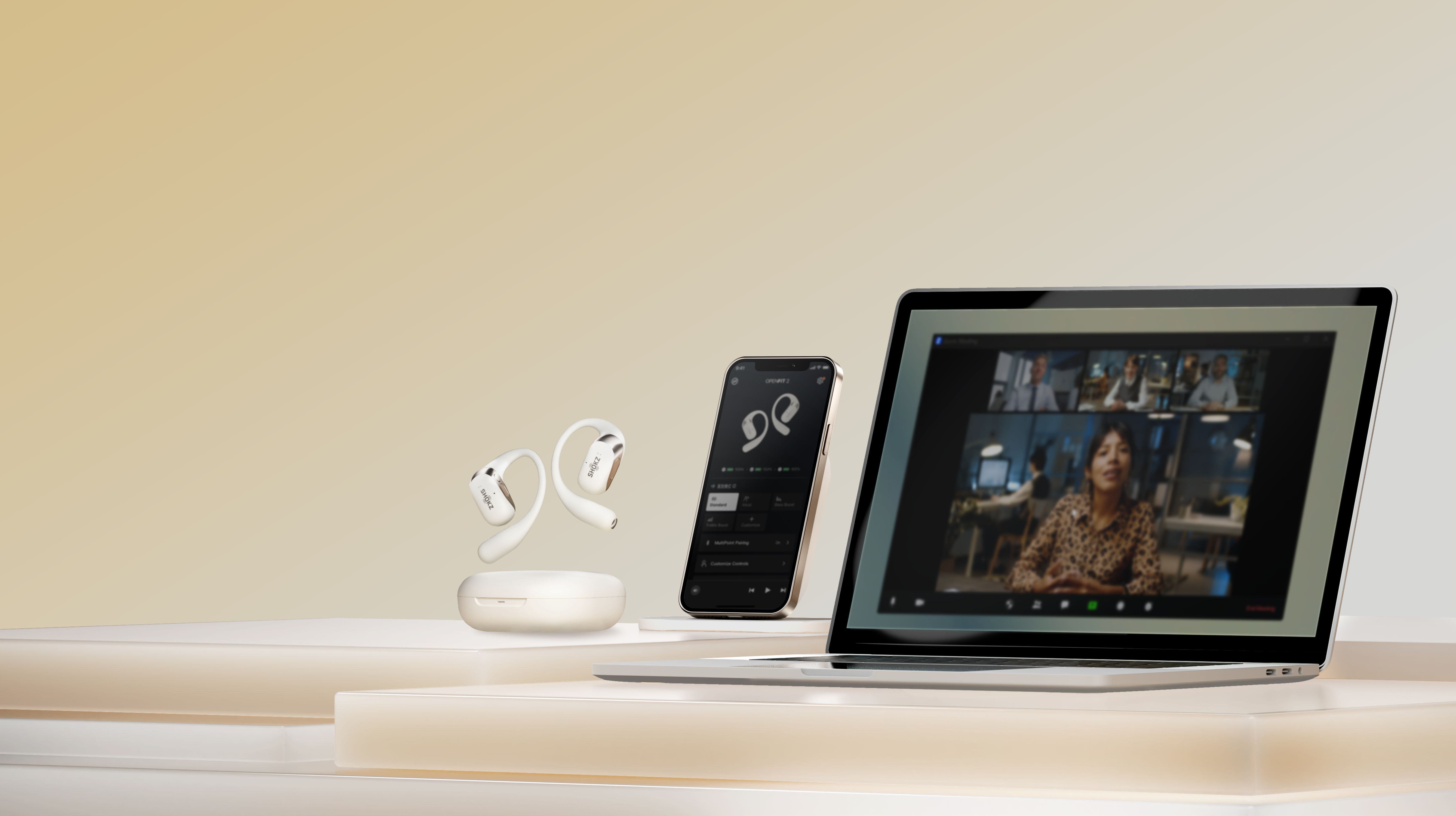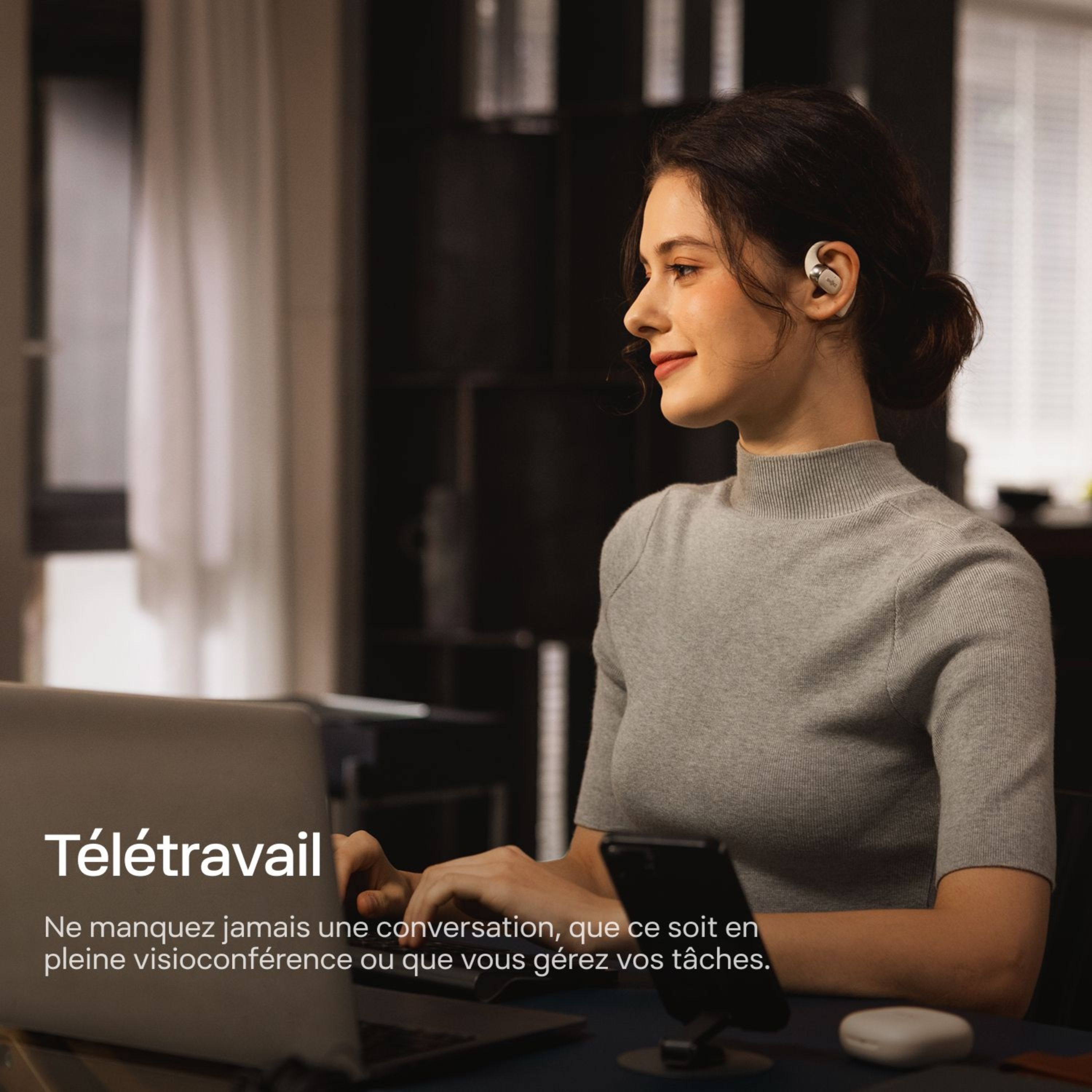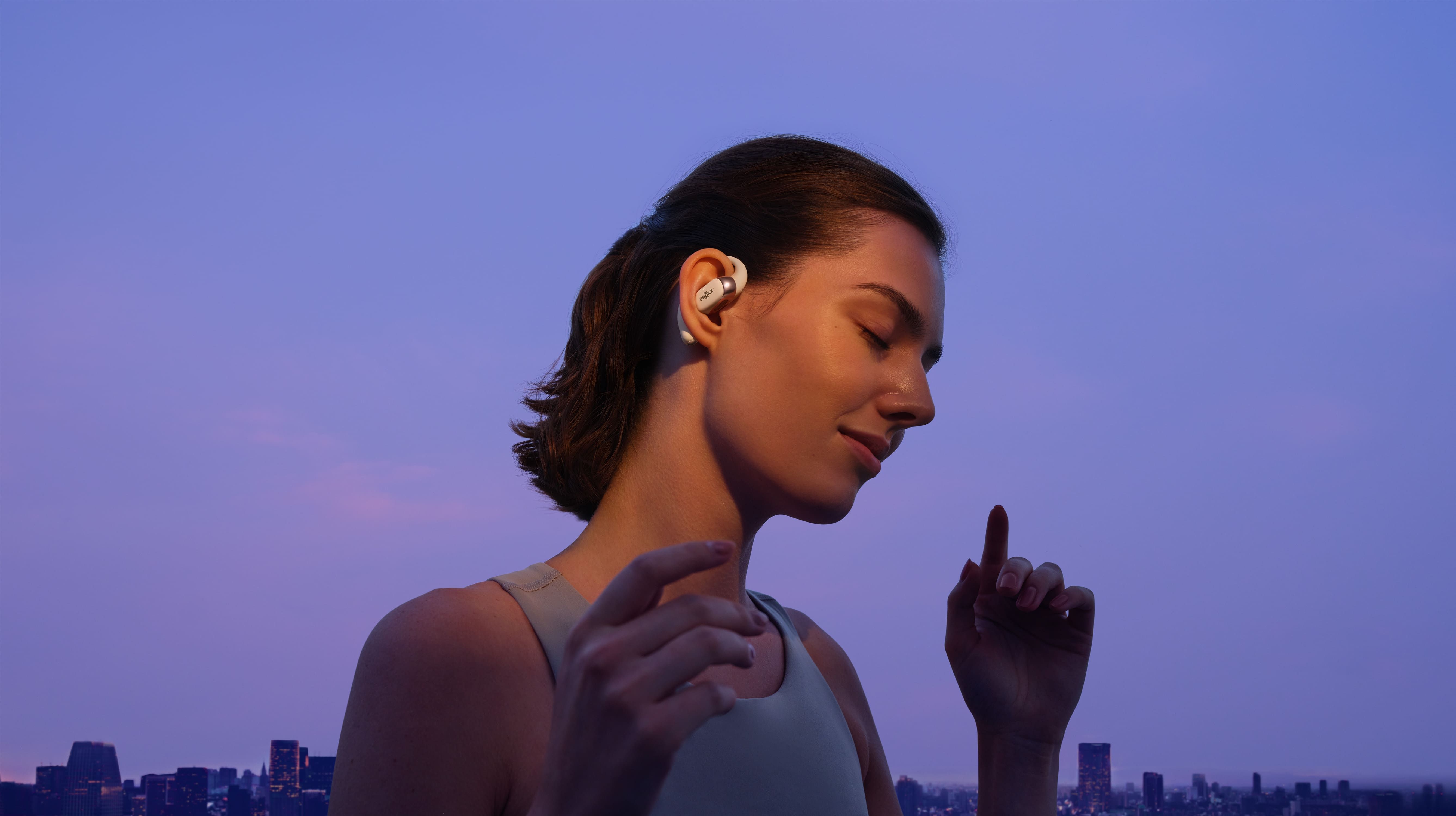 Optimisant le design et le matériau des écouteurs libres, l'OPENFIT 2 est compact et léger, ne pesant que 9,4 grammes. Les écouteurs et le compartiment de la batterie offrent un équilibre parfait qui fait oublier qu'on les porte.