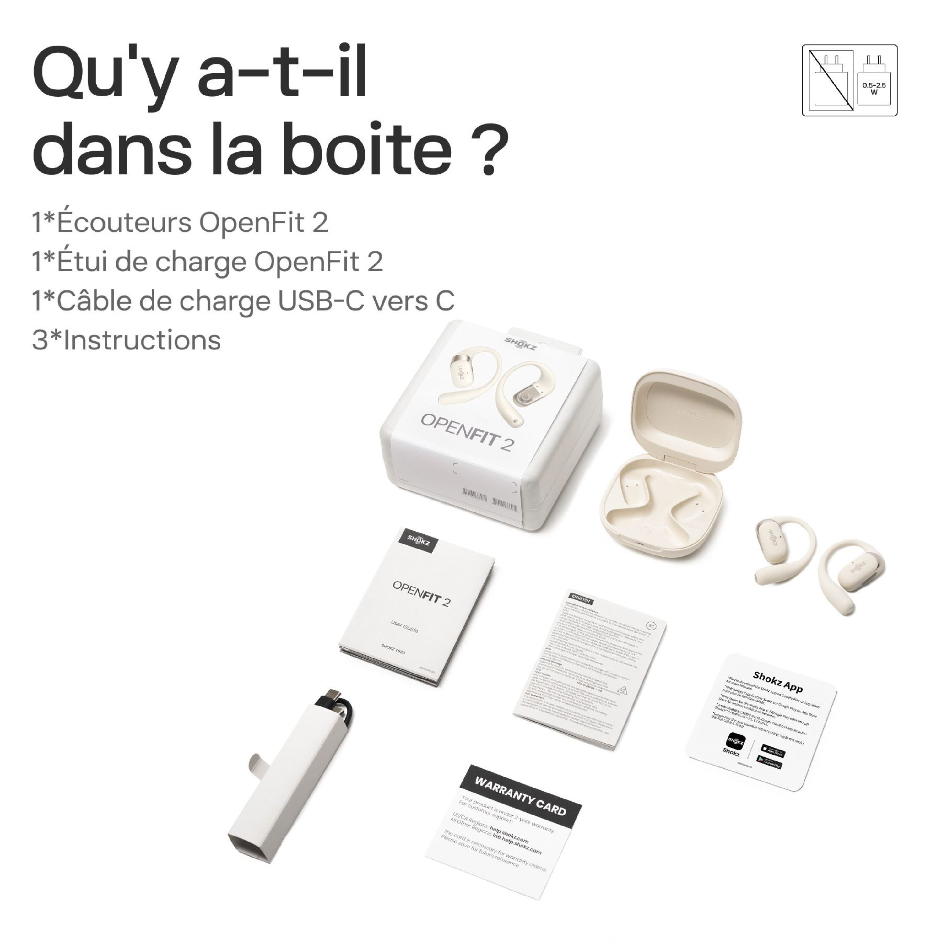 Lecture continue | OpenFit 2 : Jusqu'à 11 heures avec une seule charge OpenFit 2 avec boîte de charge : Jusqu'à 48 heures d'écoute |