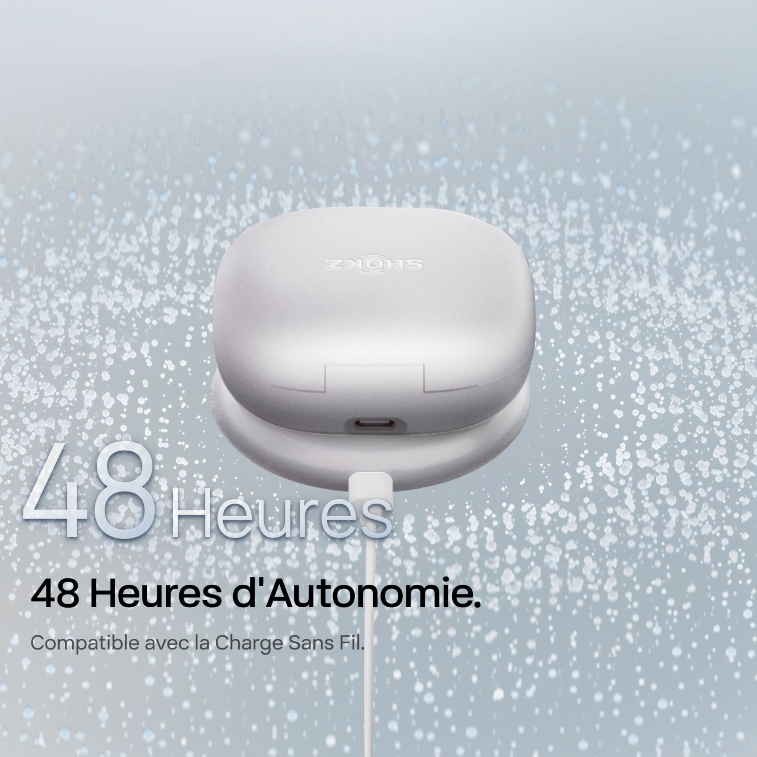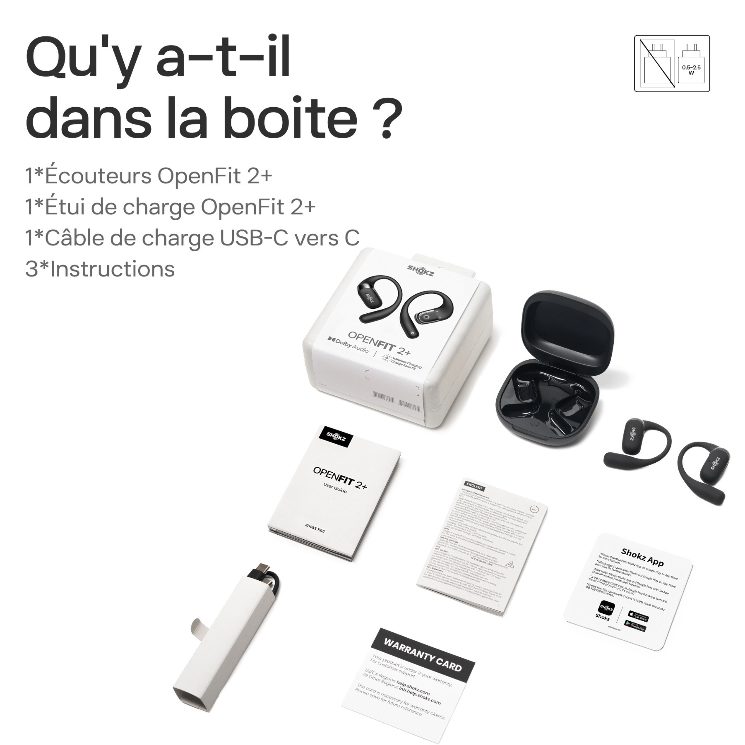 Lecture continue | OpenFit 2+ : Jusqu'à 11 heures avec une seule charge OpenFit 2+ avec boîte de charge : Jusqu'à 48 heures d'écoute |
