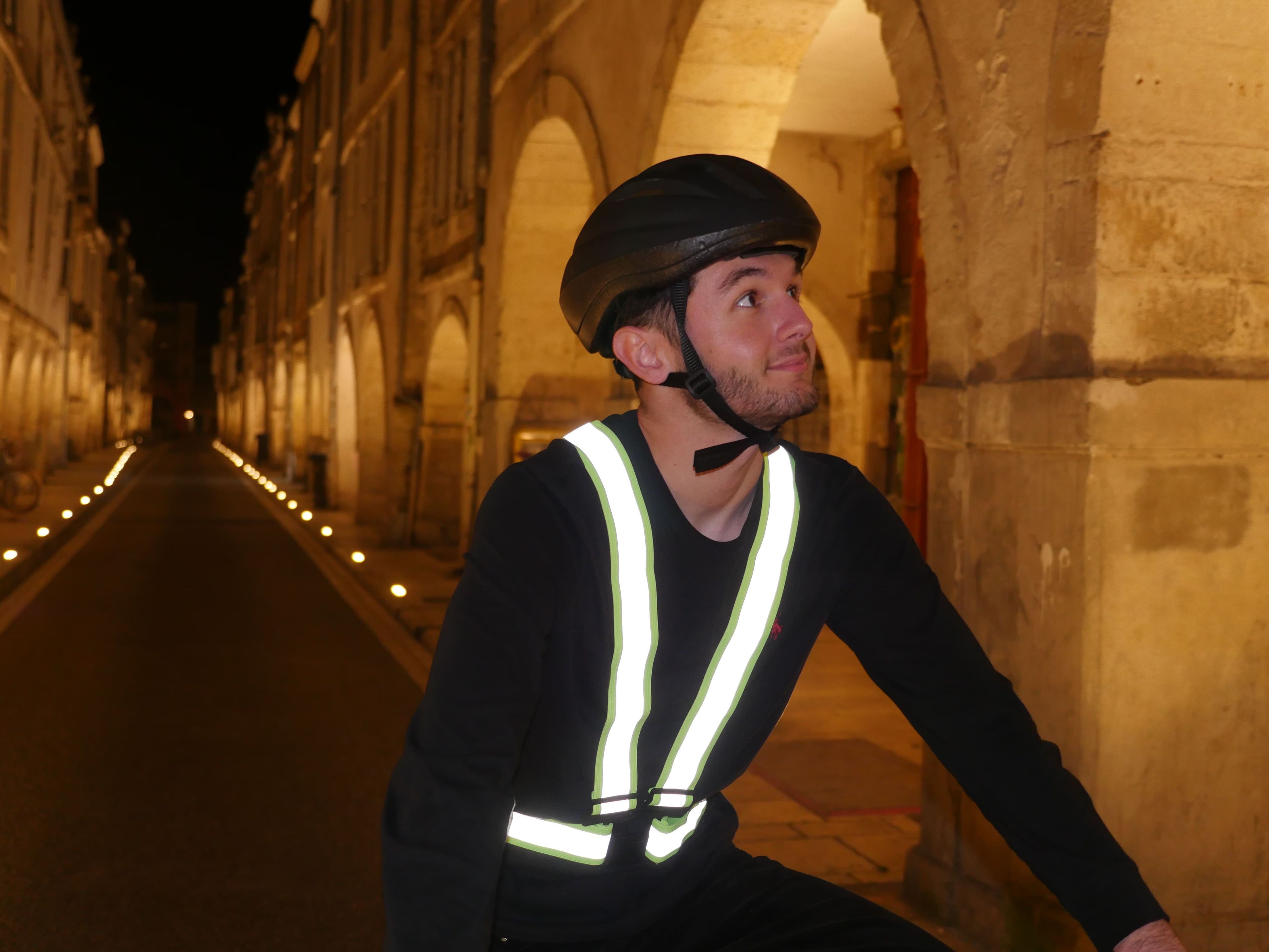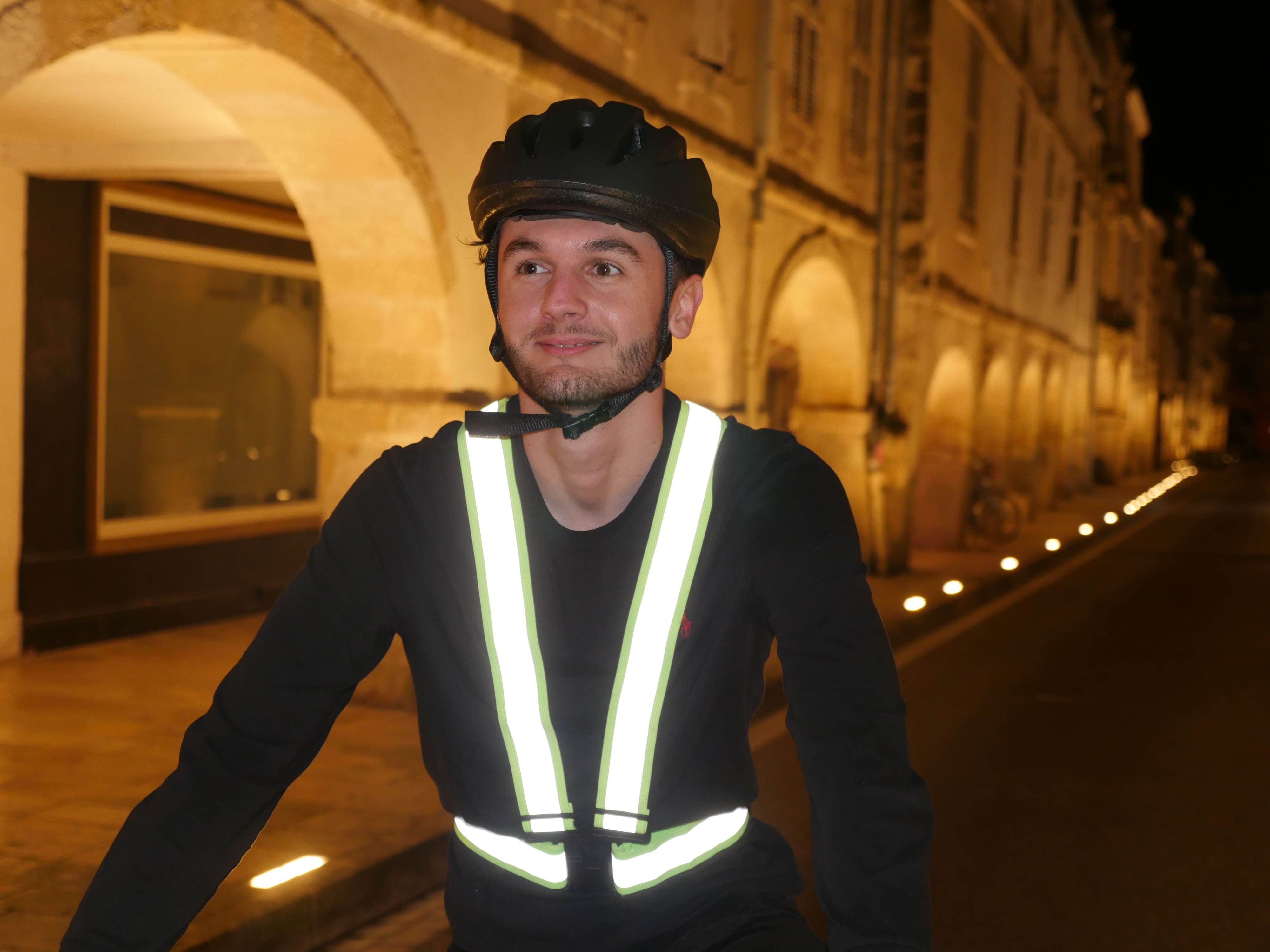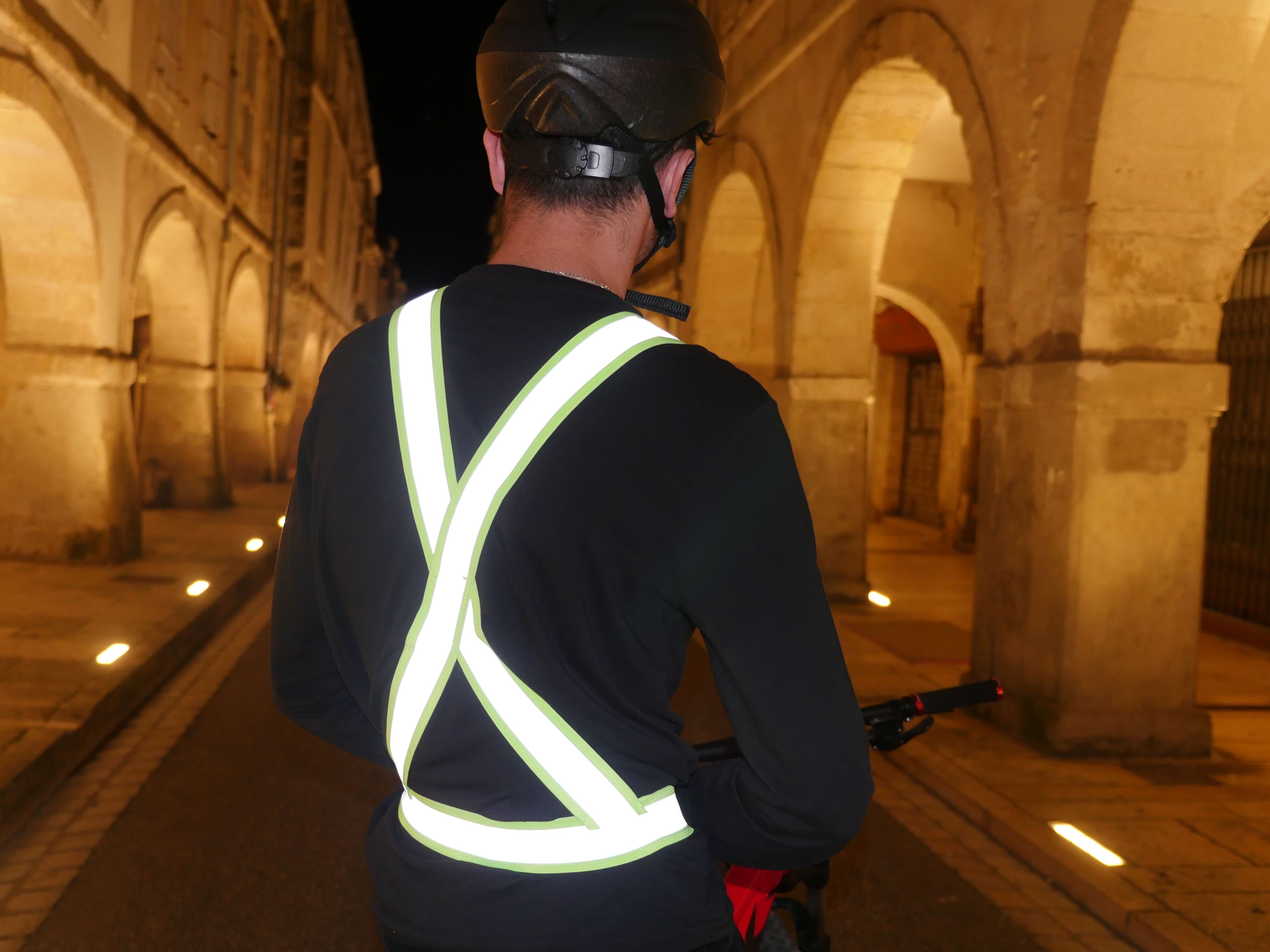 Ses bandes réfléchissantes (3 cm) réagissent à la lumière des phares et permettent d'être visible dans l'obscurité, dans les phares de véhicules ou sous des projecteurs.
