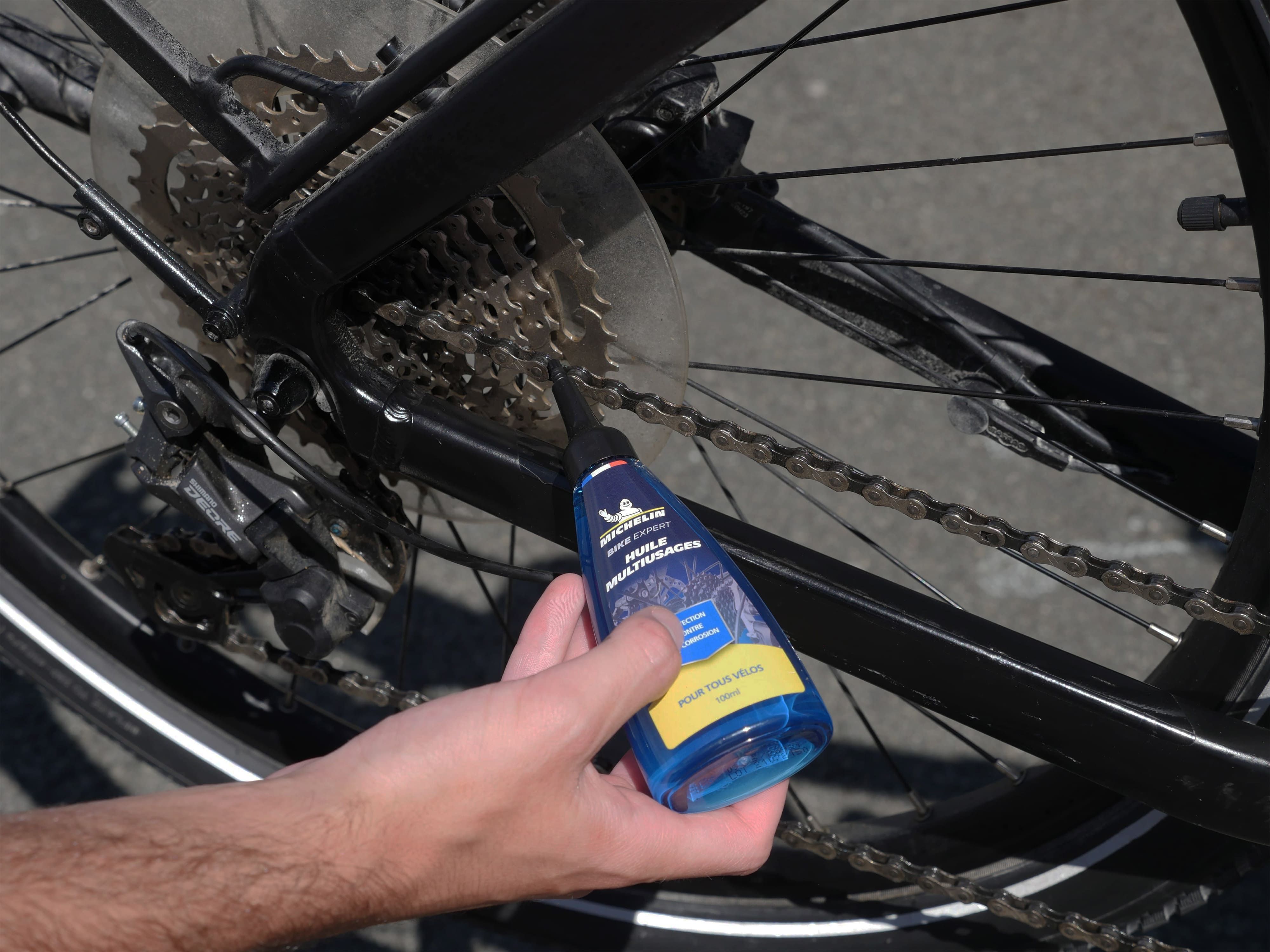 Elle lubrifie les chaînes, et les engrenages ainsi que toute les pièces mécaniques corrosives du vélo.