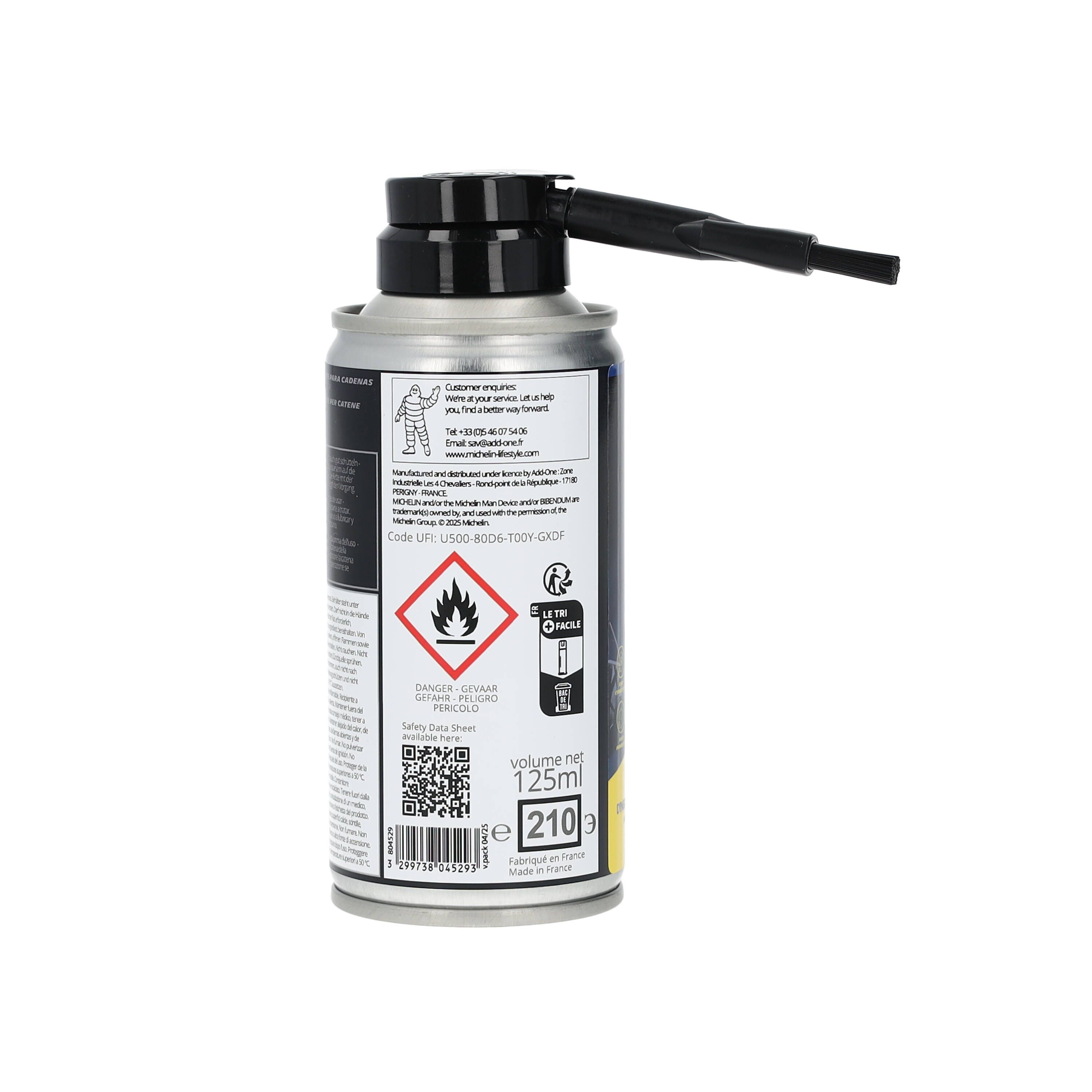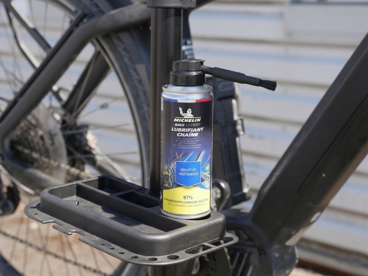 Formulé avec 97 % d'ingrédients d'origine végétale, le lubrifiant chaîne de la marque MICHELIN est conçu pour réduire les points de friction et l'usure de la chaîne.