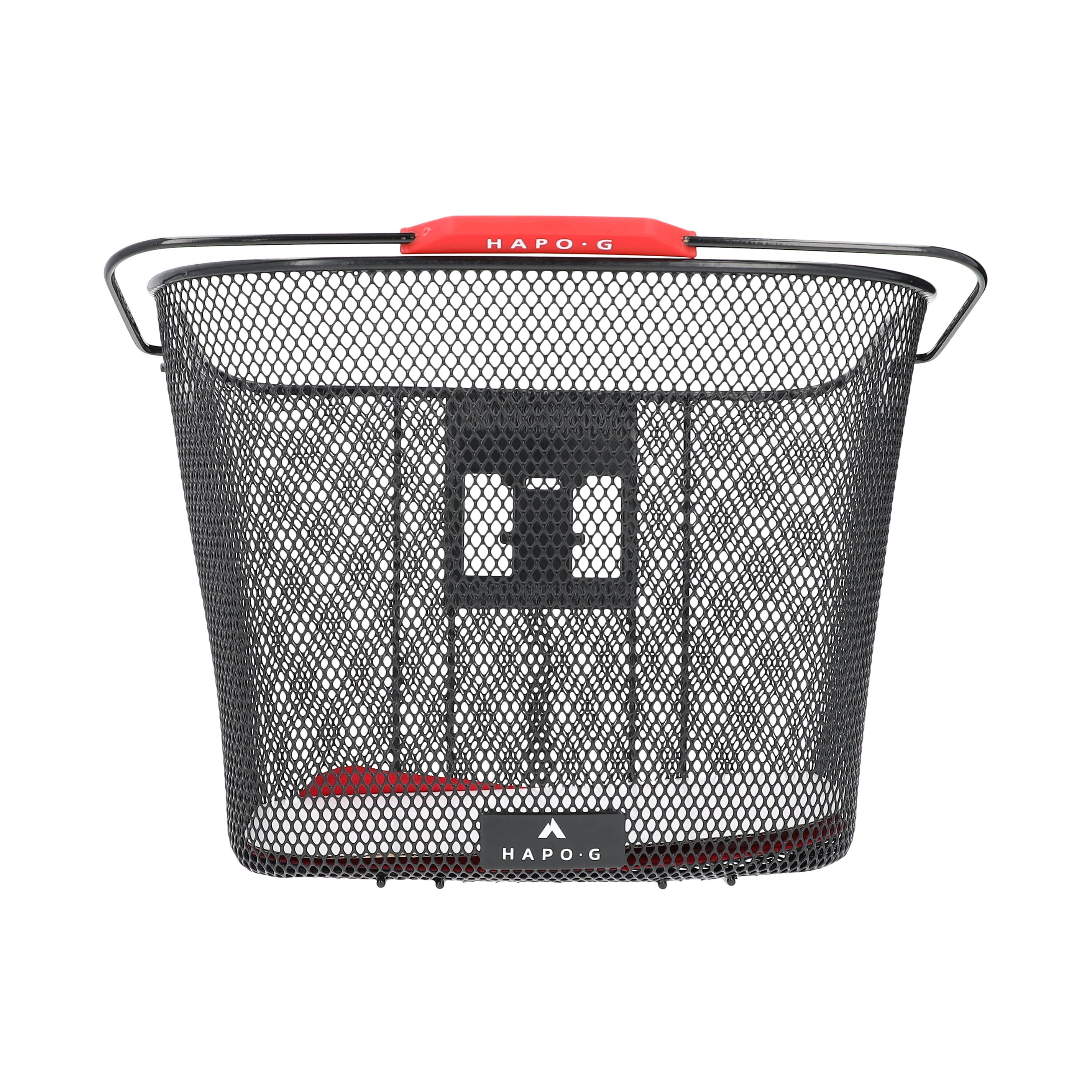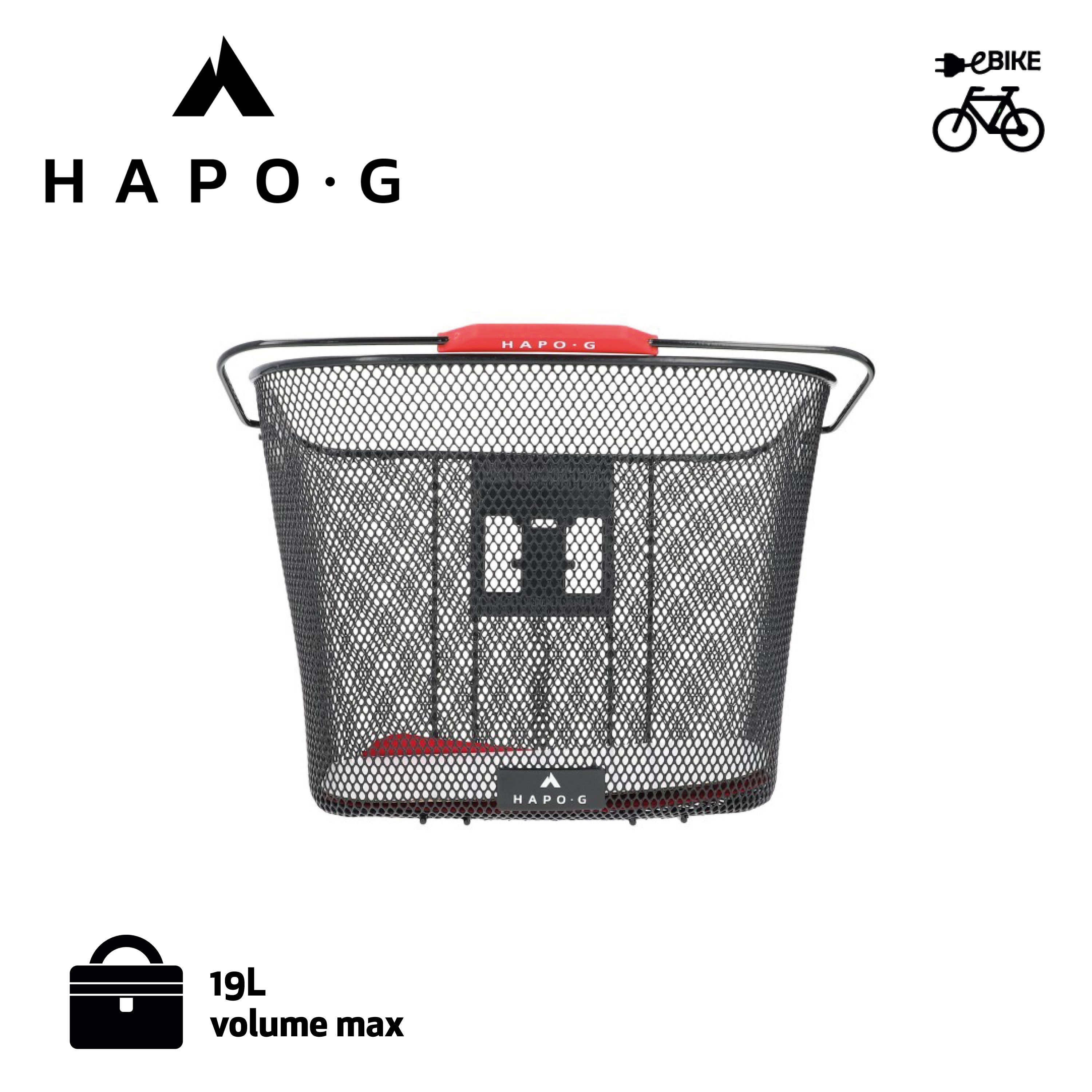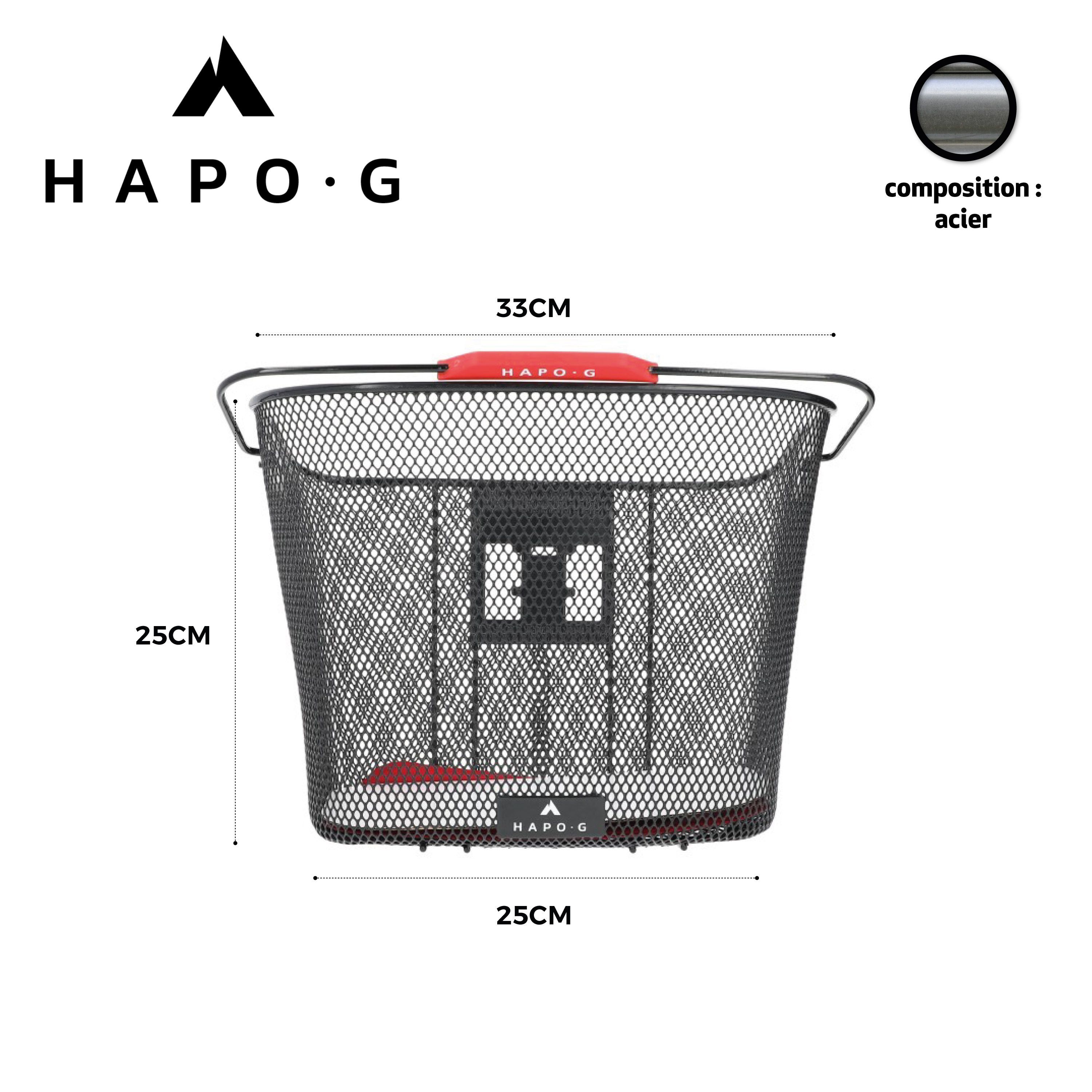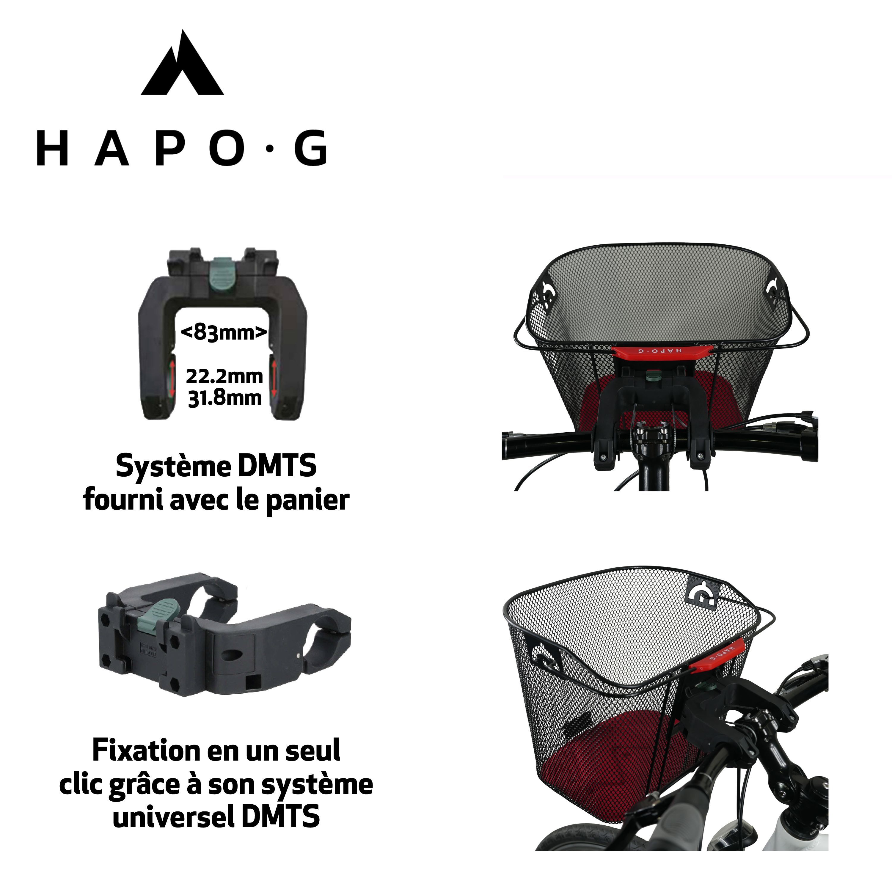 Le panier en acier noir de la marque HAPO-G se fixe sur les guidons de 22,2 à 31,8 mm de diamètre grâce à une fixation DMTS universelle.