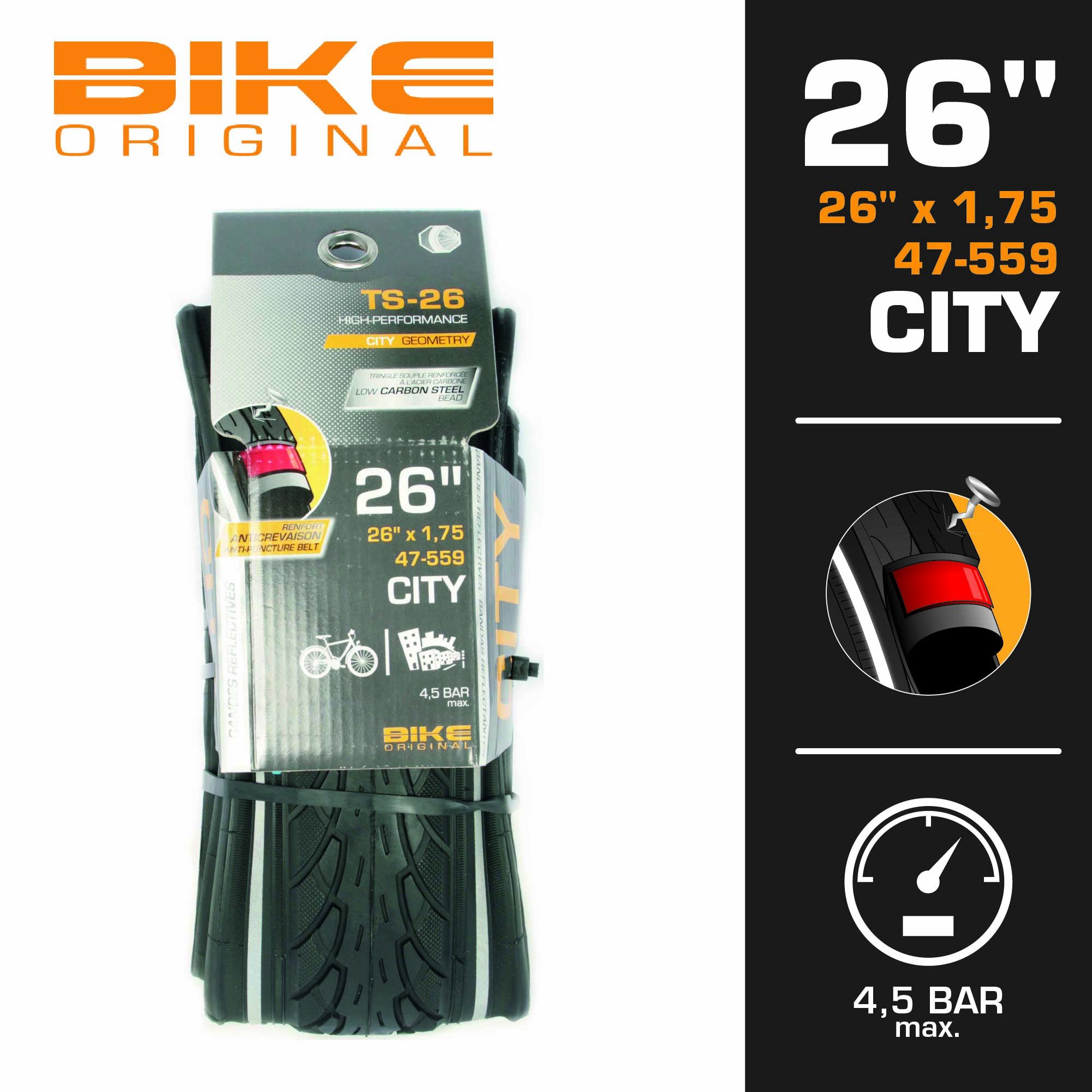 Le pneu City BIKE ORIGINAL 26x1.75 est conçu pour les vélos adultes 26 pouces aux roues de dimensions ETRTO 47-559.
