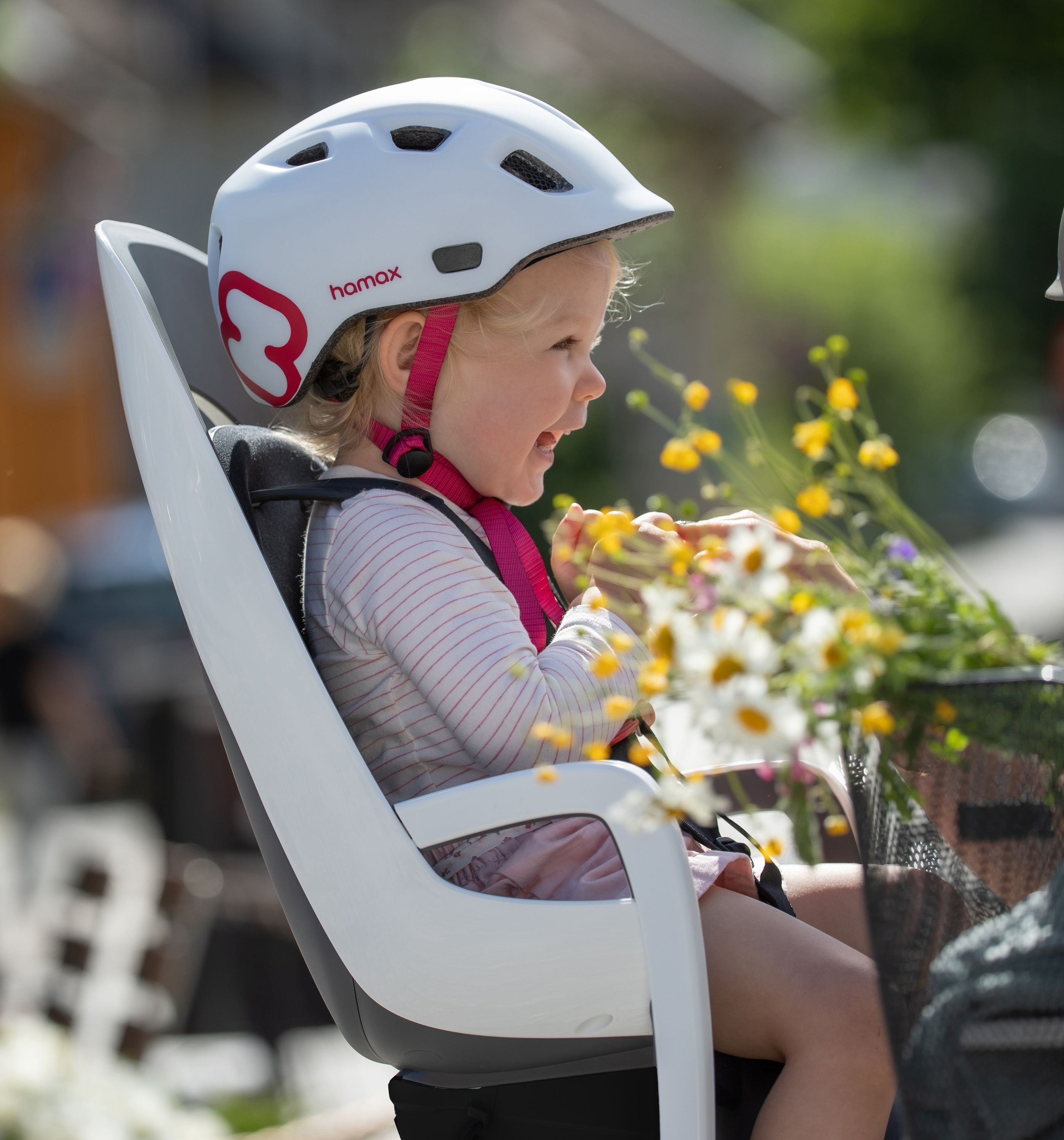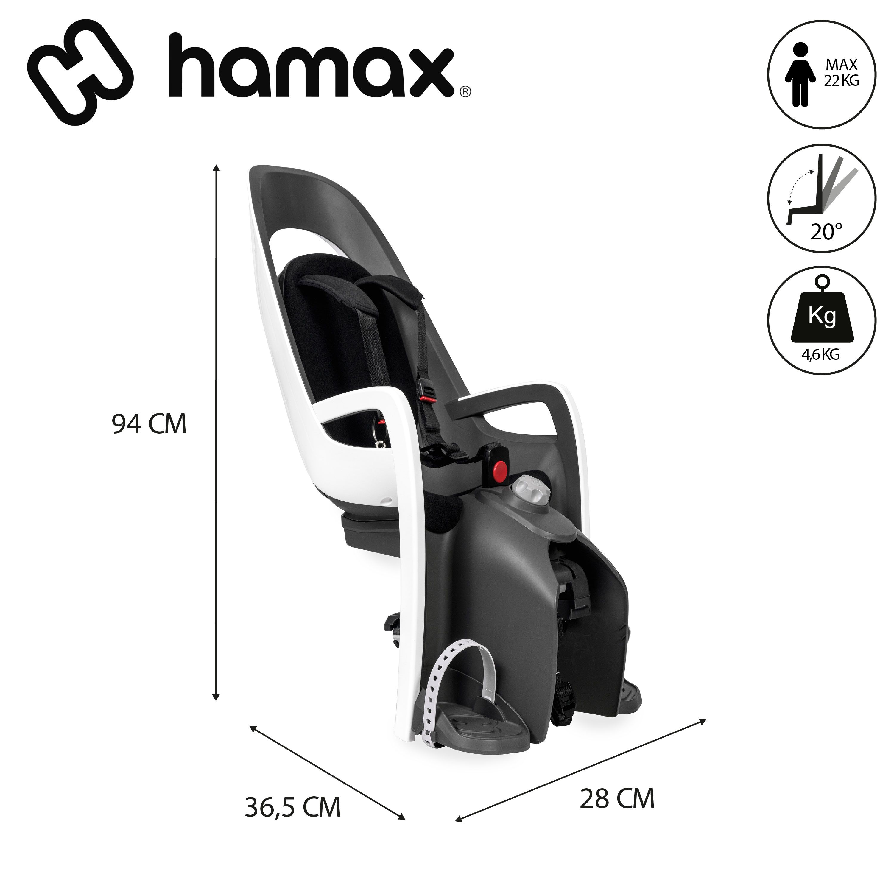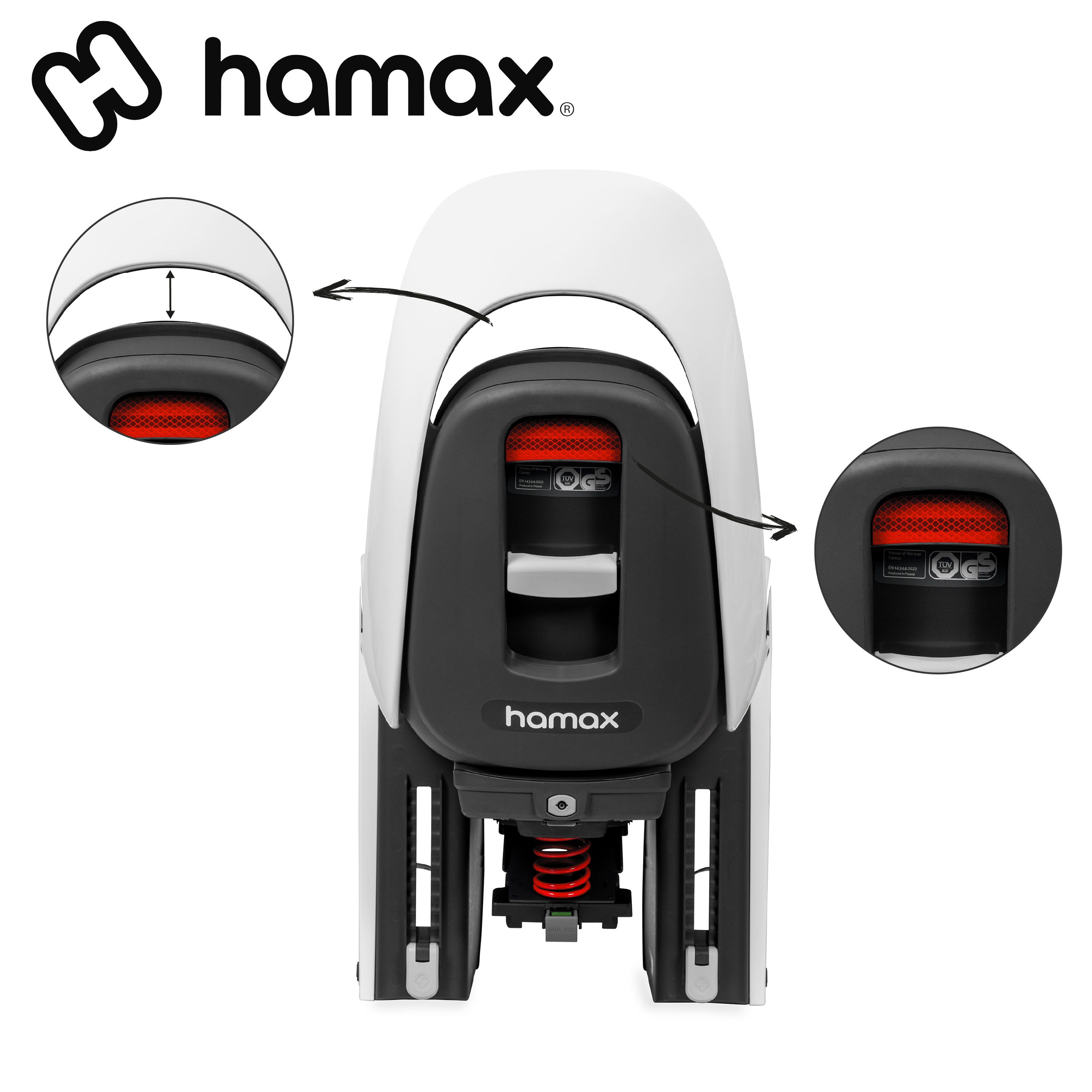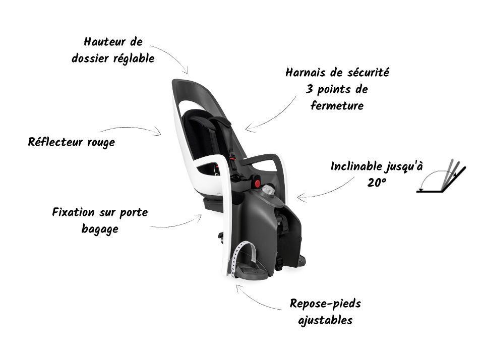 Les caractéristiques du porte-bébé HAMAX CARESS Blanc à fixation sur porte-bagage :