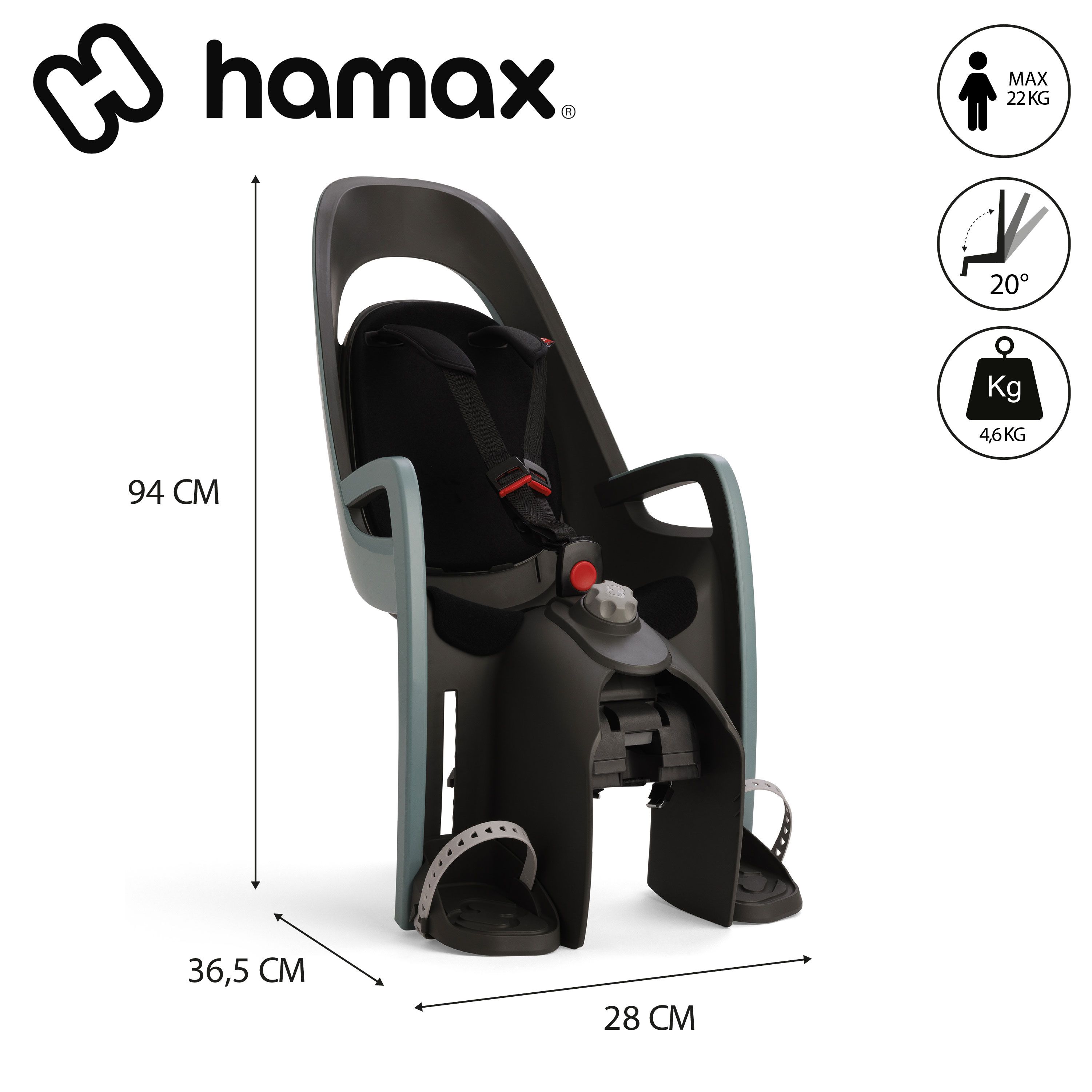 Les caractéristiques du porte-bébé HAMAX CARESS Noir/Vert à fixation sur porte-bagages :