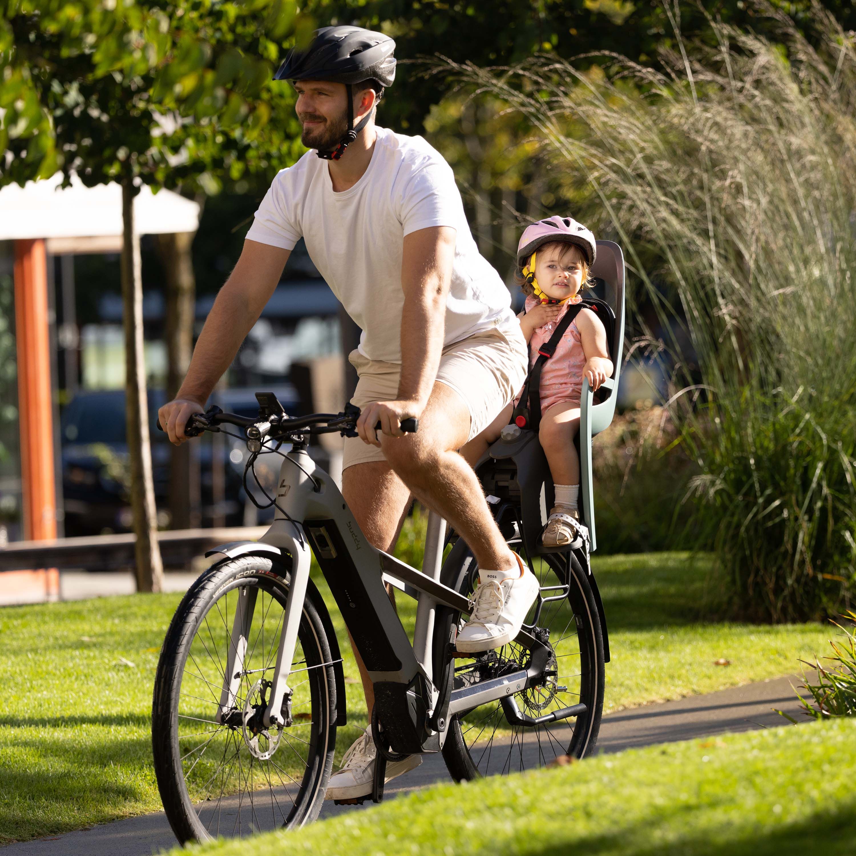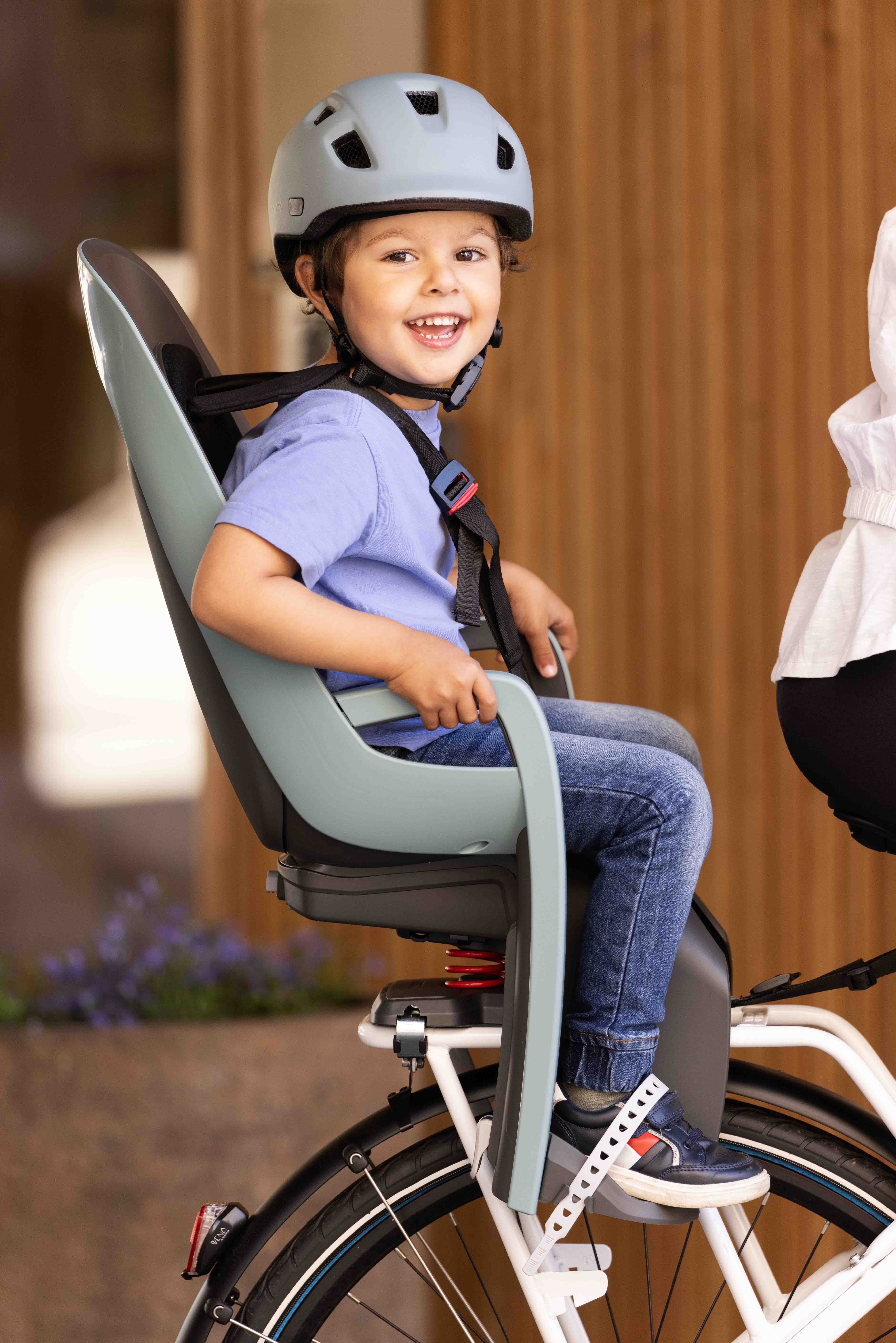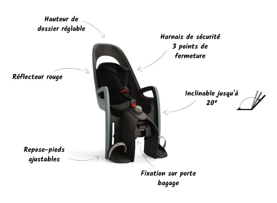 Le porte-bébé haut de gamme Caress de la marque HAMAX est destiné à être fixé au porte-bagages du vélo grâce à un support de fixation qui s'emboite sur le porte-bagages.