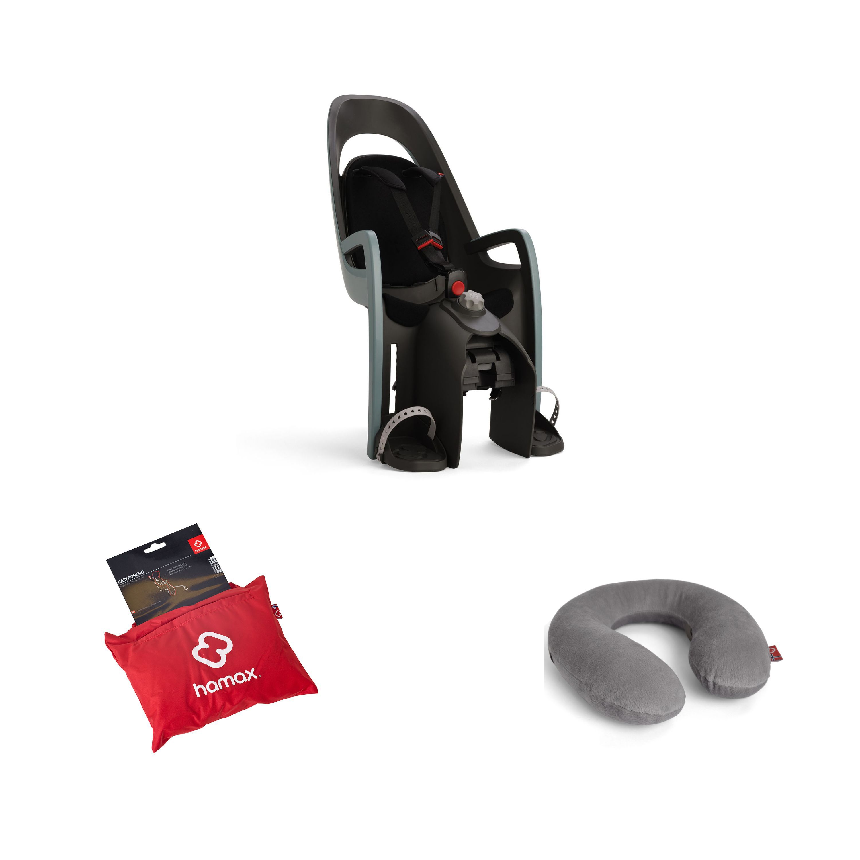 Lot promotionnel Hamax, composé du porte‑bébé haut de gamme Caress Vert/Noir fixation porte-bagages, d’un oreiller cervical pour un confort optimal, et d’un poncho pluie imperméable conçu pour protéger l’enfant lors des trajets.
