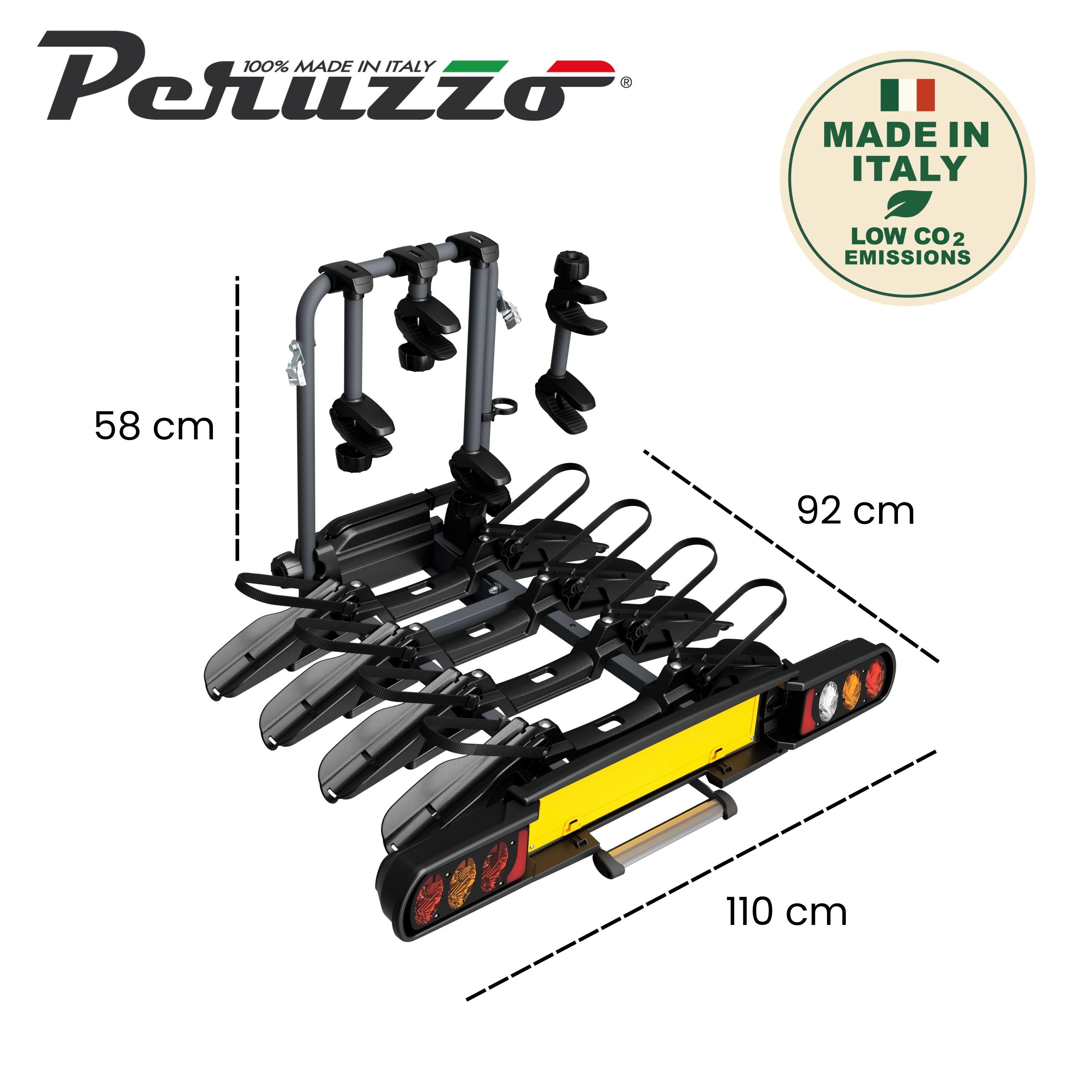 Le porte-vélo universel sur attelage PURE INSTINCT de la marque PERUZZO vous permettra de transporter jusqu’à 4 vélos (60kg maximum). Le porte-vélo peut transporter des Fat Bike. Chaque vélo est maintenu par un bras. Il y a un câble antivol à clé fourni. Ce porte-vélo est inclinable grâce à une pédale permettant d’accéder au coffre très facilement sans avoir à tout démonter. Livré entièrement assemblé, il se plie ce qui permet un rangement simple et rapide.