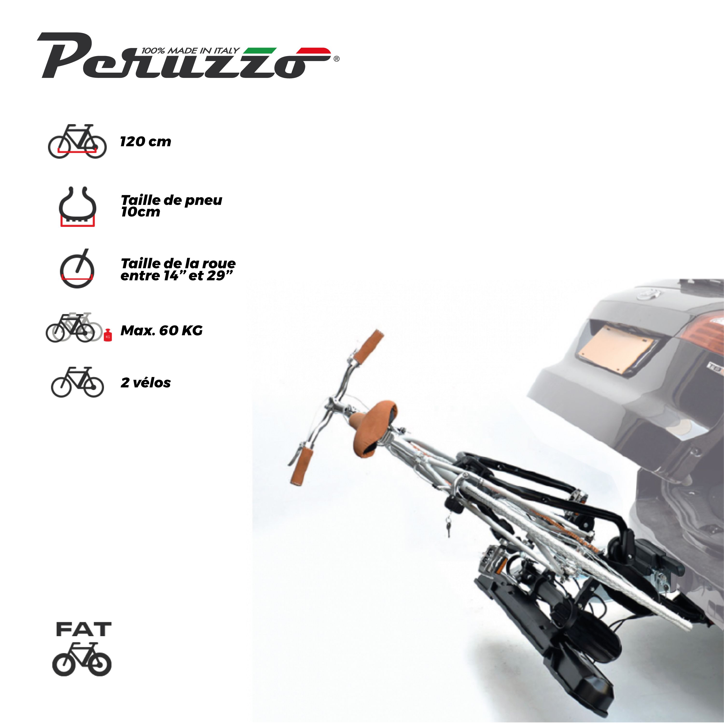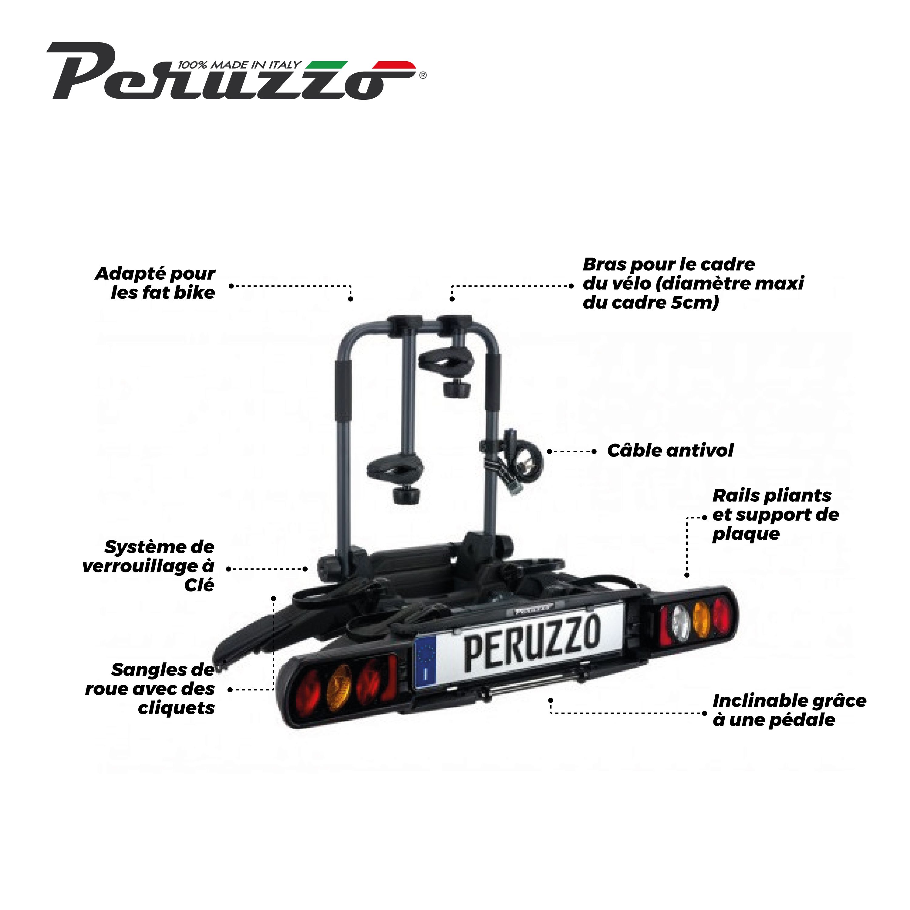 Le porte-vélo universel sur attelage PURE INSTINCT de la marque PERUZZO vous permet de transporter jusqu’à 2 vélos (60kg maximum). Le porte-vélo peut transporter des vélos électriques ainsi que des Fat Bike. Chaque vélo est maintenu par un bras. Il y a un câble antivol à clé fourni. Ce porte-vélo est inclinable grâce à une pédale permettant d’accéder au coffre très facilement sans avoir à tout démonter. Livré entièrement assemblé, il se plie ce qui permet un rangement simple et rapide.