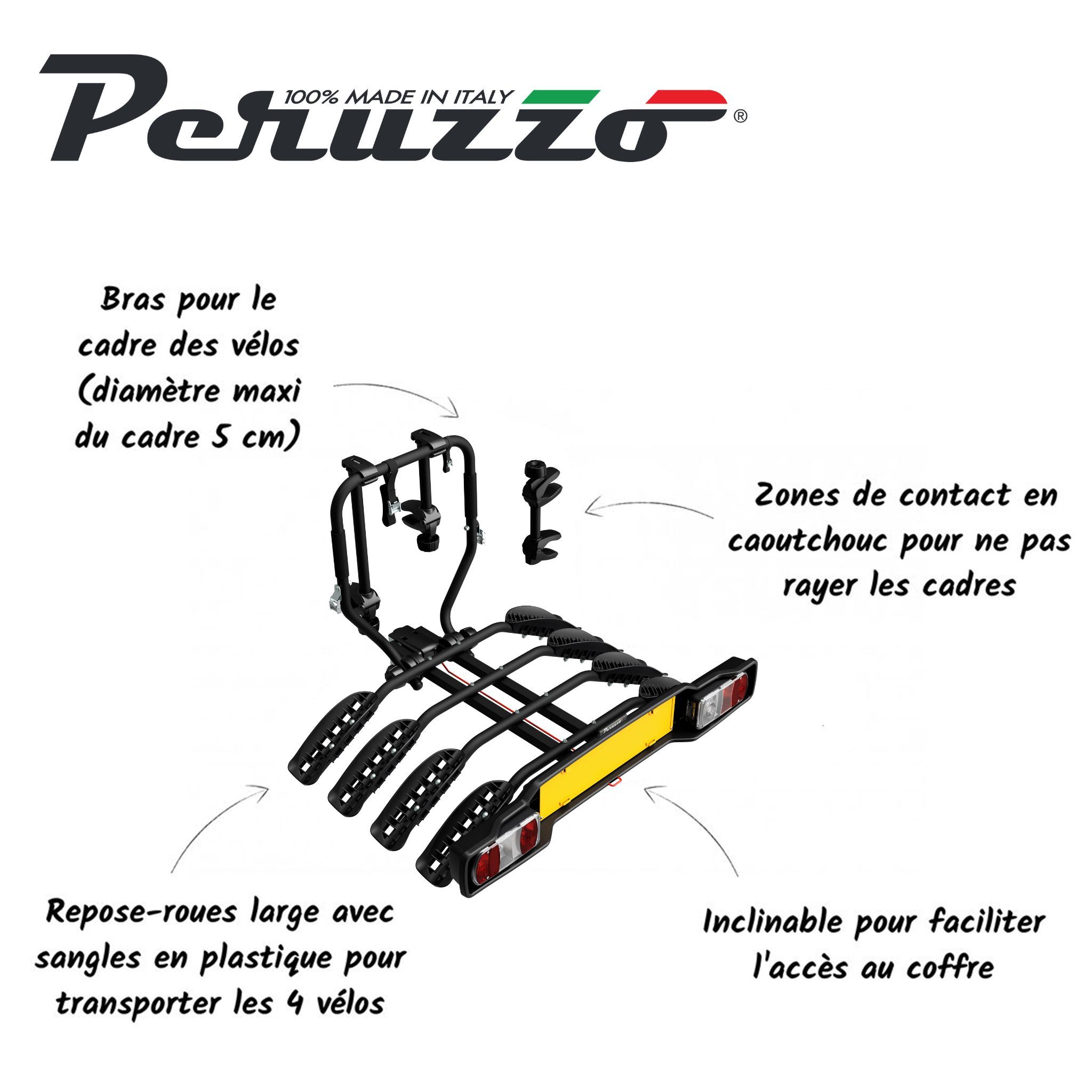 Le porte-vélo inclinable sur attelage SIENA noir de la marque PERUZZO est très simple d'installation et d'utilisation. Il est composé d'un système anti-rayures pour ne pas abîmer les vélos. Ce porte-vélo, équipé de trois bras, permet de transporter 4 vélos (60kg maximum) en toute sécurité. Parfaitement maintenus, les vélos sont fixés par les roues (sur le rail) et sur le cadre. Ce modèle est inclinable et permet d'accéder au coffre du véhicule facilement.