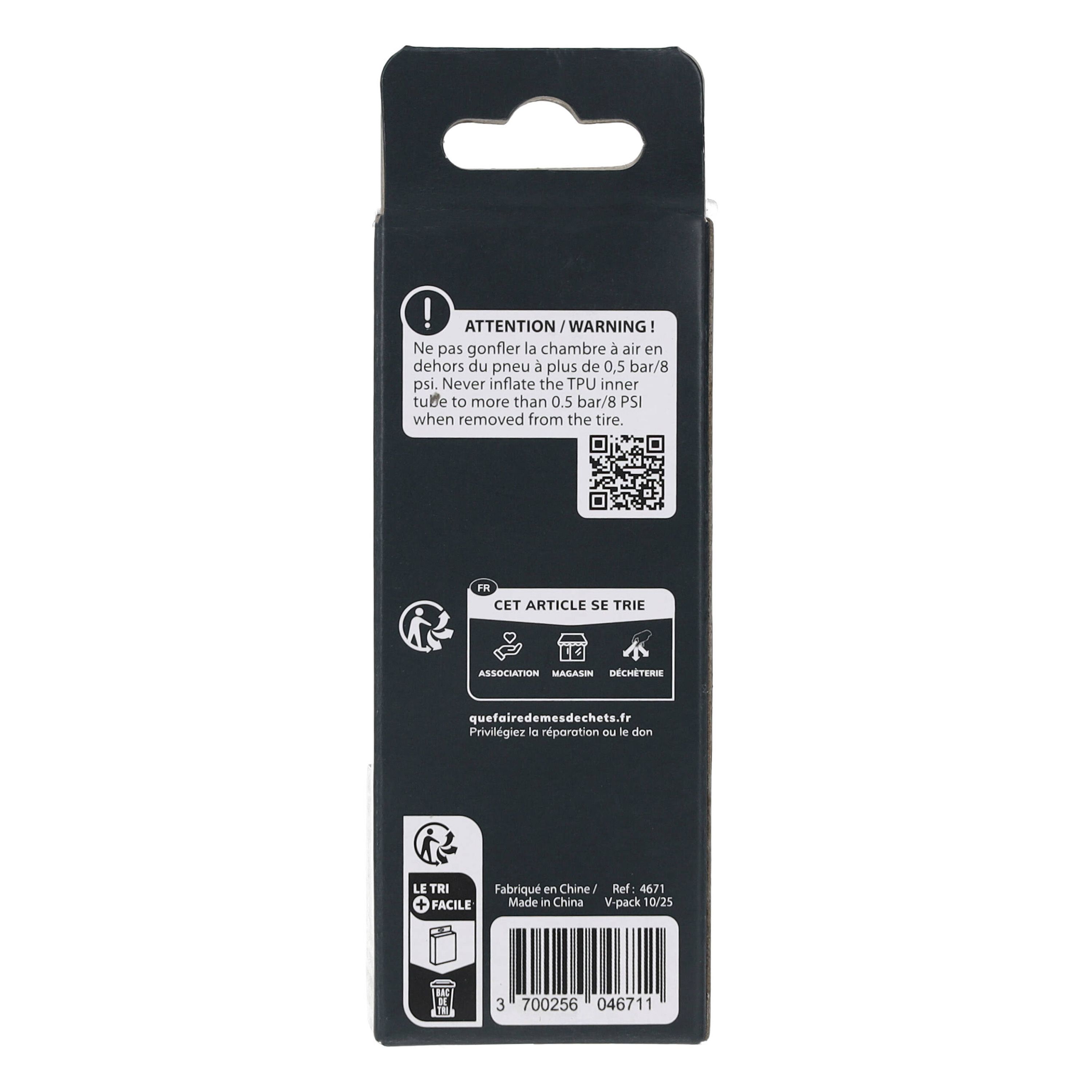 Attention ! Ne pas gonfler la chambre à air TPU à plus de 0,5 bar/8 PSI lorsqu'elle en dehors du pneu.