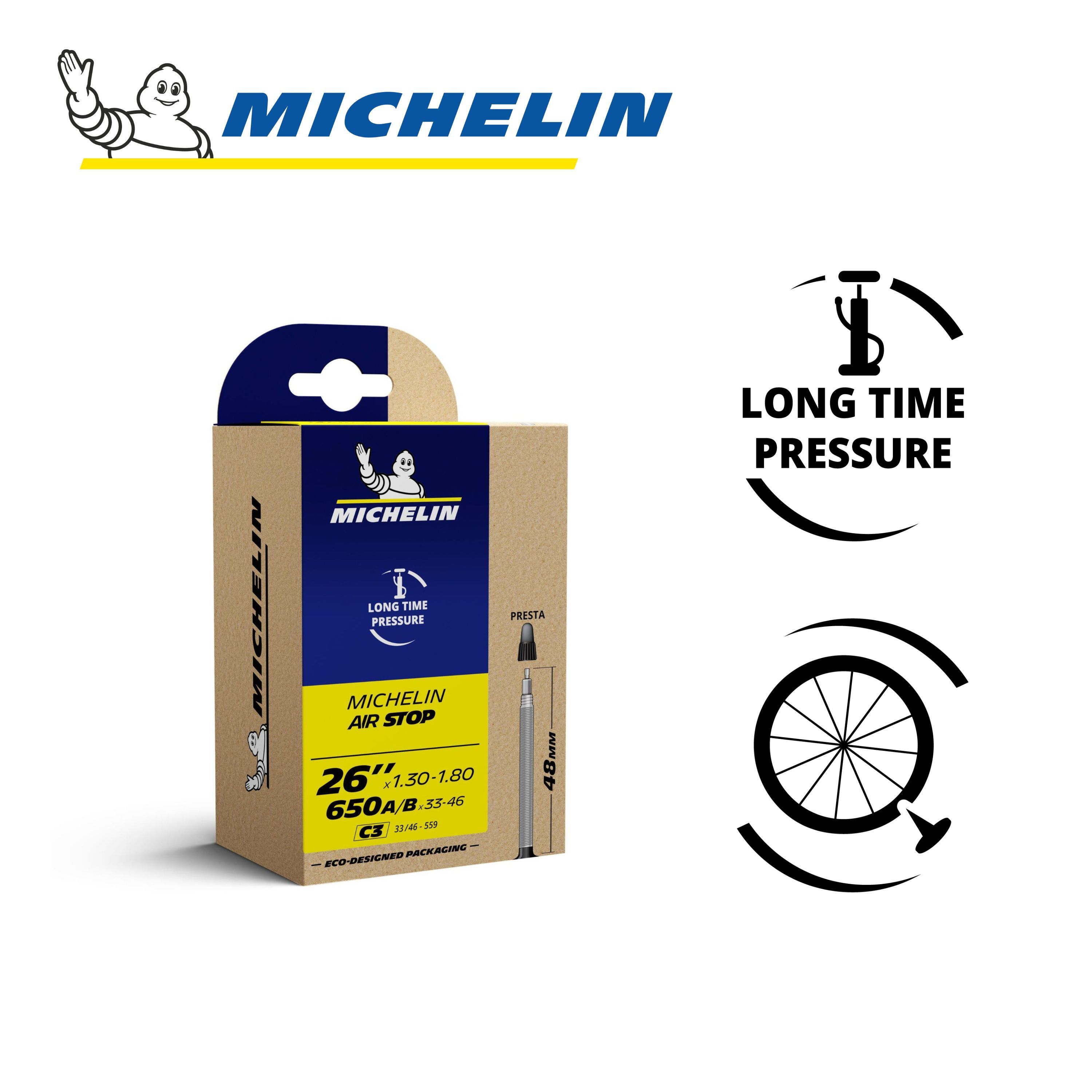 La chambre à air MICHELIN C3 AIRSTOP 650A/B x 33-46 ou 26"x 1.30-1.80 33/46x559 PR 48mm, référence CAI 264535 de la marque, gamme Access Line, offre un bon maintien de la pression grâce au butyl et une bonne résistance aux crevaisons. C'est un standard du marché avec un excellent rapport Qualité/Prix.