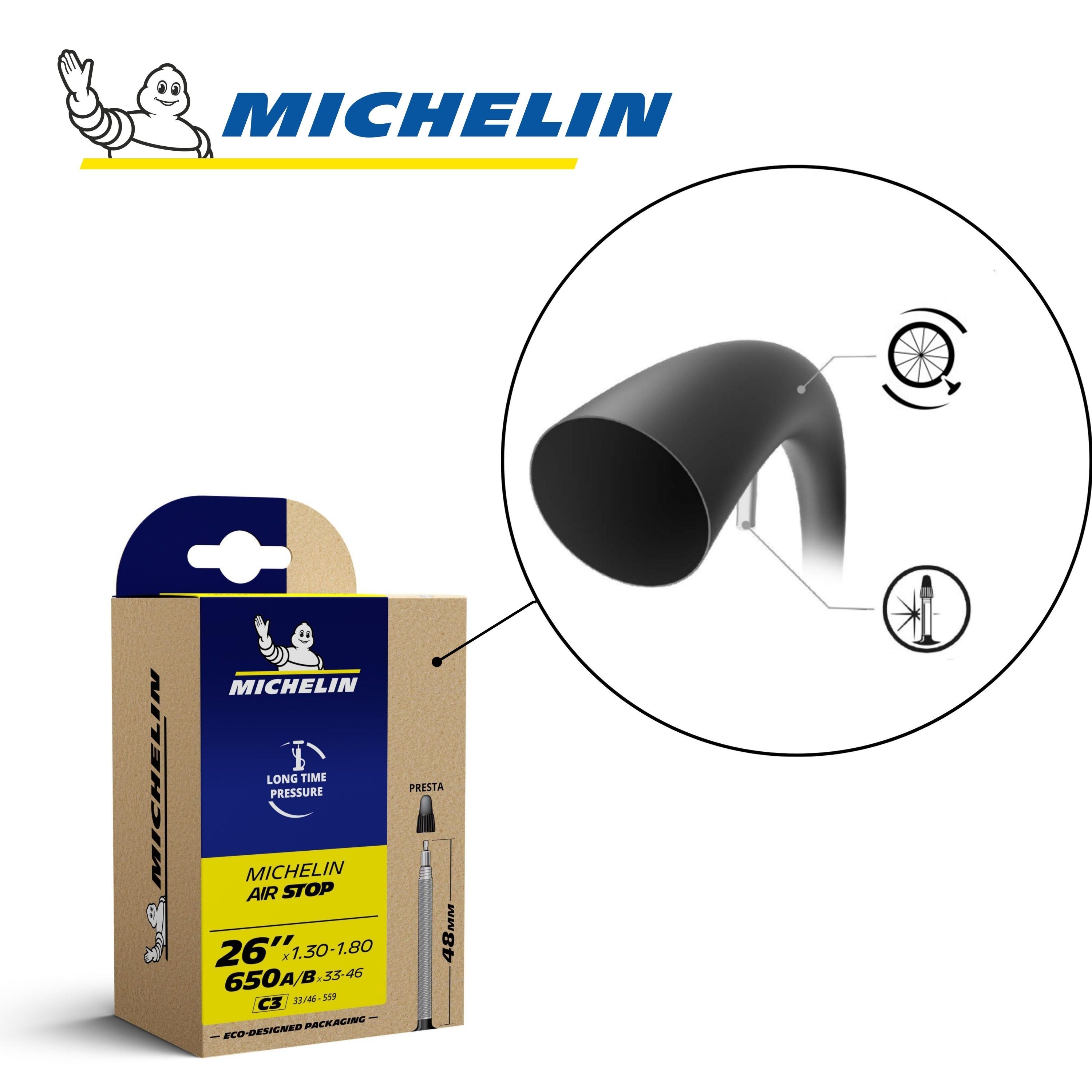 Les caractéristiques de la chambre à air MICHELIN C3 AIRSTOP 650A/B x 33-46 ou 26"x1.30-1.80 33/46x559 PR48 mm: