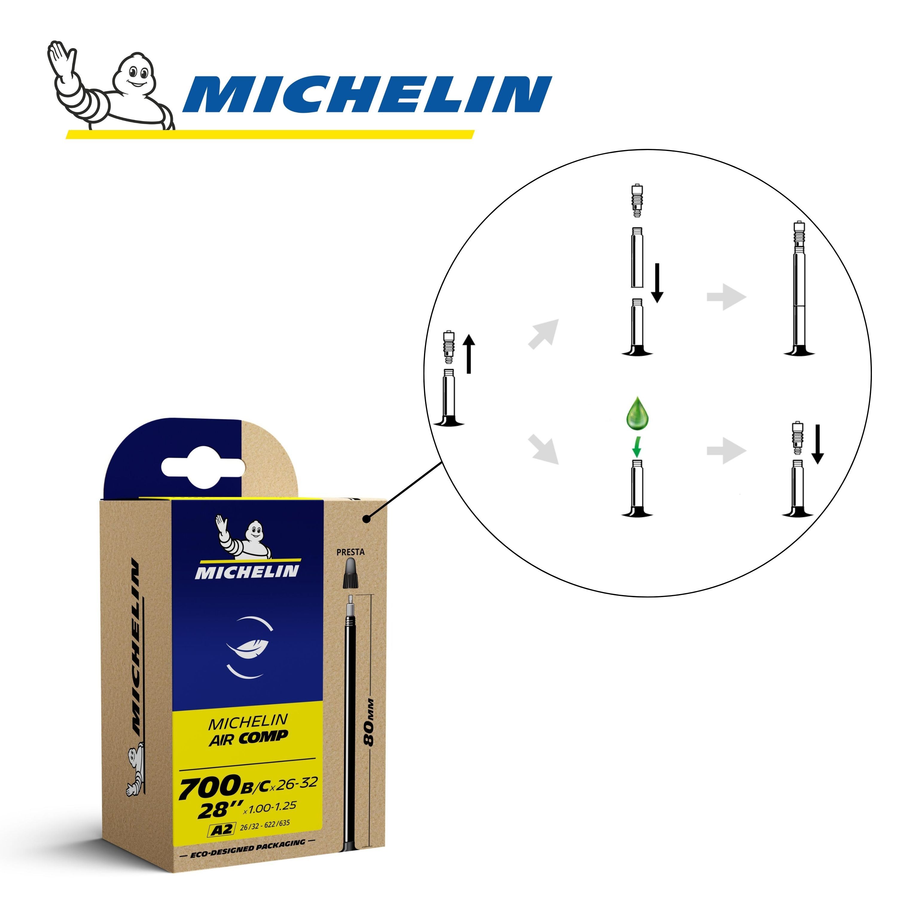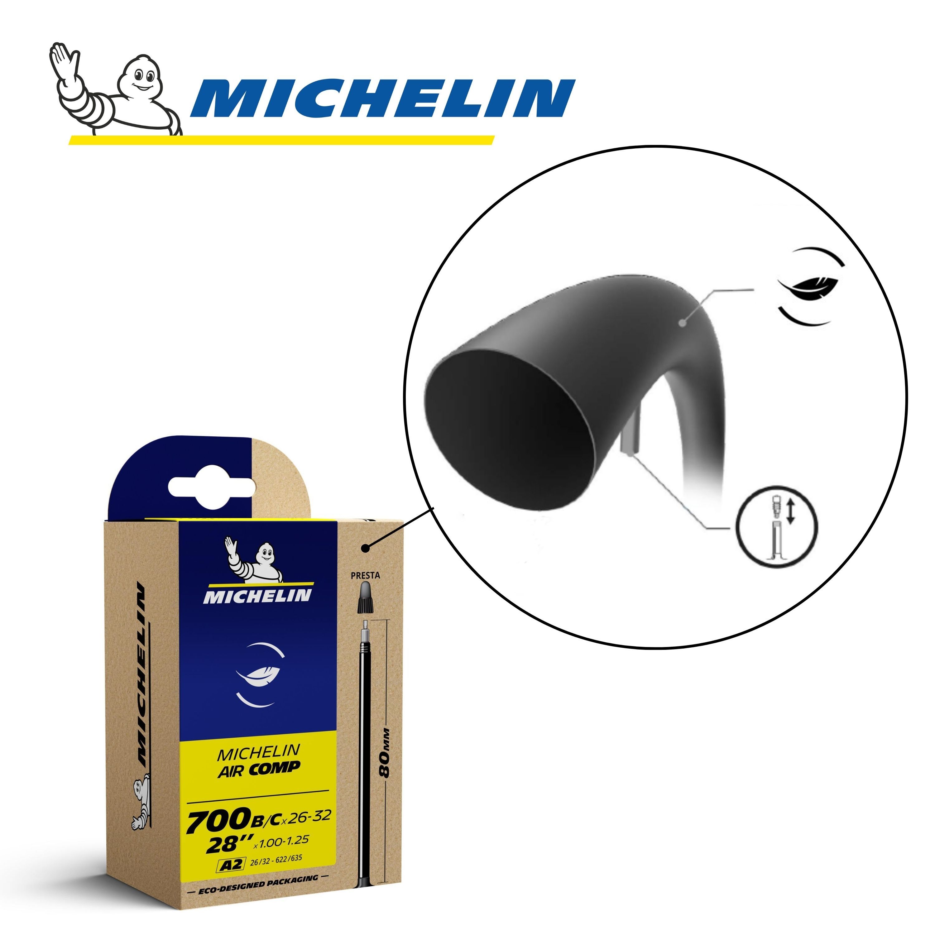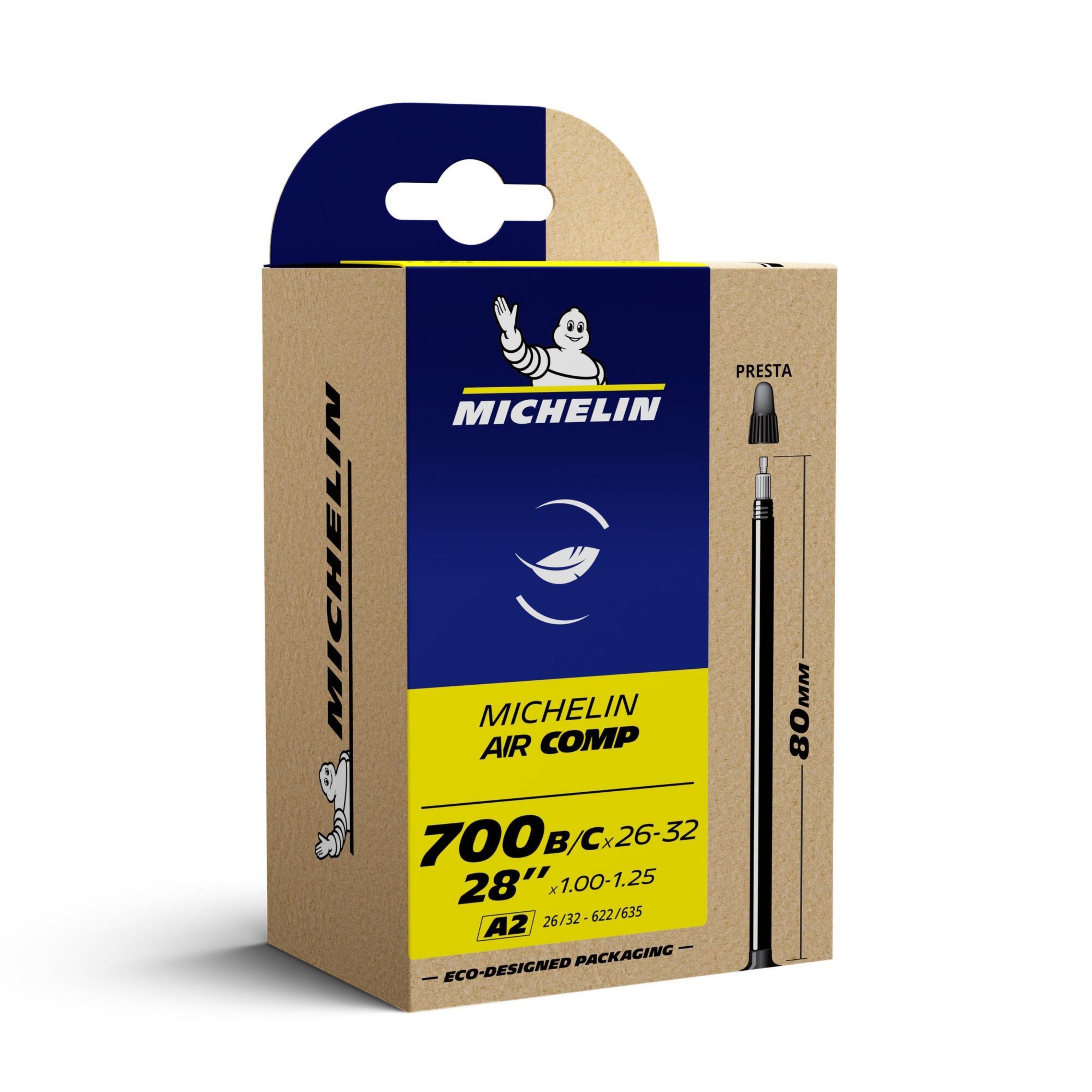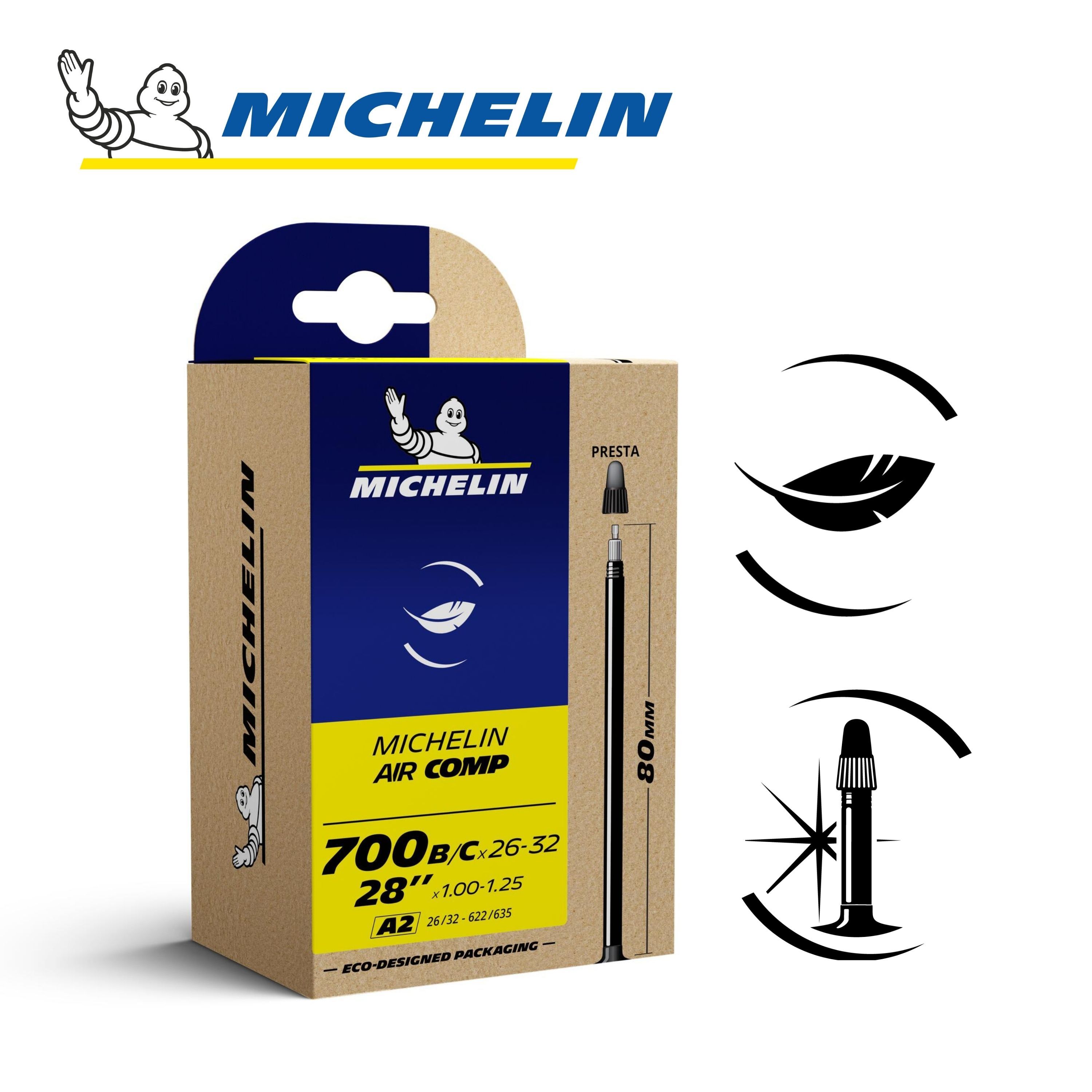 La chambre à air MICHELIN A2 AIRCOMP 700B/C x 26-32 ou 28" x 1.00-1.25 26/32x622/635 PR 80 mm , référence CAI 383729 de la marque, gamme Compétition Line, est la plus légère (25% plus légère qu'une chambre à air AIRSTOP). Elle donne des ailes pour la compétition!