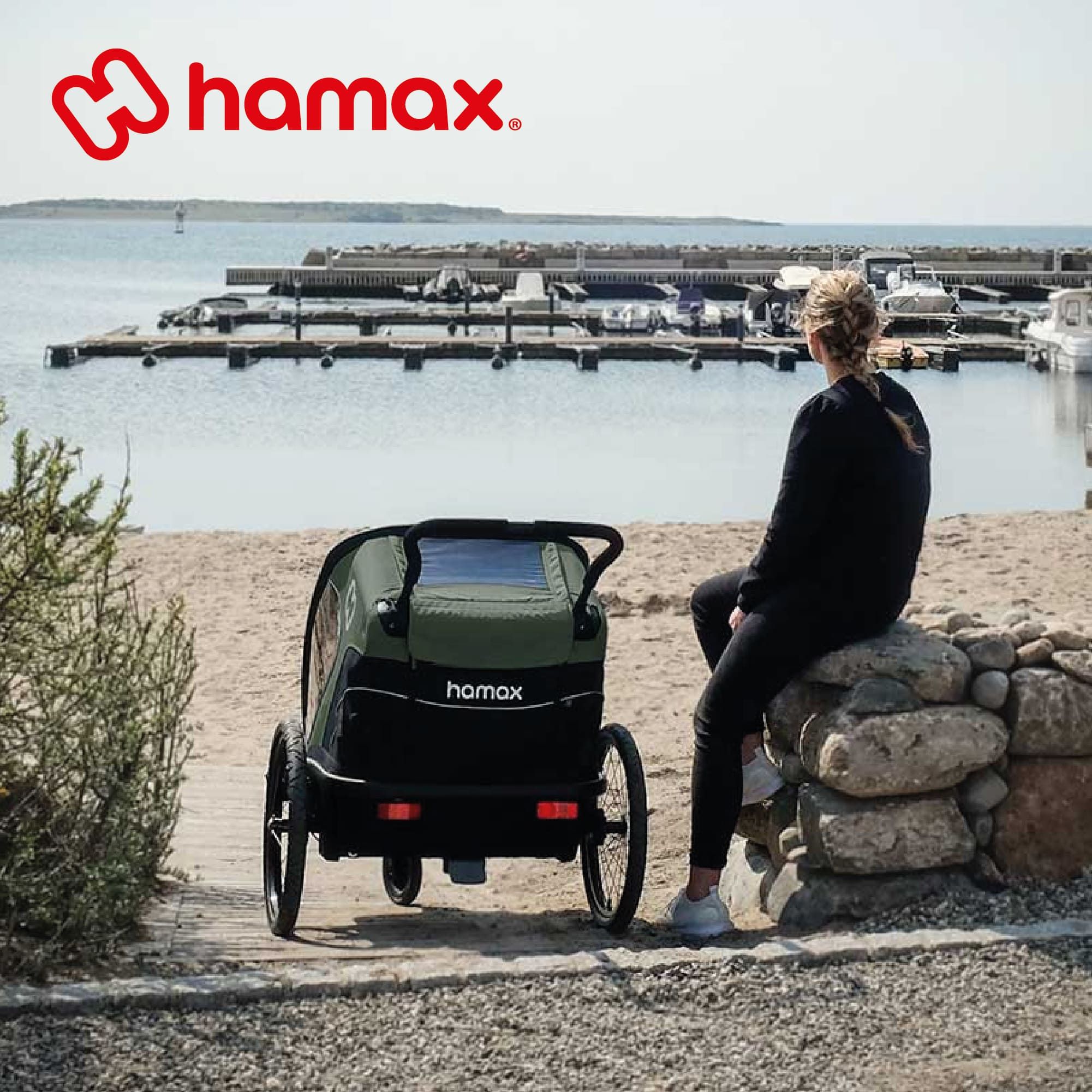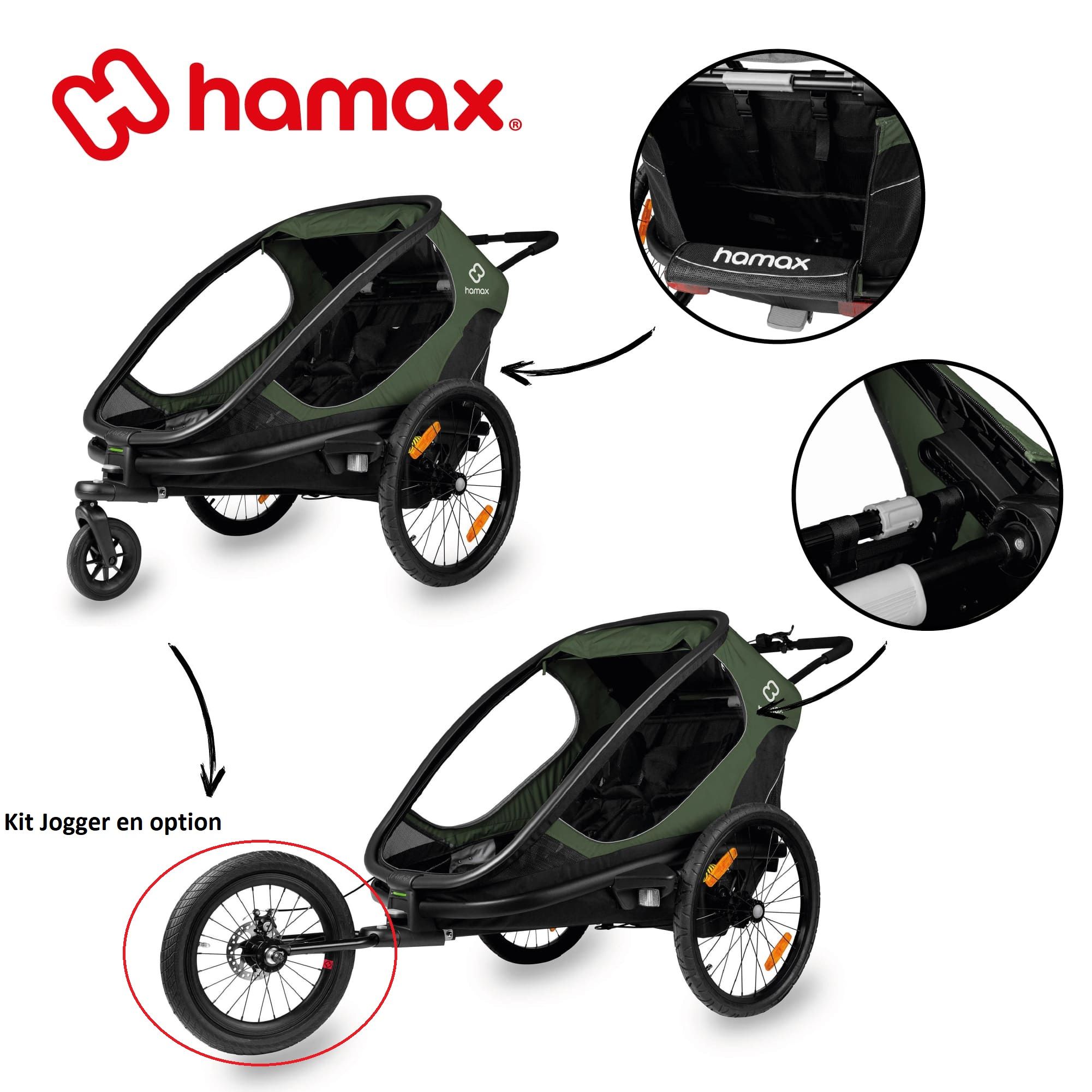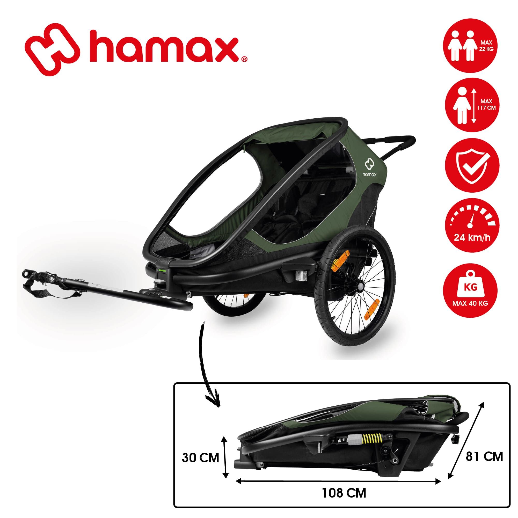 Spacieuse et ultra-confortable, la remorque OUTBACK de la marque HAMAX permet aux enfants d'être protégés lors de balades à vélo, vélo électrique ou de randonnées.