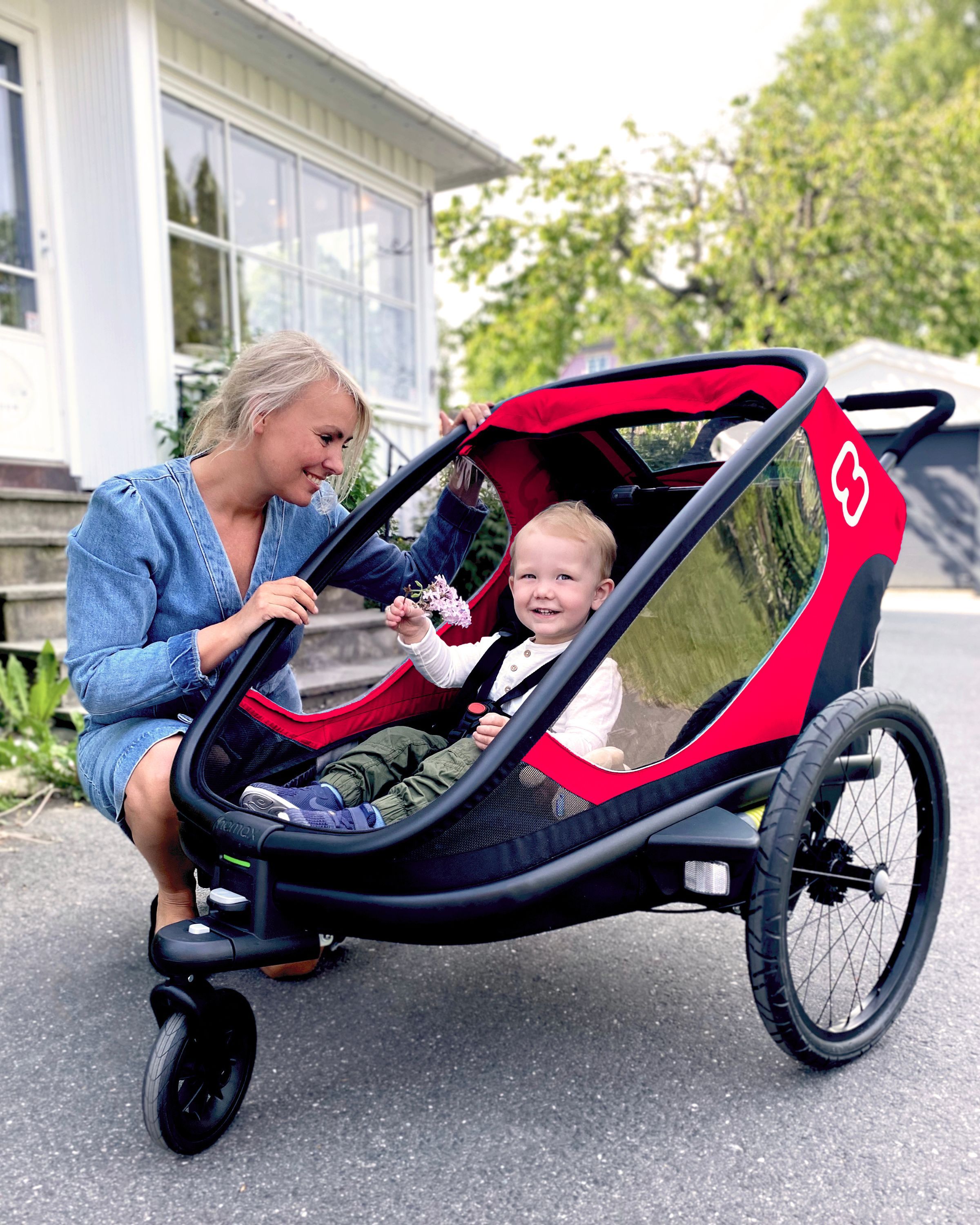 Elle peut être fixée à l'arrière d'un vélo ou utilisée comme poussette.