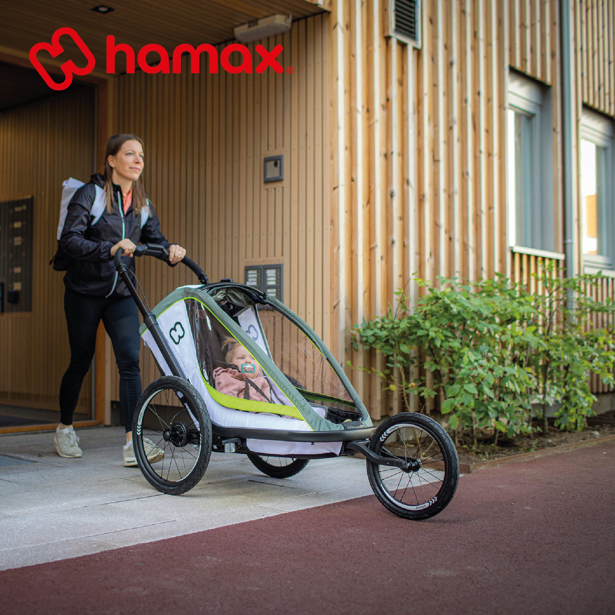 La remorque BREEZE ONE de la marque HAMAX associe un design sportif à des solutions techniques intelligentes, elle permet à l'enfant d'être protégé lors de balades à vélo, vélo électrique ou de randonnées.