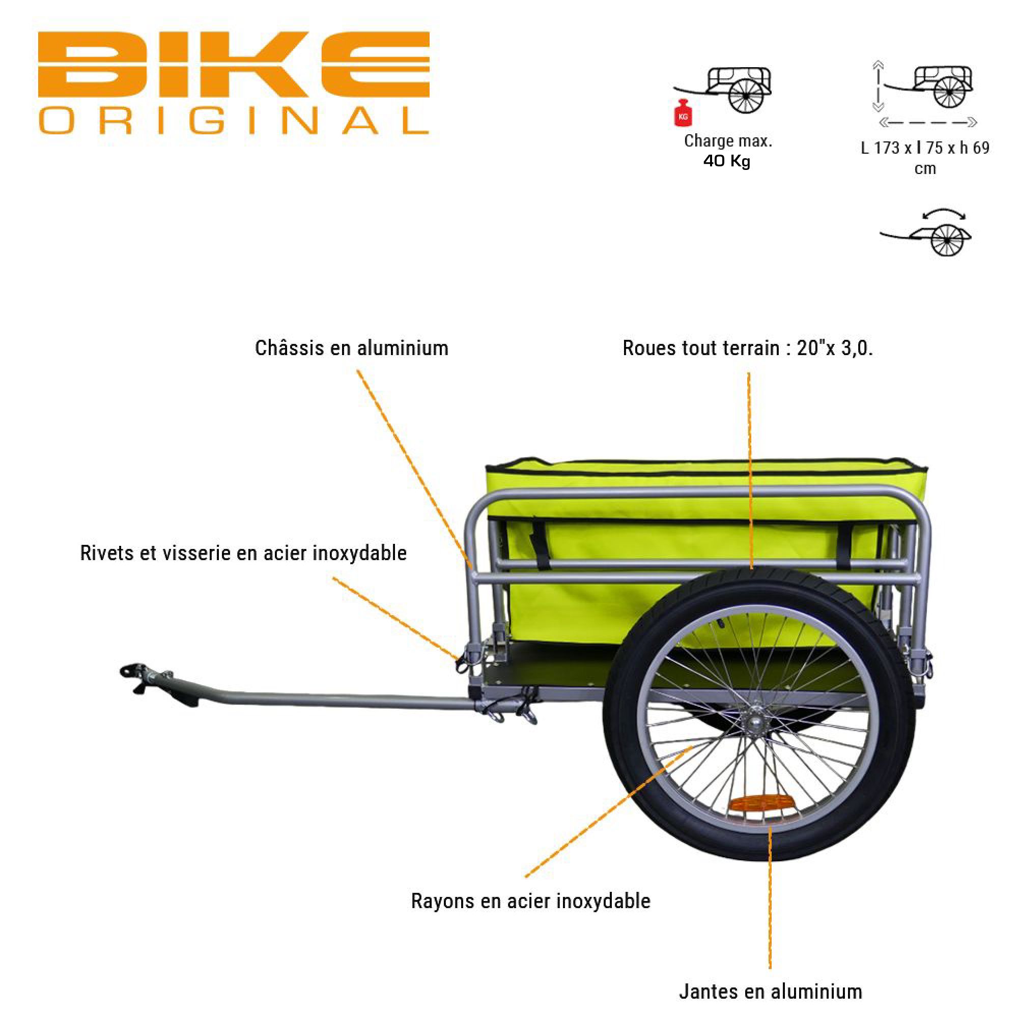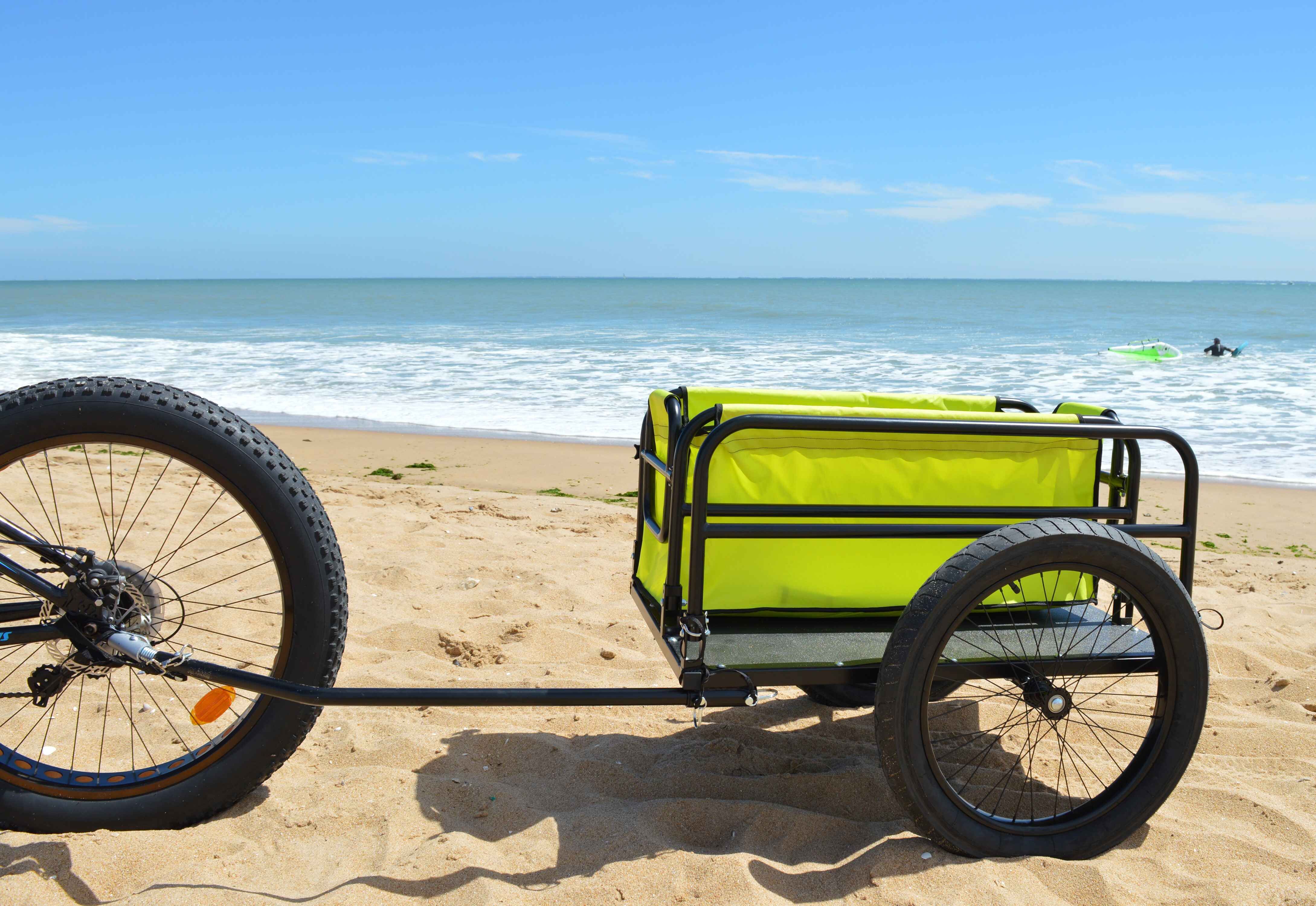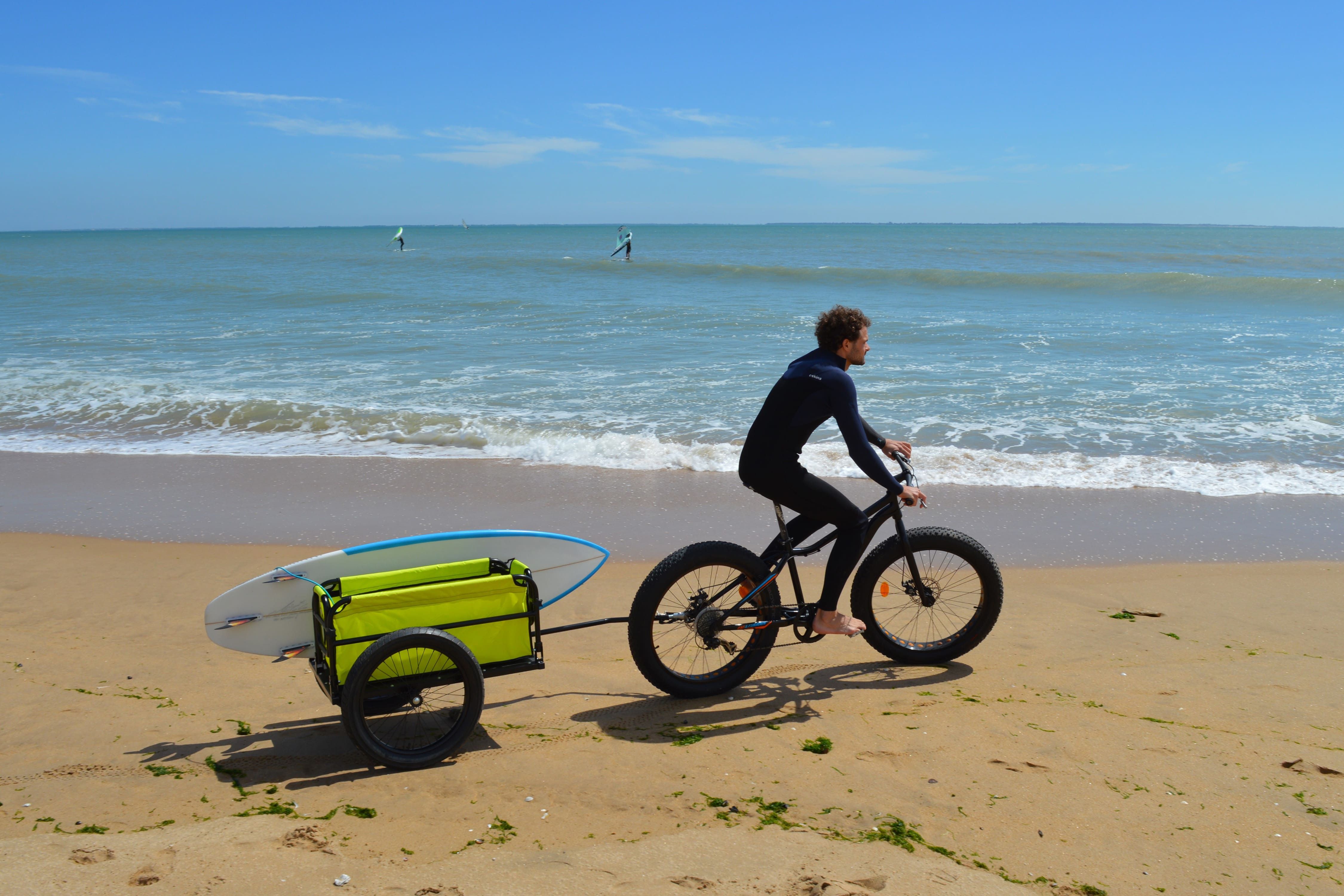 La remorque Beach de la marque BIKE ORIGINAL est équipée de roues tout terrain de 20 pouces. Elle est idéale pour transporter tout type de matériel ainsi qu'une planche de surf.