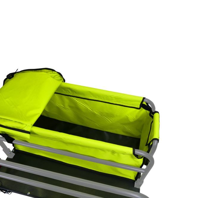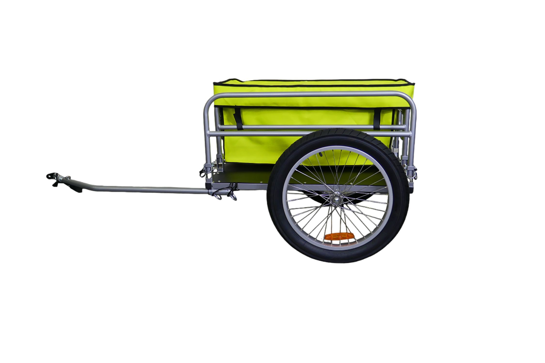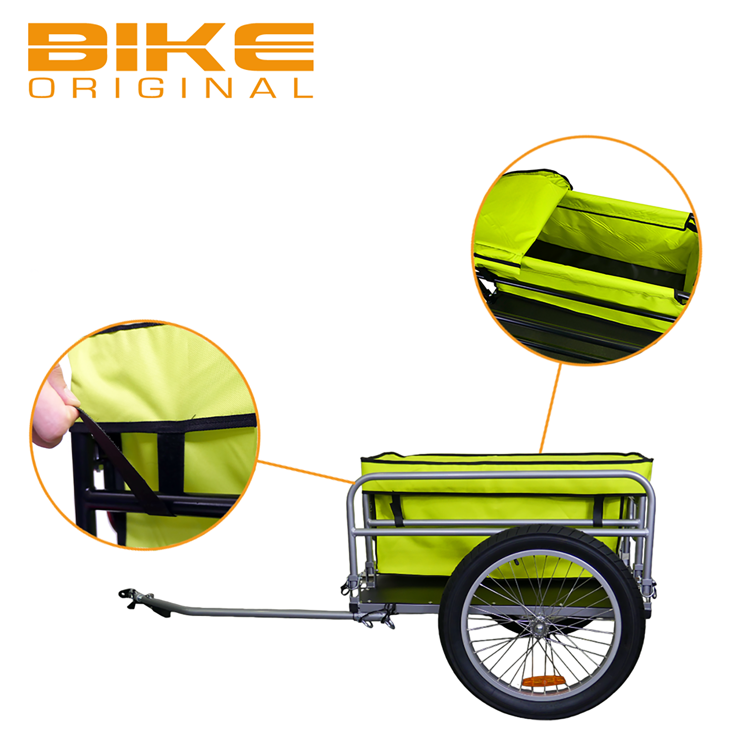 La remorque Beach de la marque BIKE ORIGINAL est équipée de roues tout terrain de 20 pouces. Elle est idéale pour transporter tout type de matériel ainsi qu'une planche de surf.