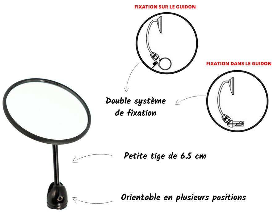 Le boîtier en plastique noir est élégant, fonctionnel et robuste. Il peut être replié et orienté dans n'importe quelle position. Son montage peut se faire à gauche comme à droite. Le rétroviseur peut être fixé sur le guidon ou dans le guidon.