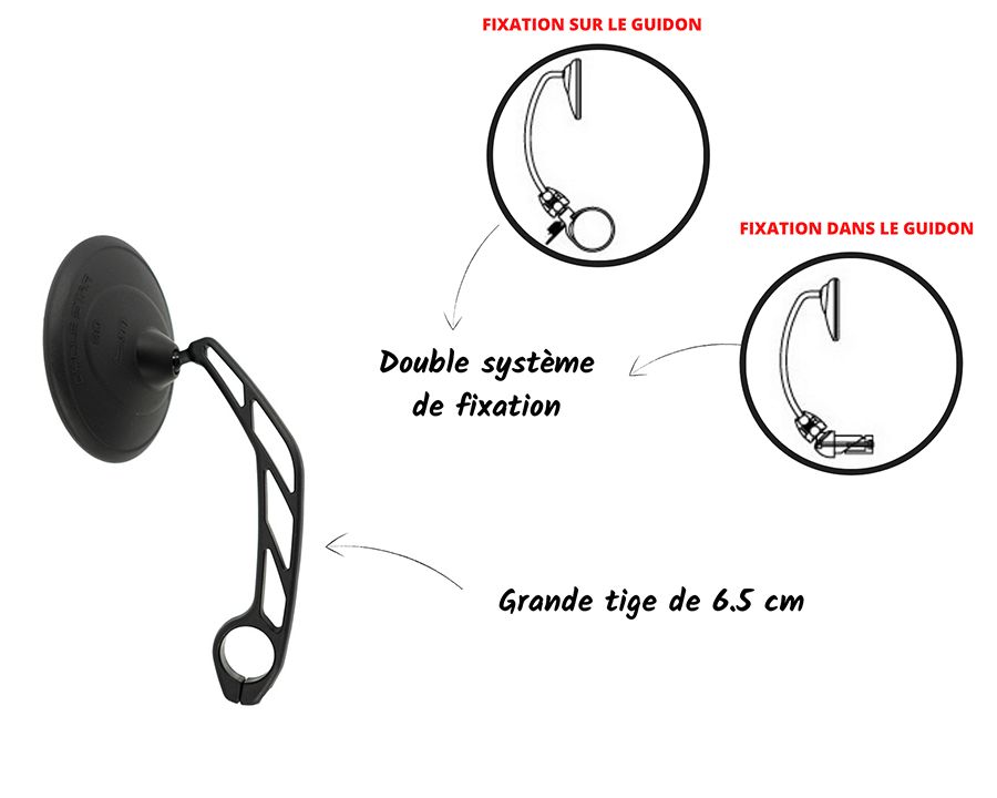 Son montage peut se faire à gauche comme à droite. Le rétroviseur peut être fixé sur le guidon ou dans le guidon.