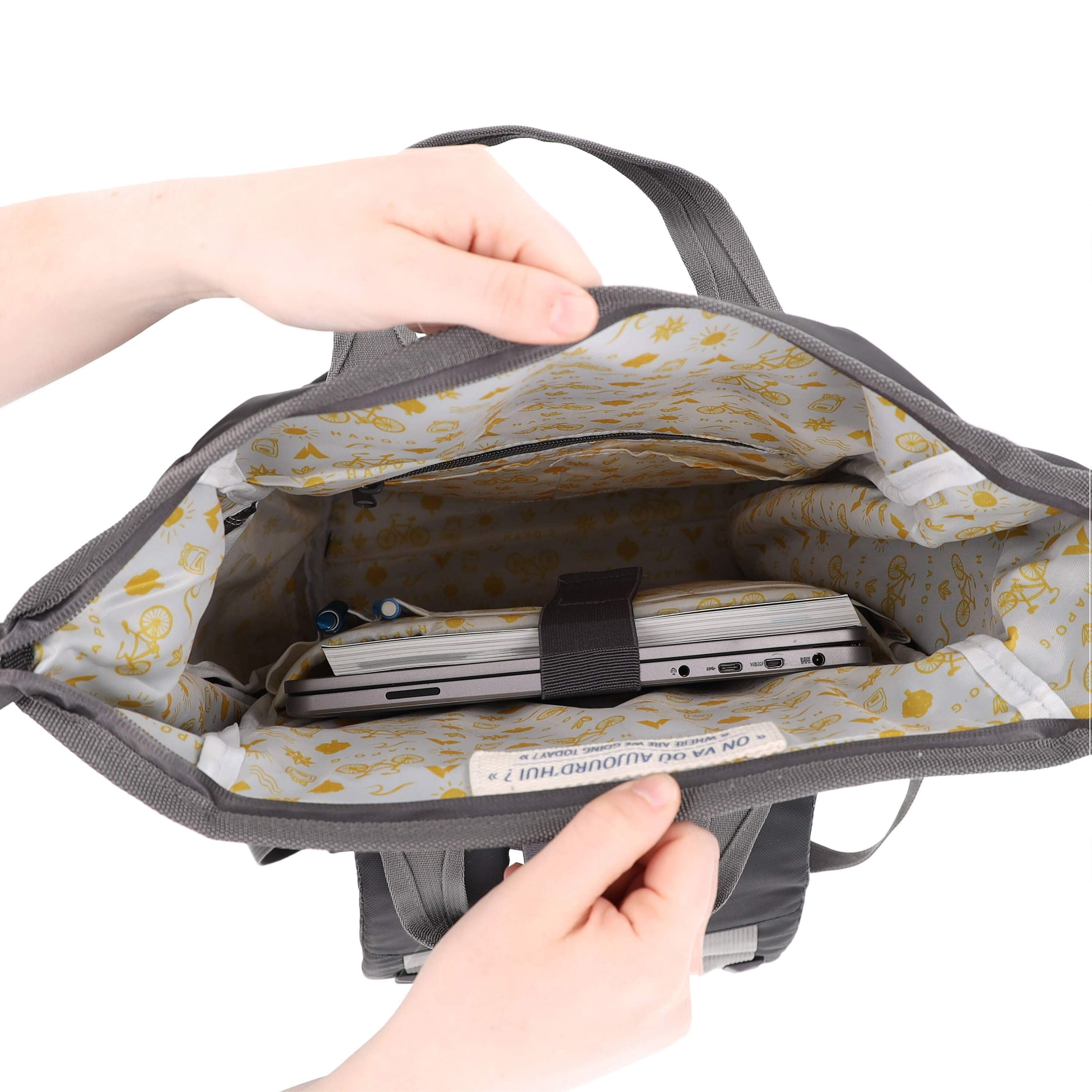 • Possibilité de glisser les bretelles dans des poches extensibles situées à l’arrière du sac pour éviter qu'elles s'accrochent dans les rayons en mode vélo.
