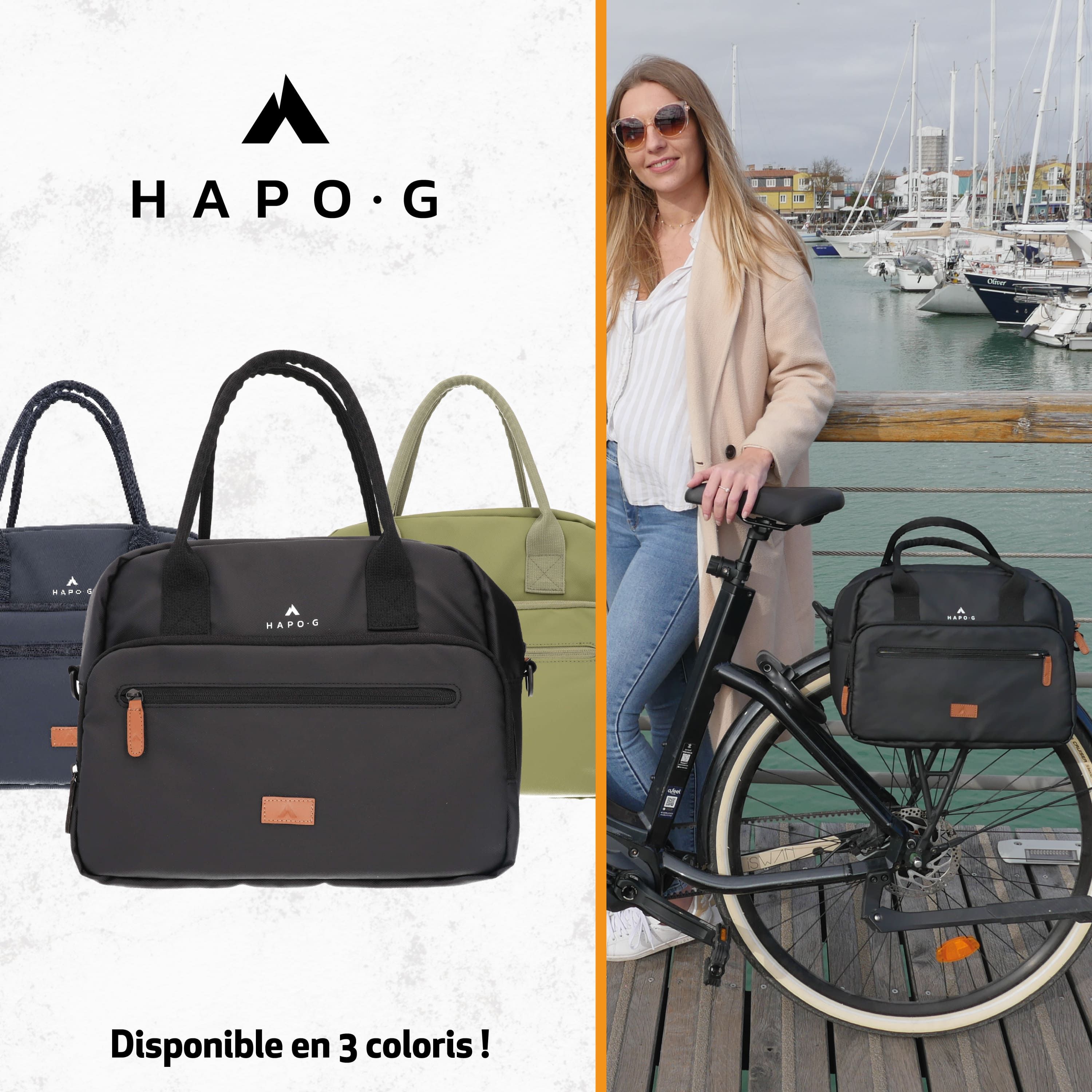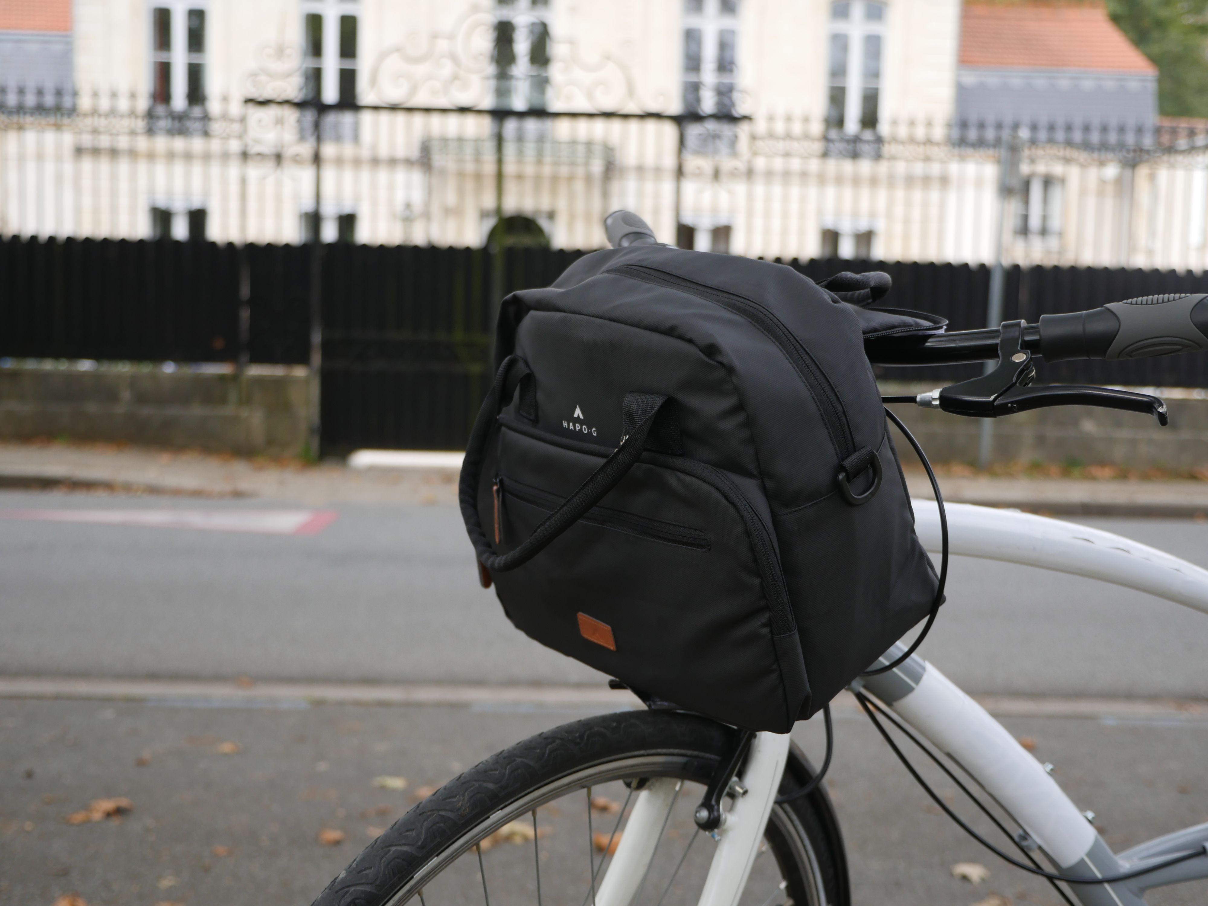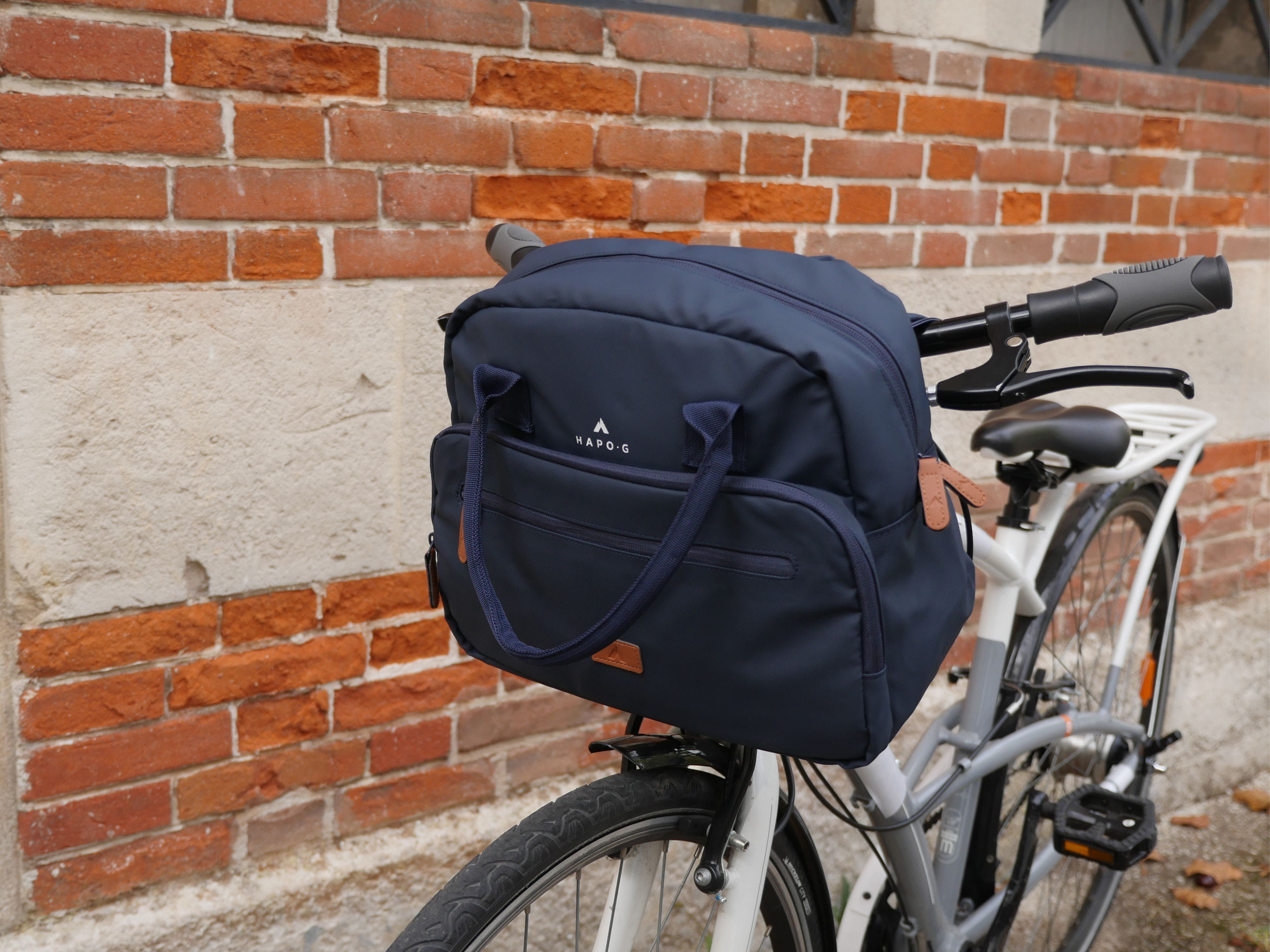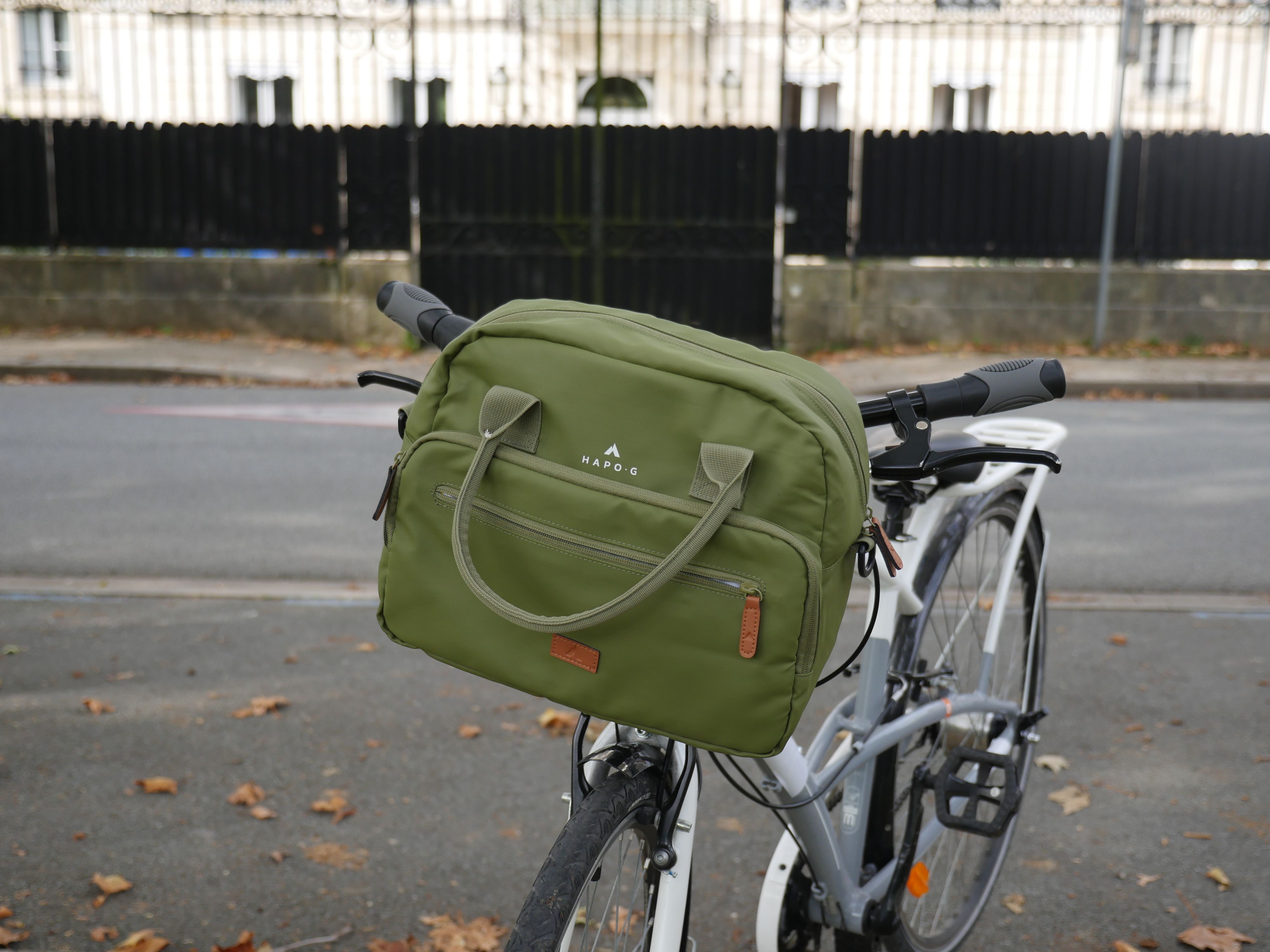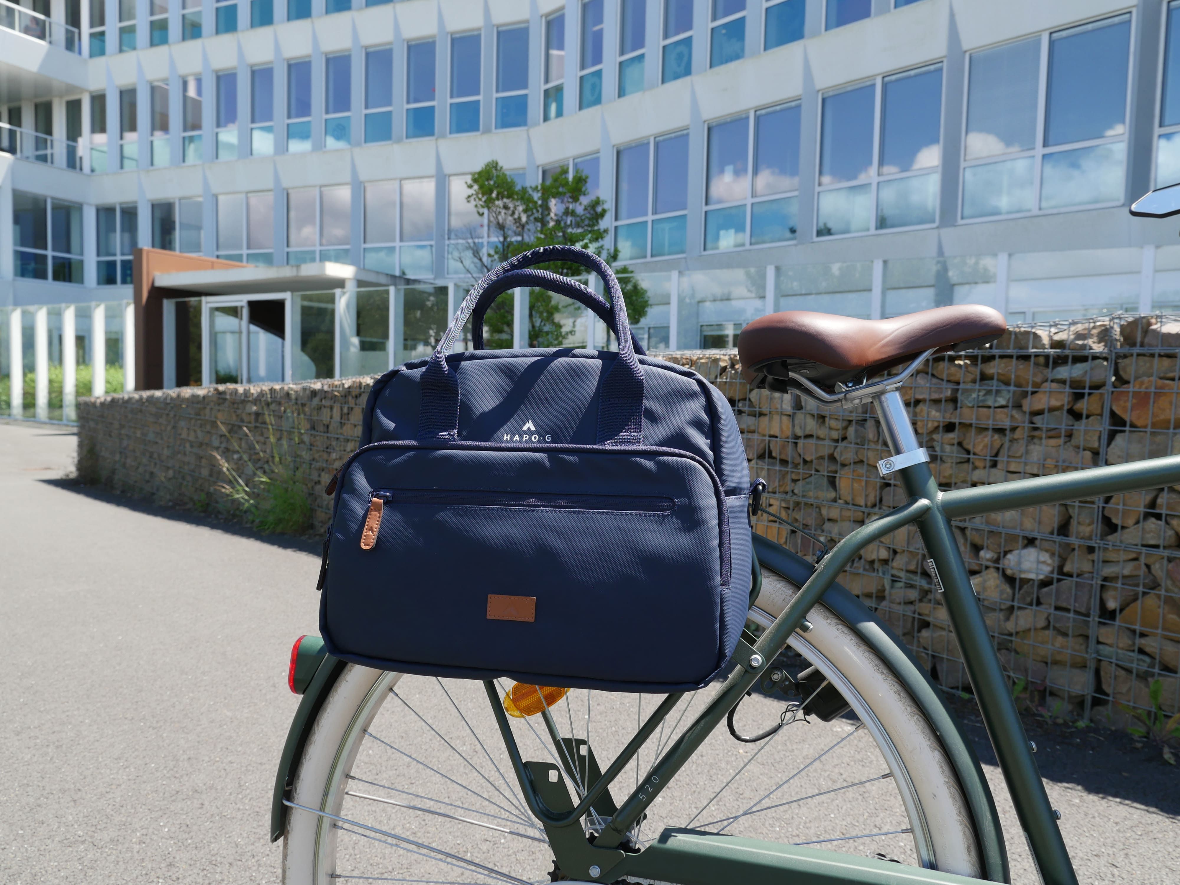 Cette sacoche vélotaf de la marque HAPO-G se fixe sur le porte-bagages du vélo et peut aussi se fixer sur le guidon.