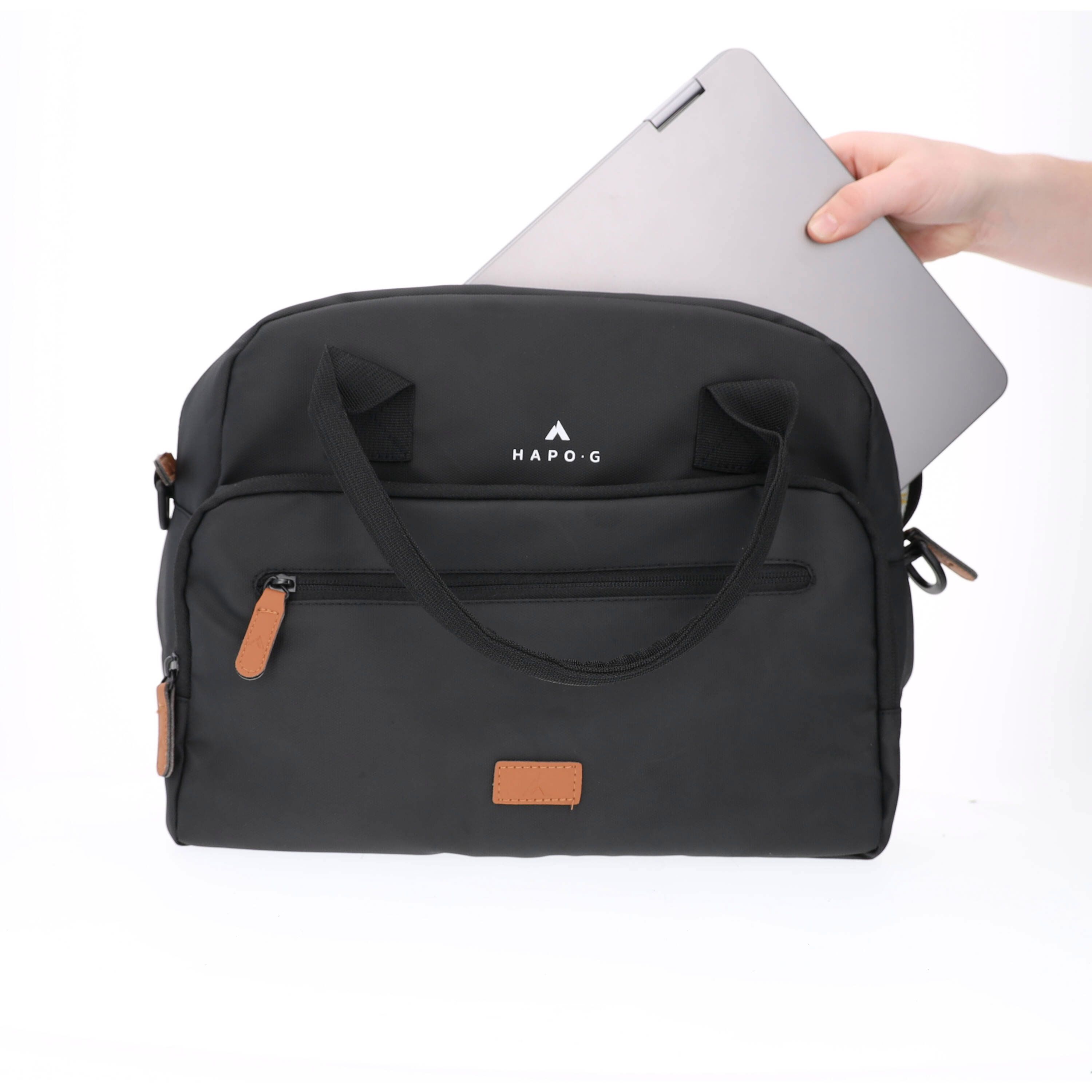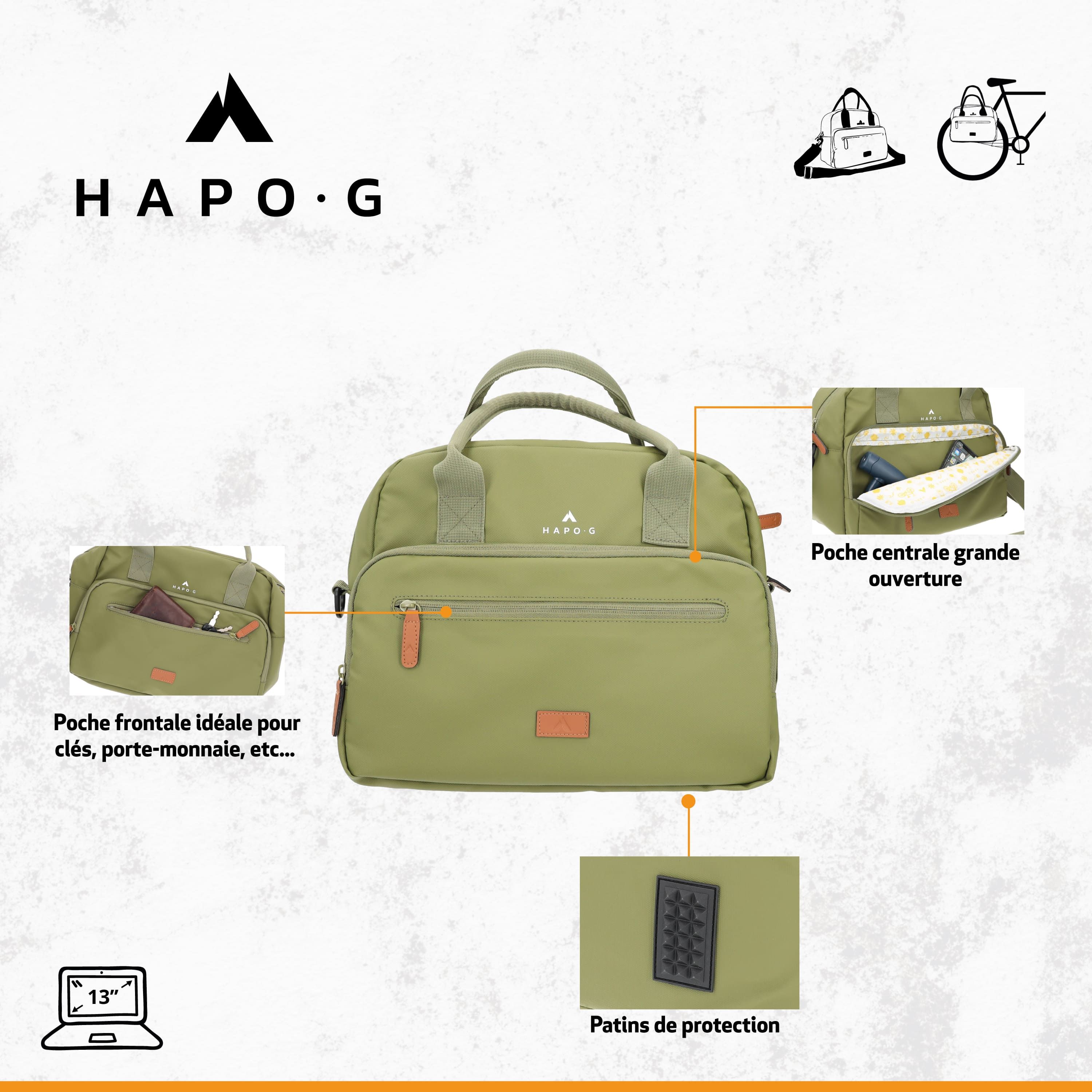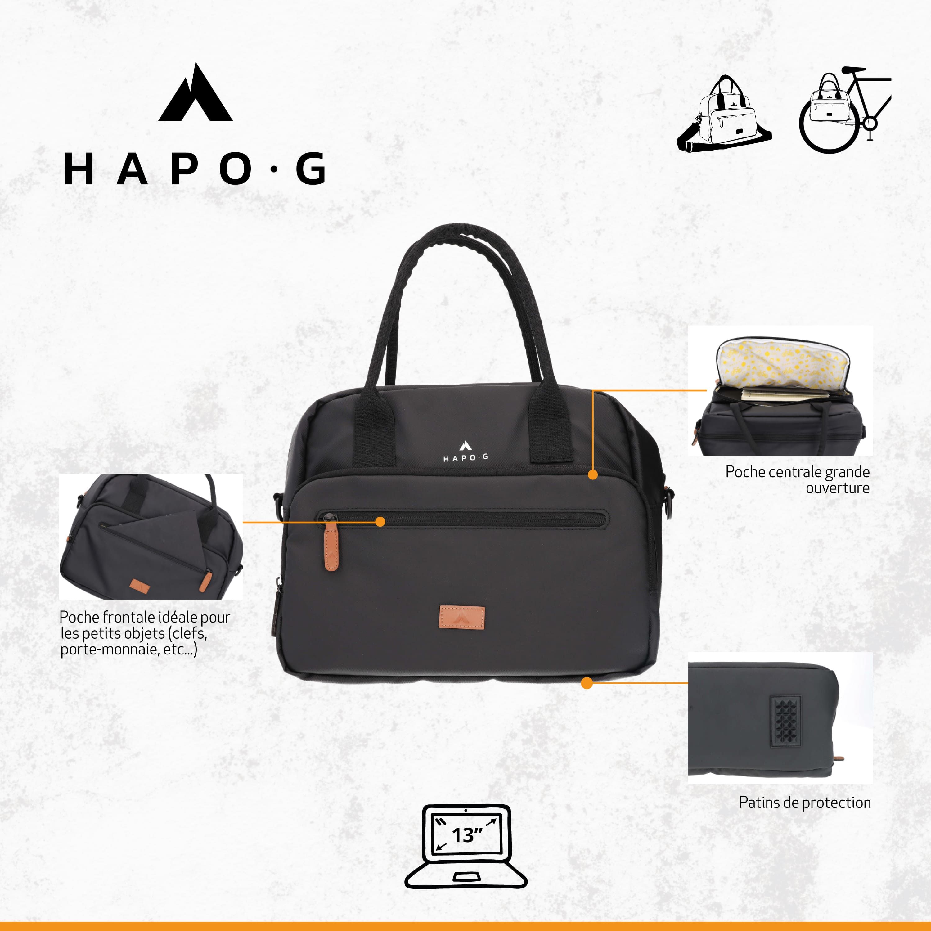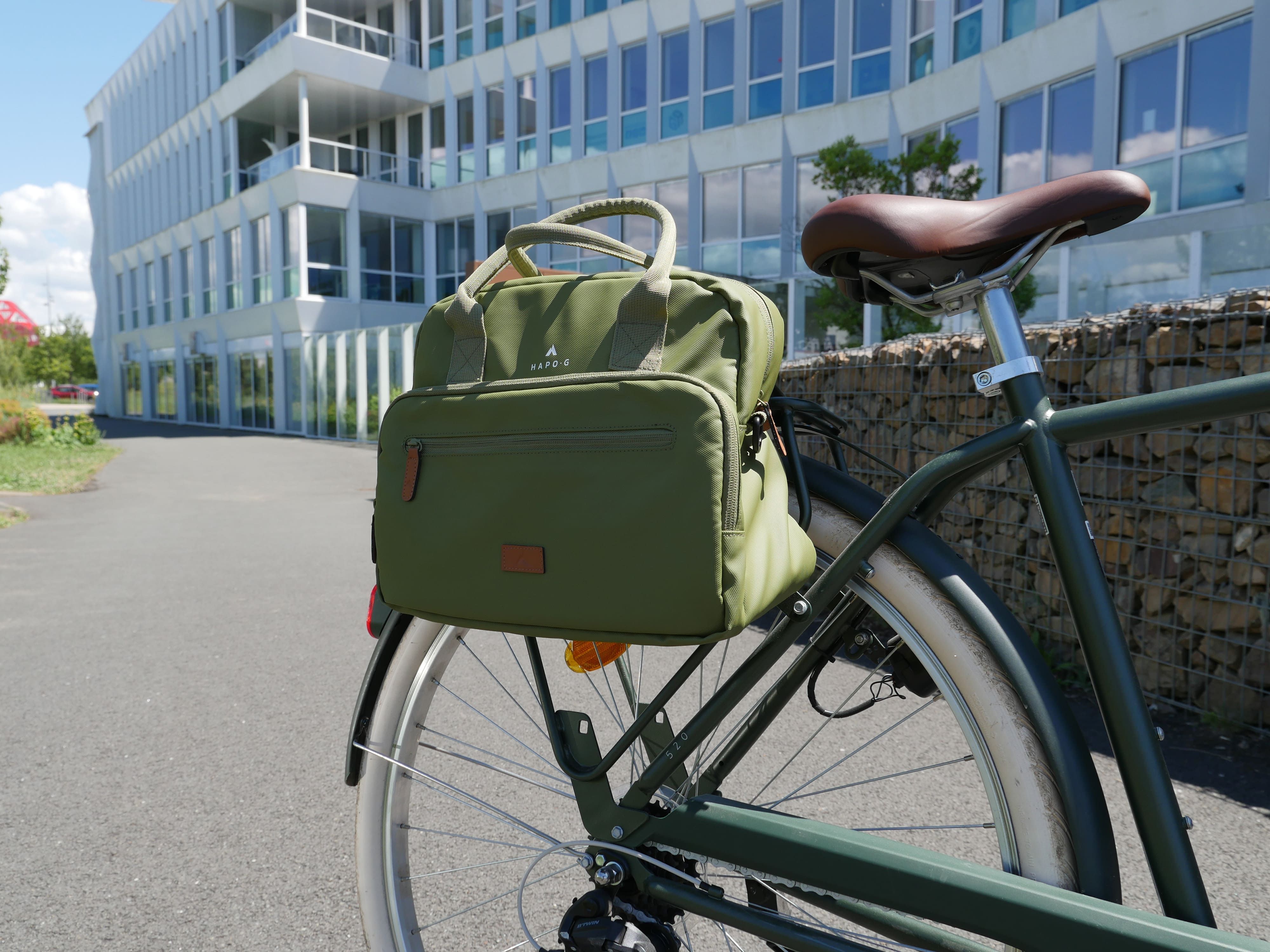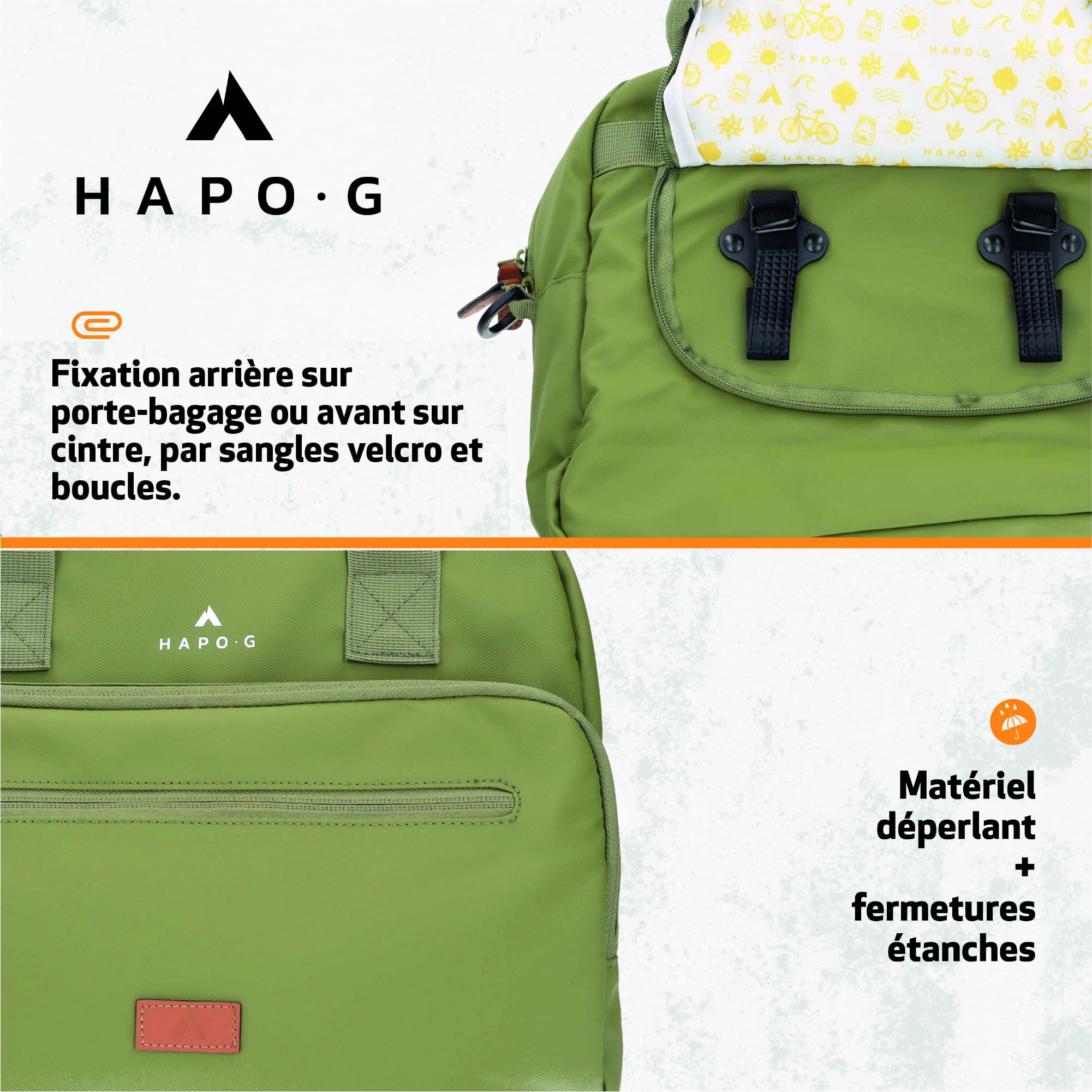 Cette sacoche vélotaf de la marque HAPO-G se fixe sur le porte-bagages du vélo et peut aussi se fixer sur le guidon.
