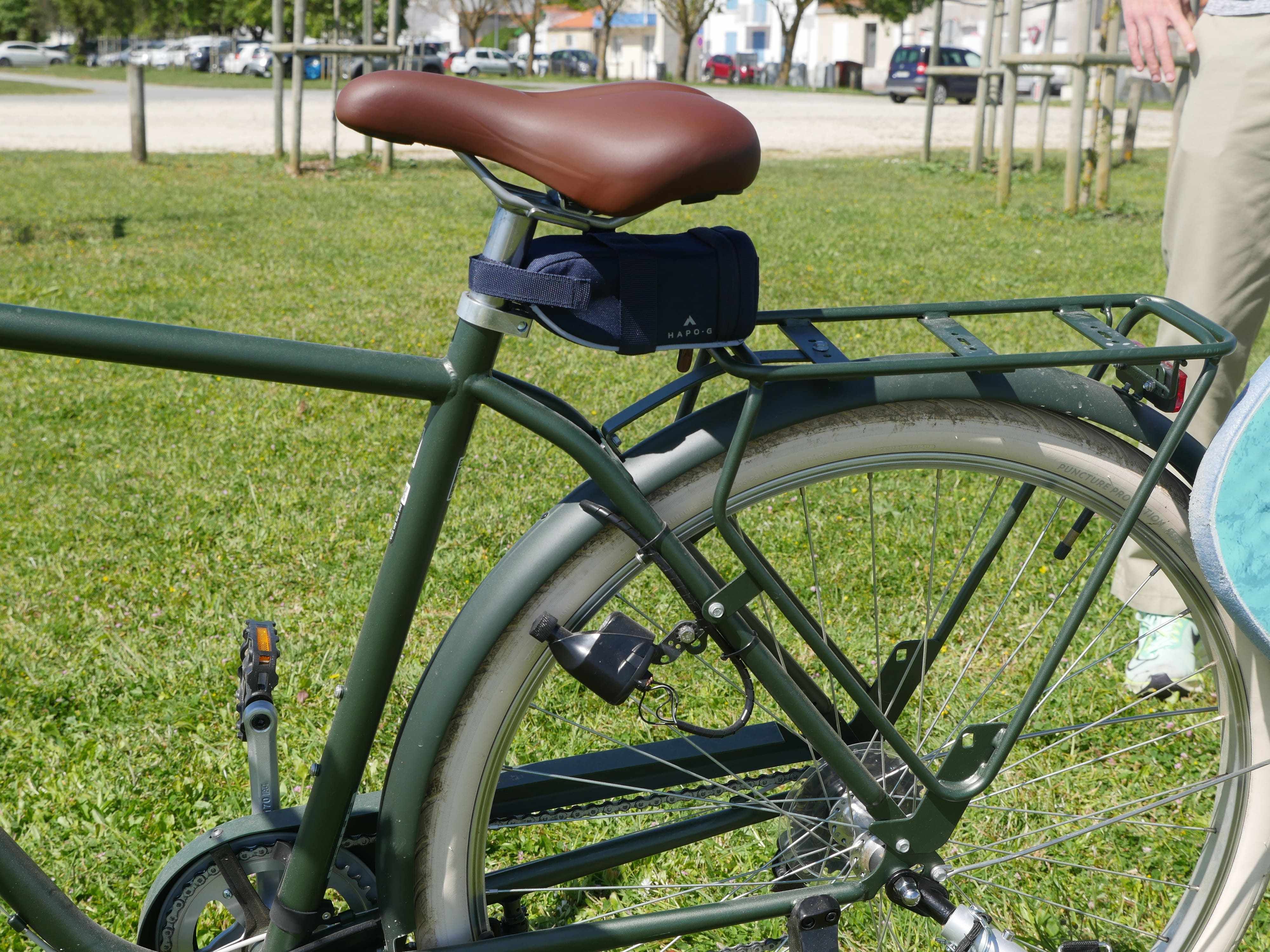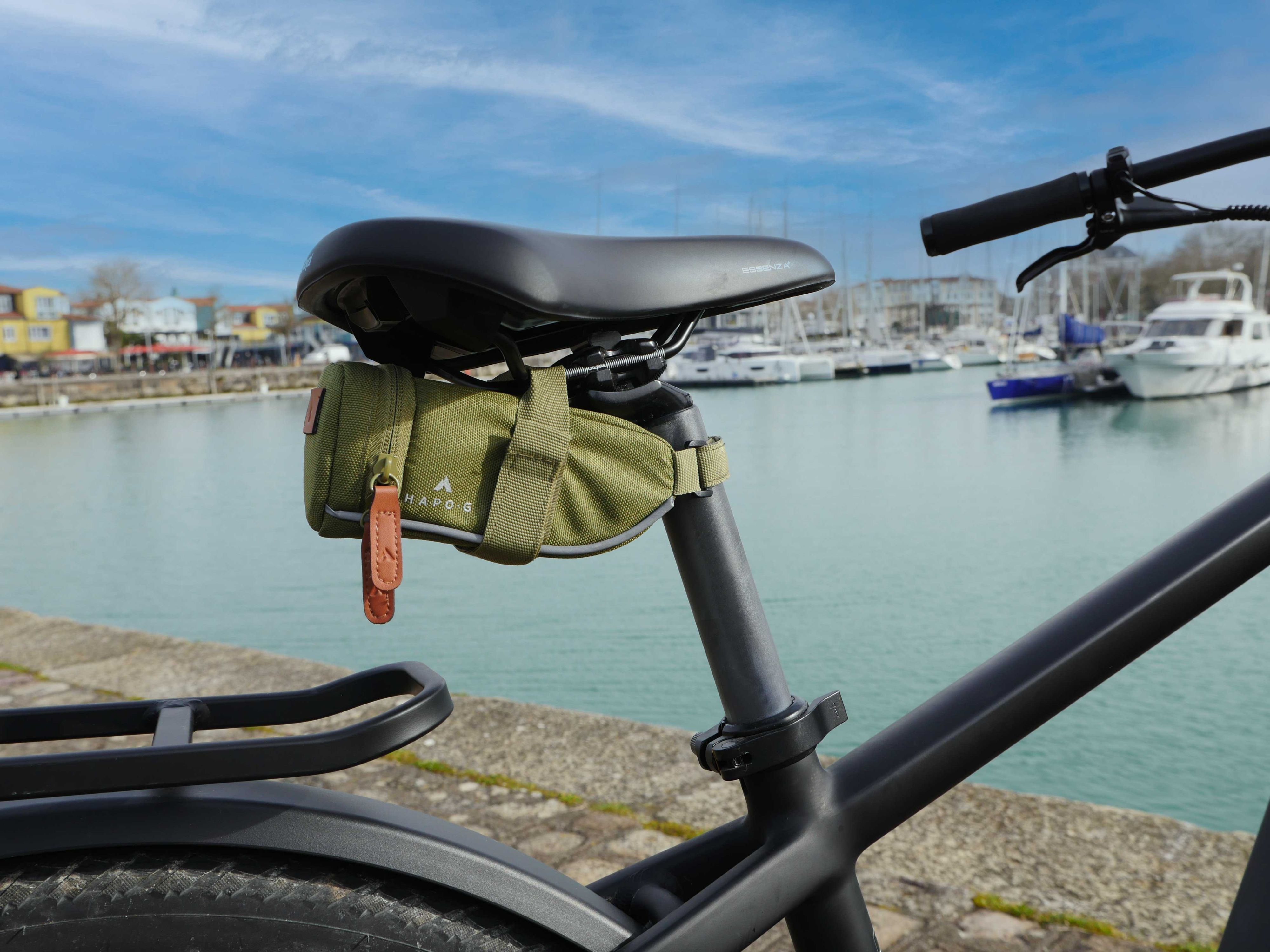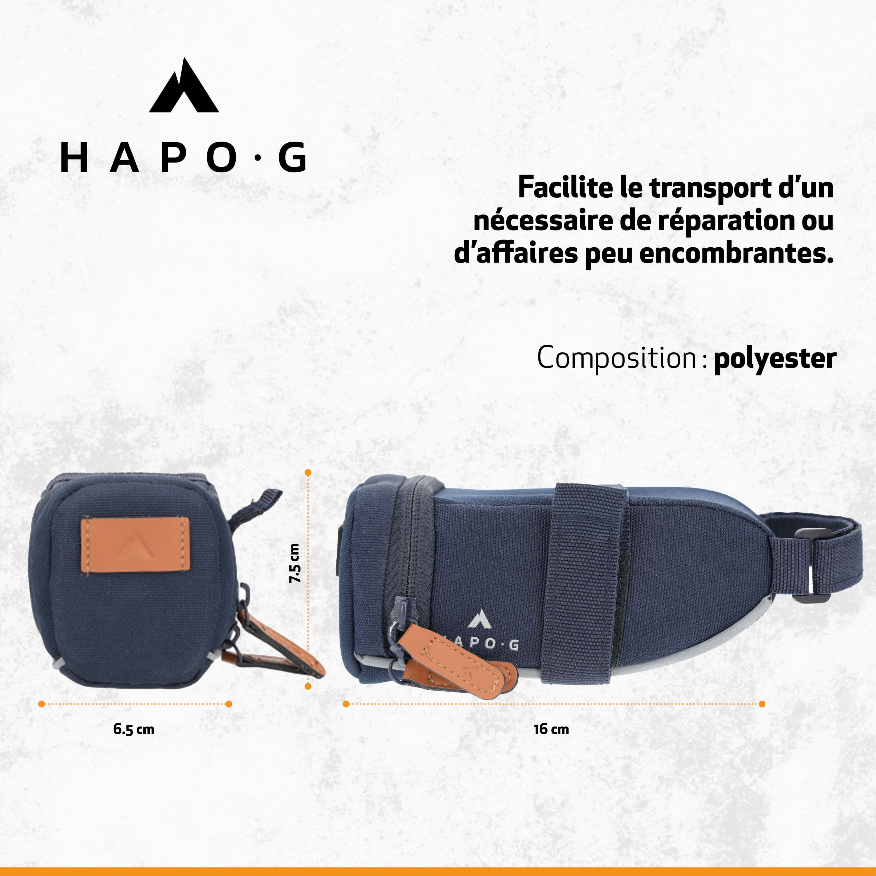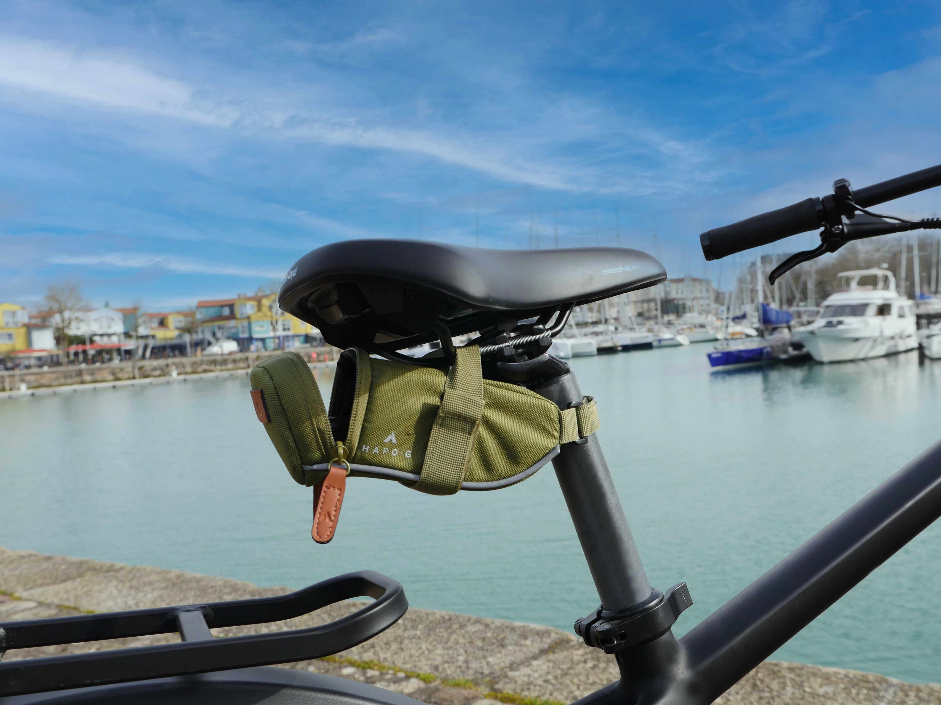 La sacoche de selle de la marque HAPO G s'installe grâce à deux sangles sous la selle et dispose d'une contenance de 0,7 litres.