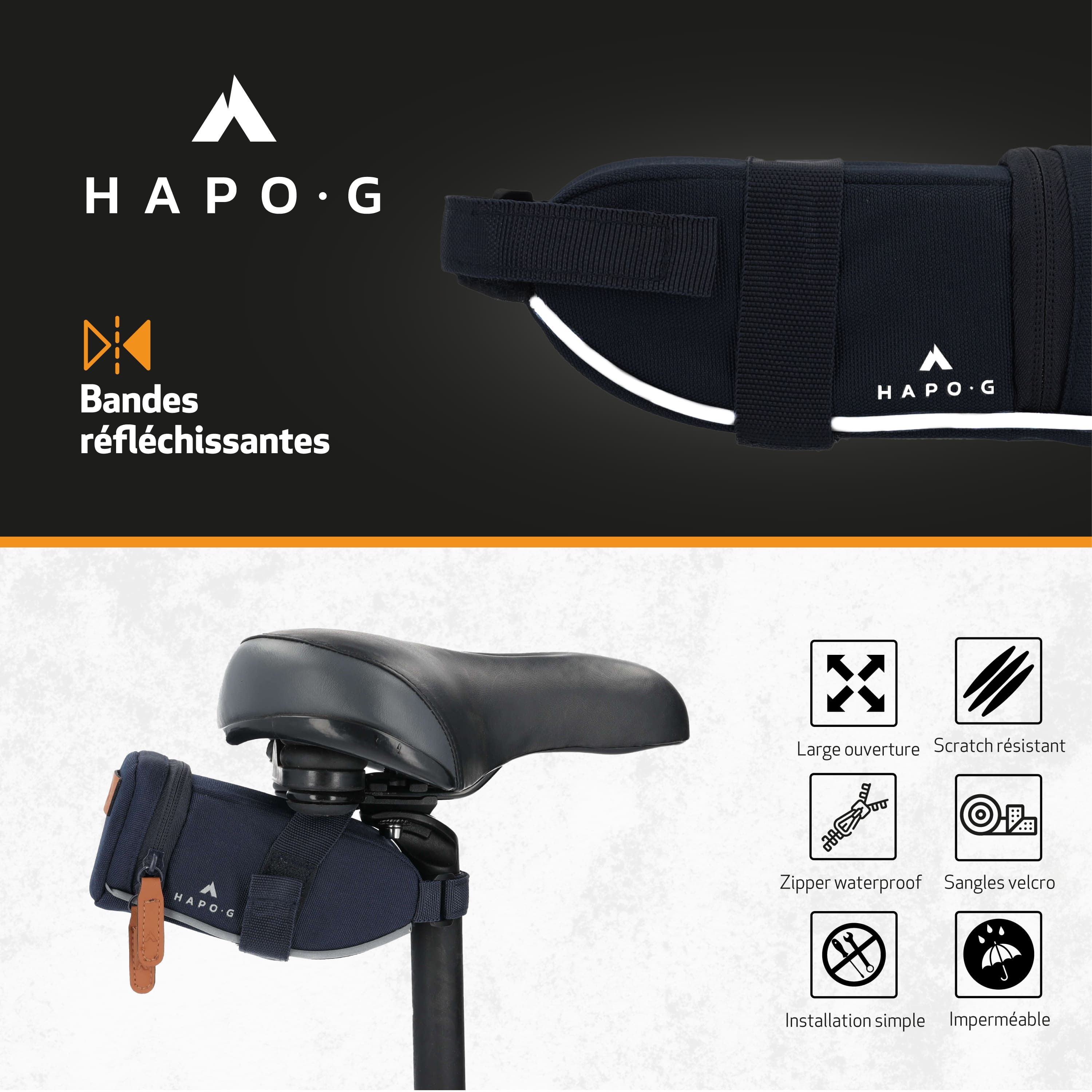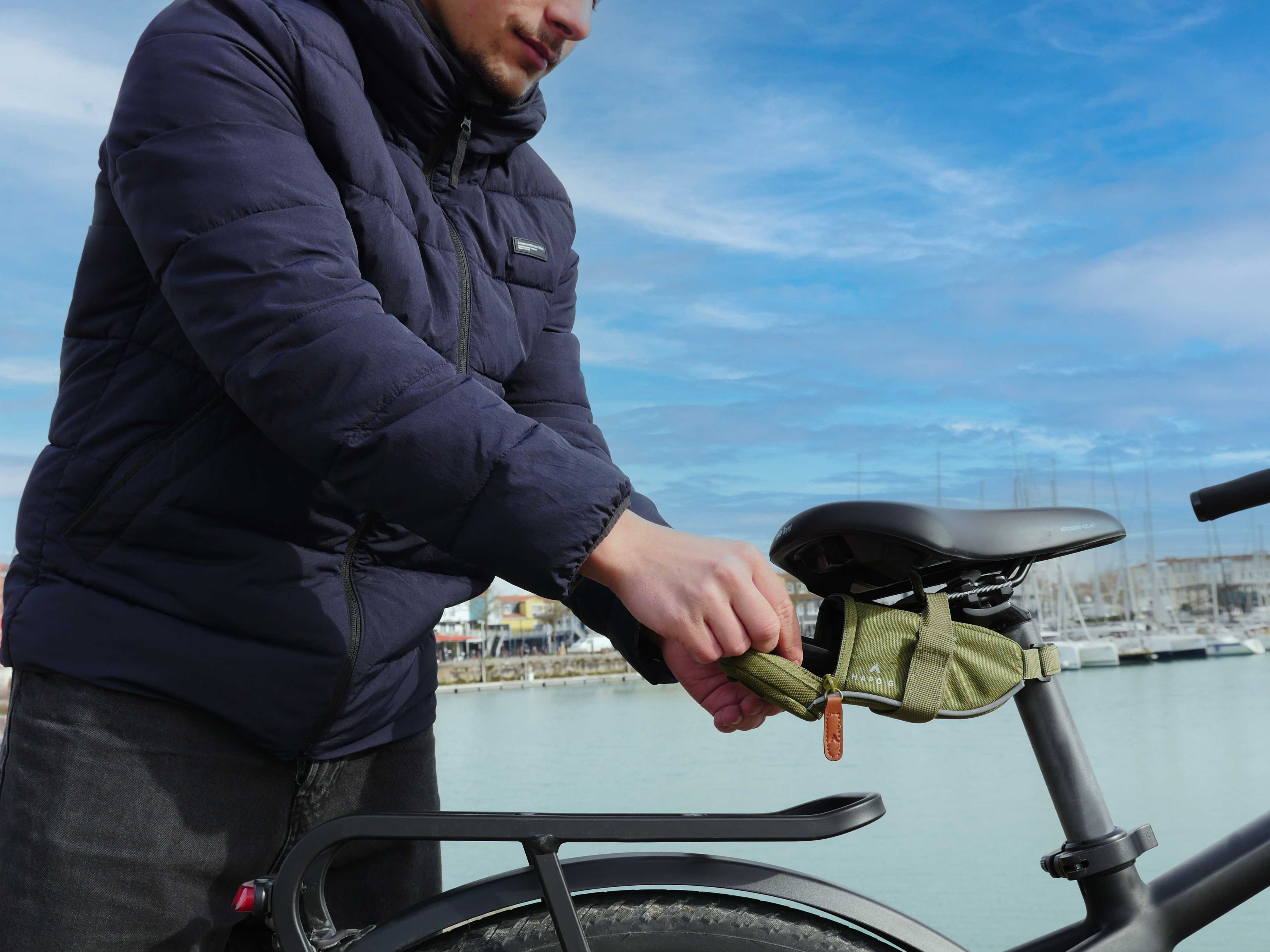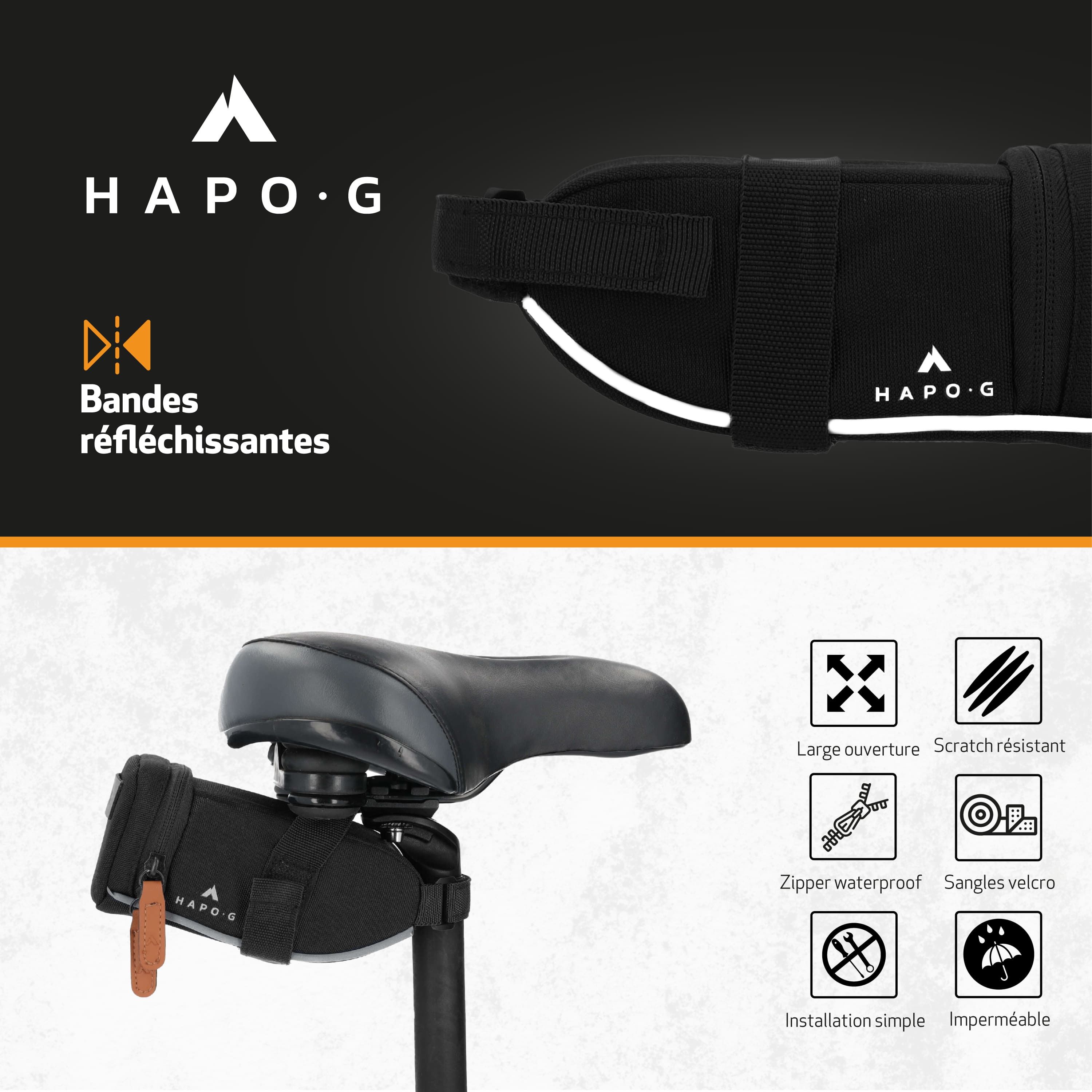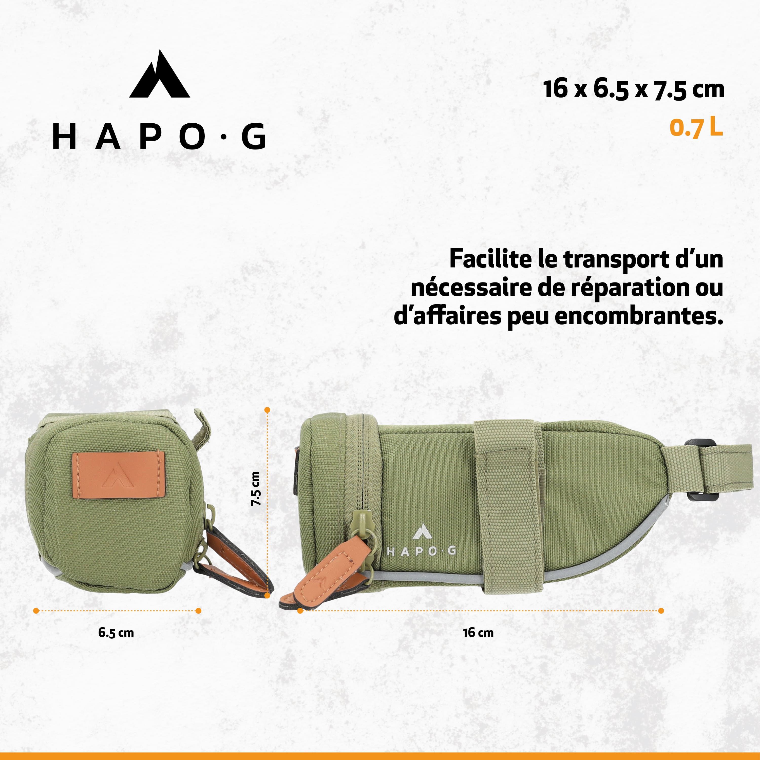 La sacoche de selle de la marque HAPO G s'installe grâce à deux sangles sous la selle et dispose d'une contenance de 0,7 litres.