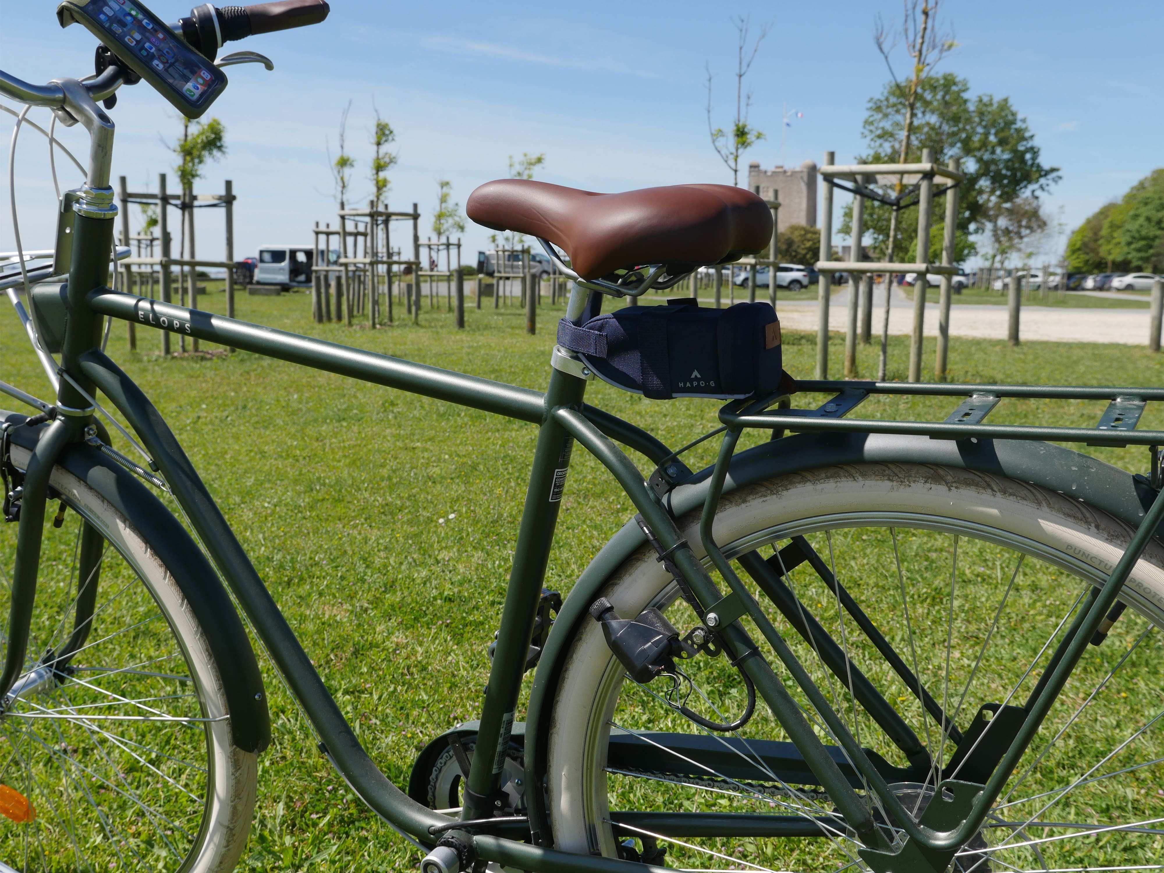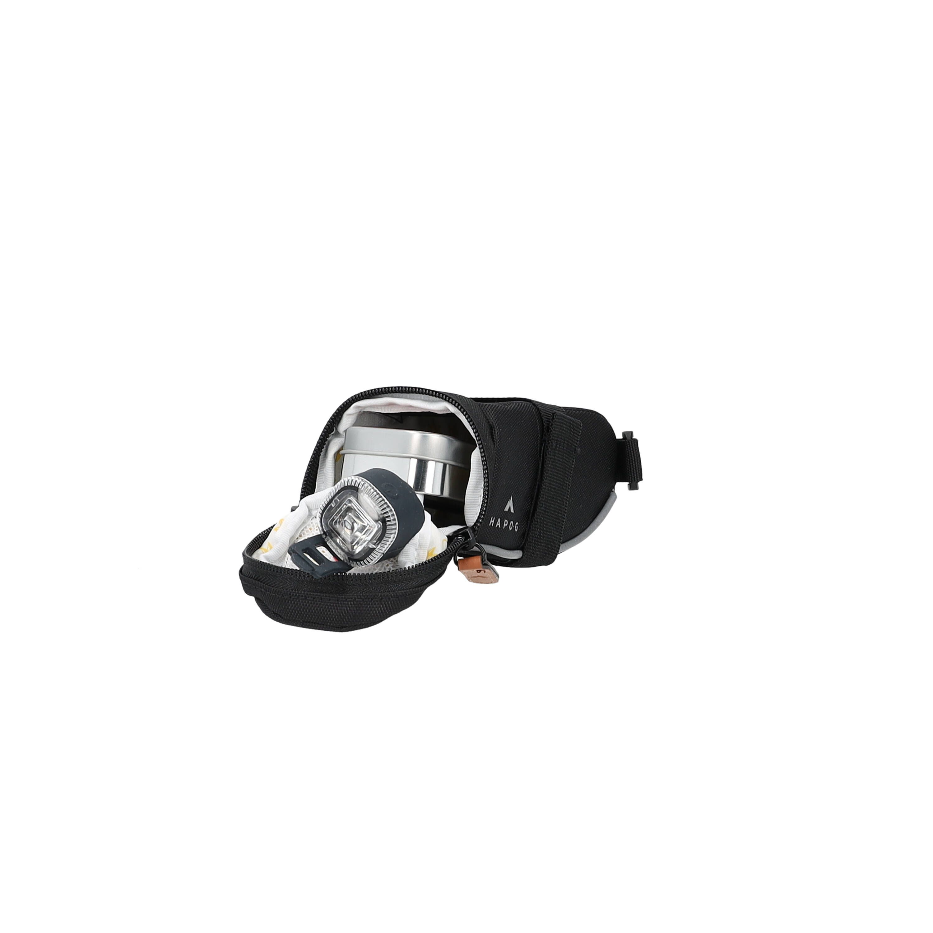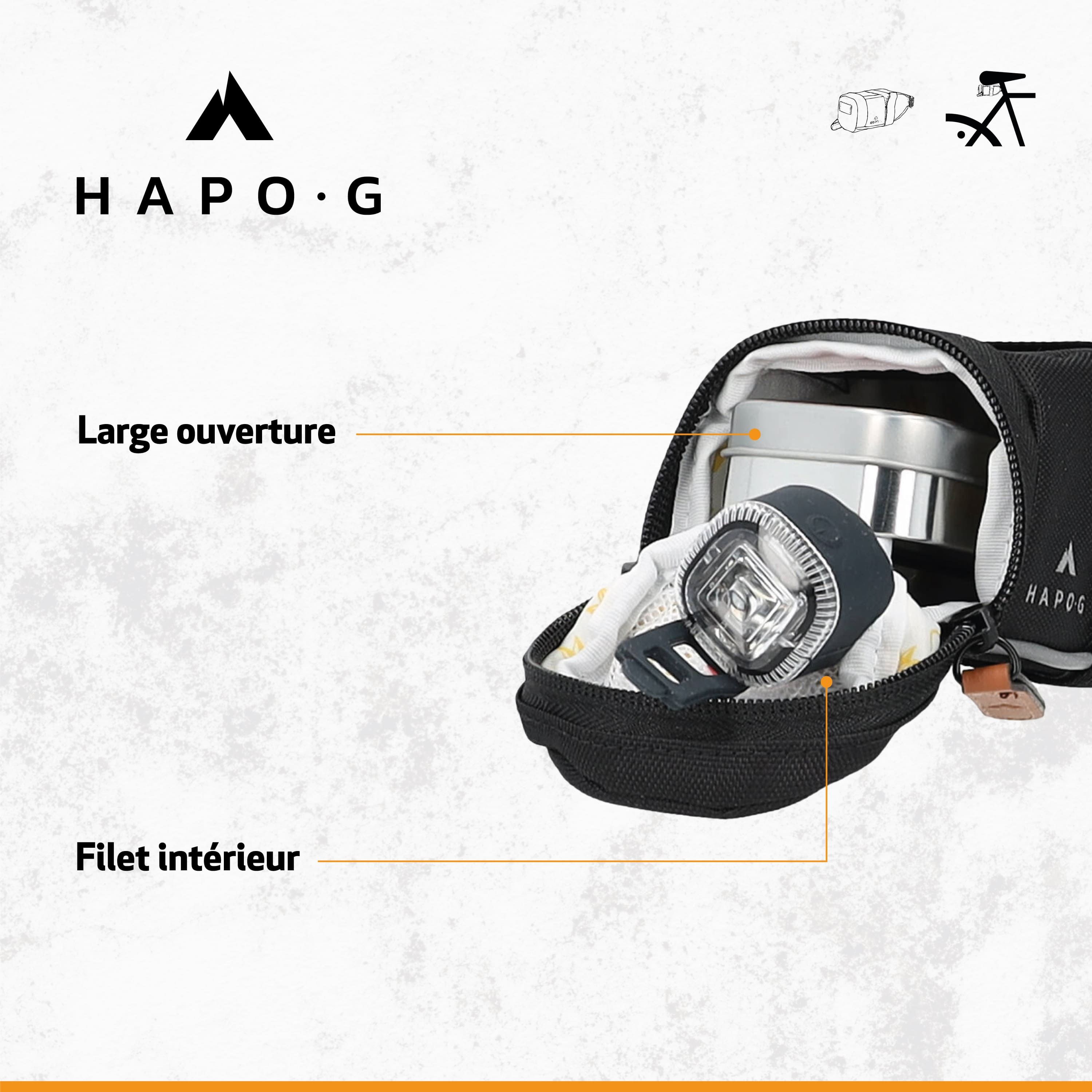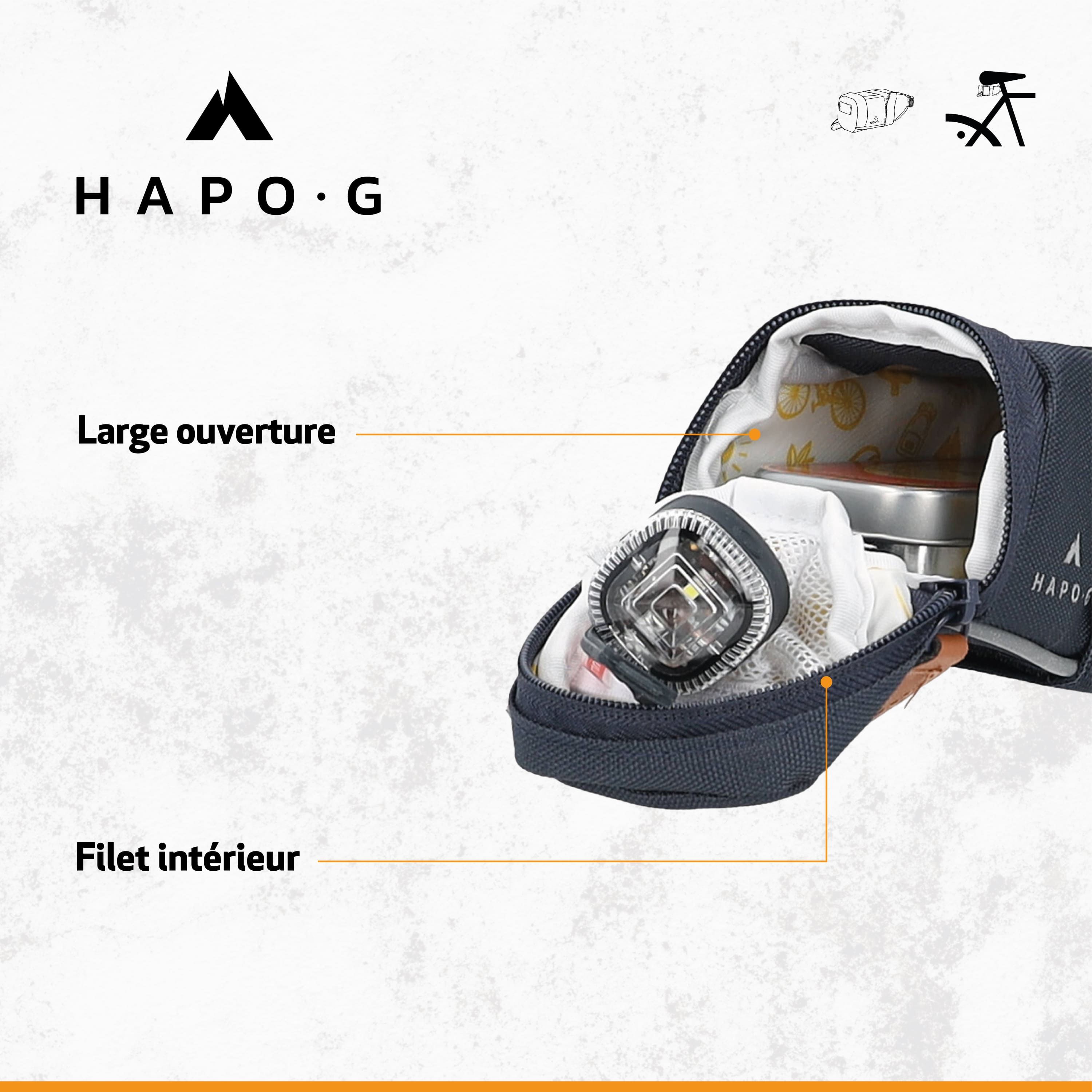 La sacoche de selle de la marque HAPO G s'installe grâce à deux sangles sous la selle et dispose d'une contenance de 0,7 litres.
