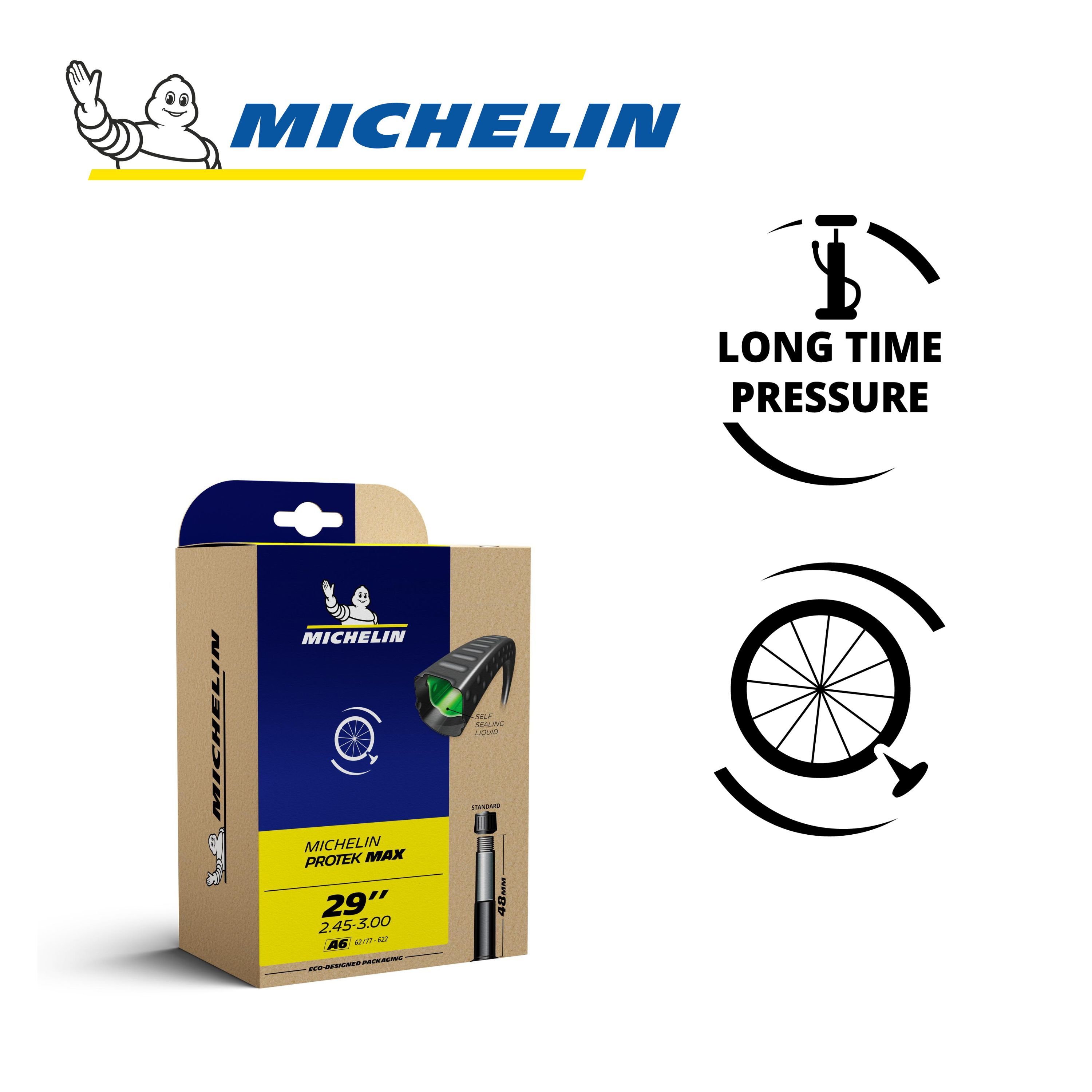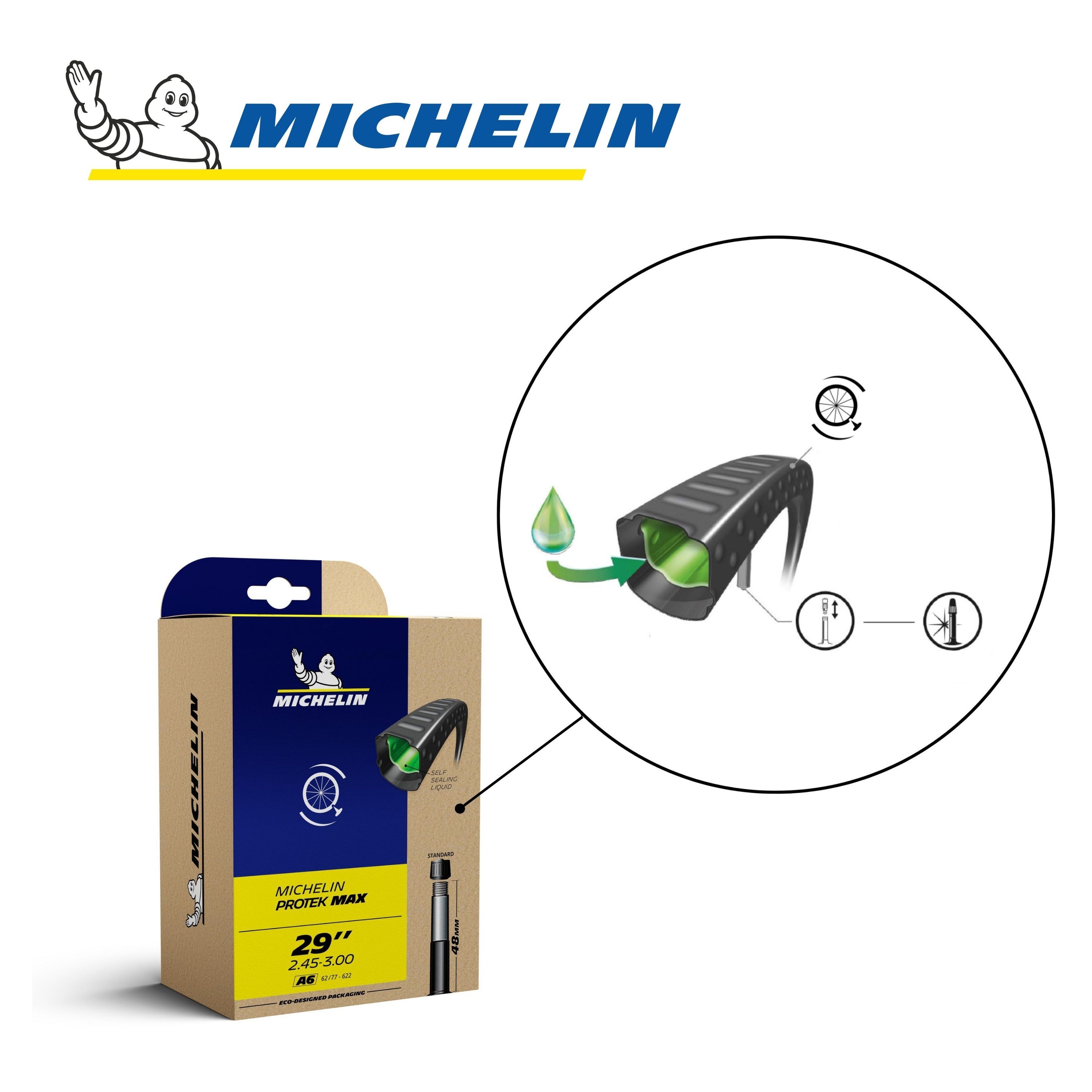 La chambre à air MICHELIN A6 PROTEK MAX 29" x 2,45-3,00 62/77x622 ST 48mm référence CAI 593675 de la marque, gamme Competition Line, offre un design spécifique associé à un liquide intérieur qui offre une garantie de pression optimale et une excellente résistance à la crevaison. Ainsi en compression, un trou se bouche naturellement.