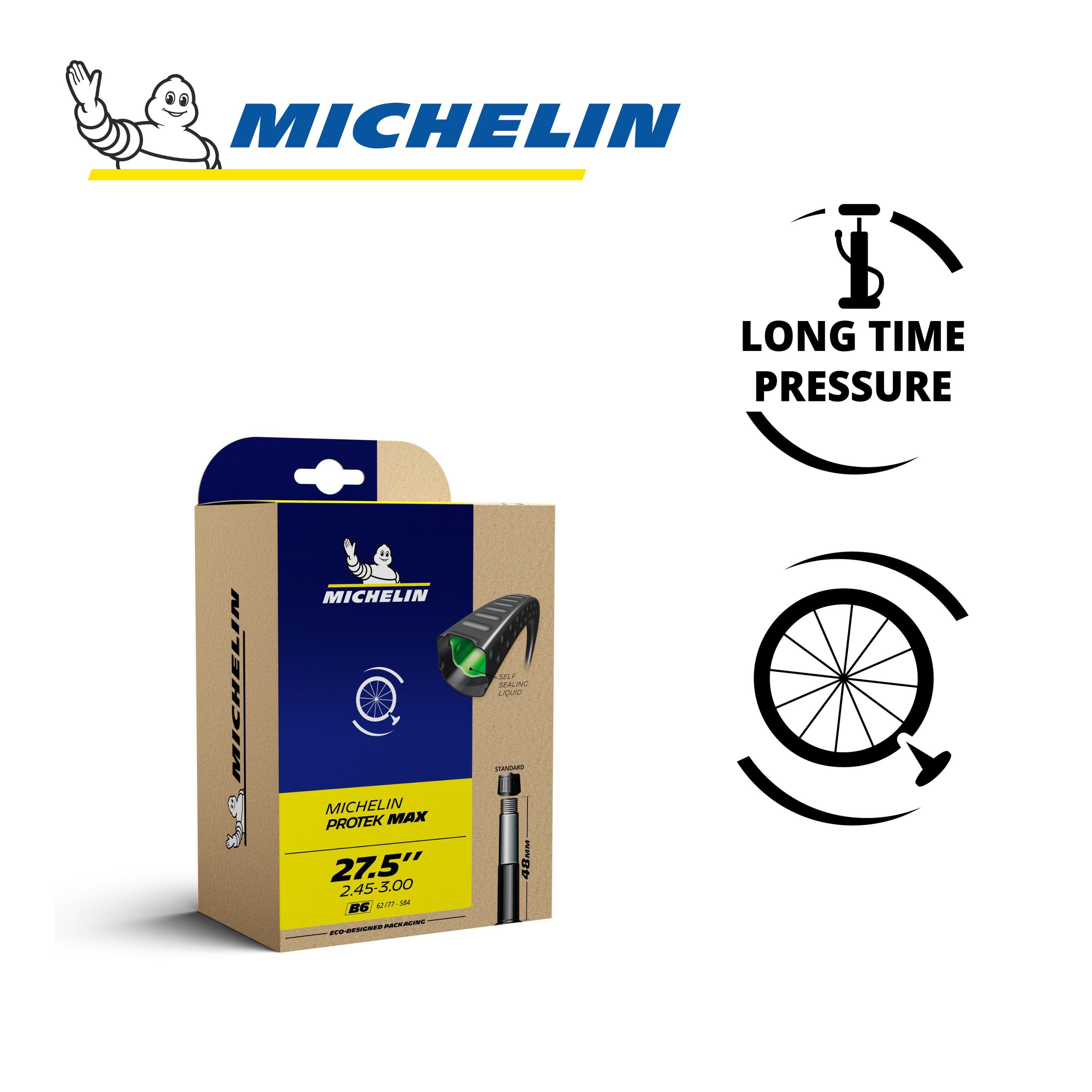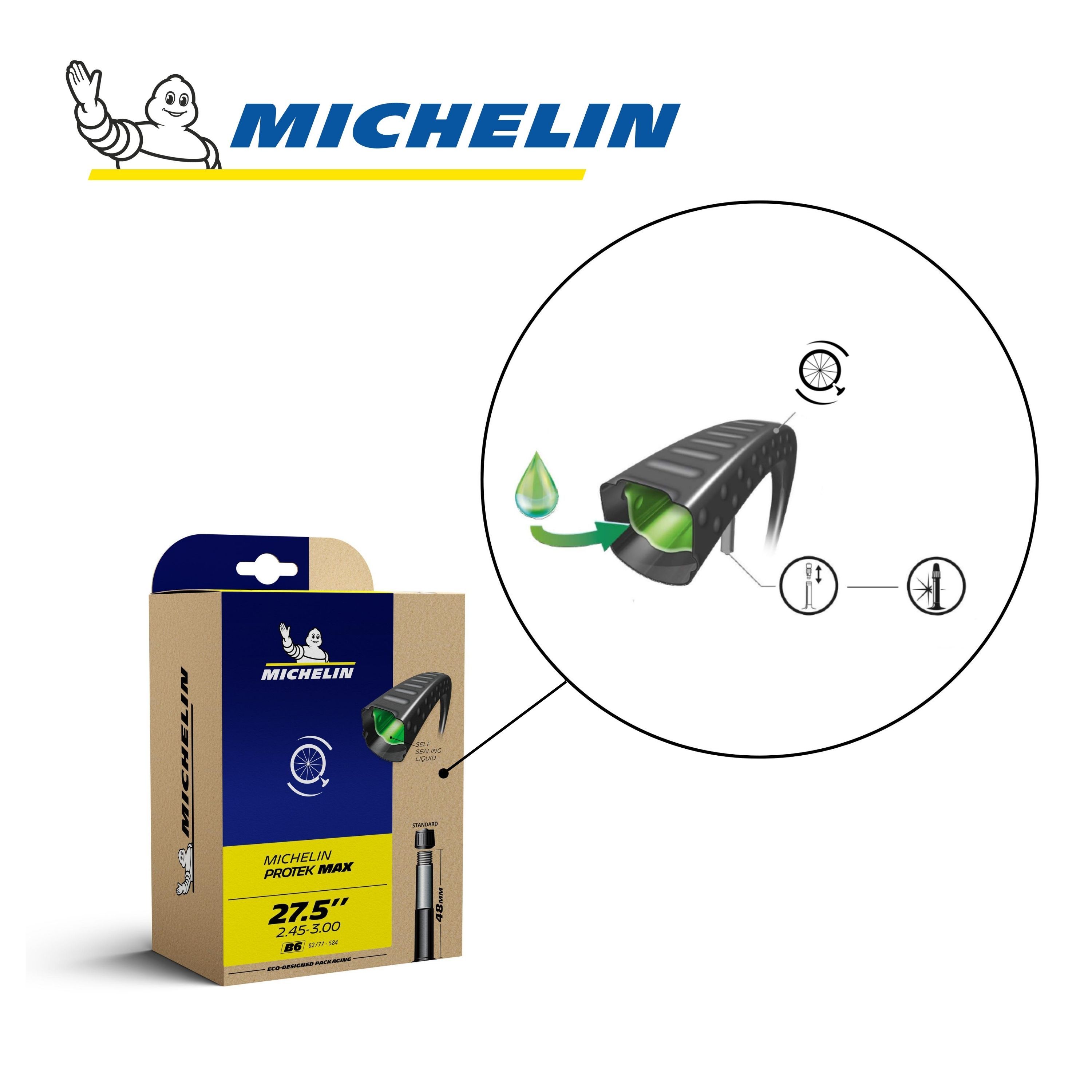 La chambre à air MICHELIN B6 PROTEK MAX 27,5" x 2,45-3,00 62/77x584 ST 48 référence CAI 878198 de la marque, gamme Compétition Line, offre un design spécifique associé à un liquide intérieur qui offre une garantie de pression optimale et une excellente résistance à la crevaison. Ainsi en compression, un trou se bouche naturellement.