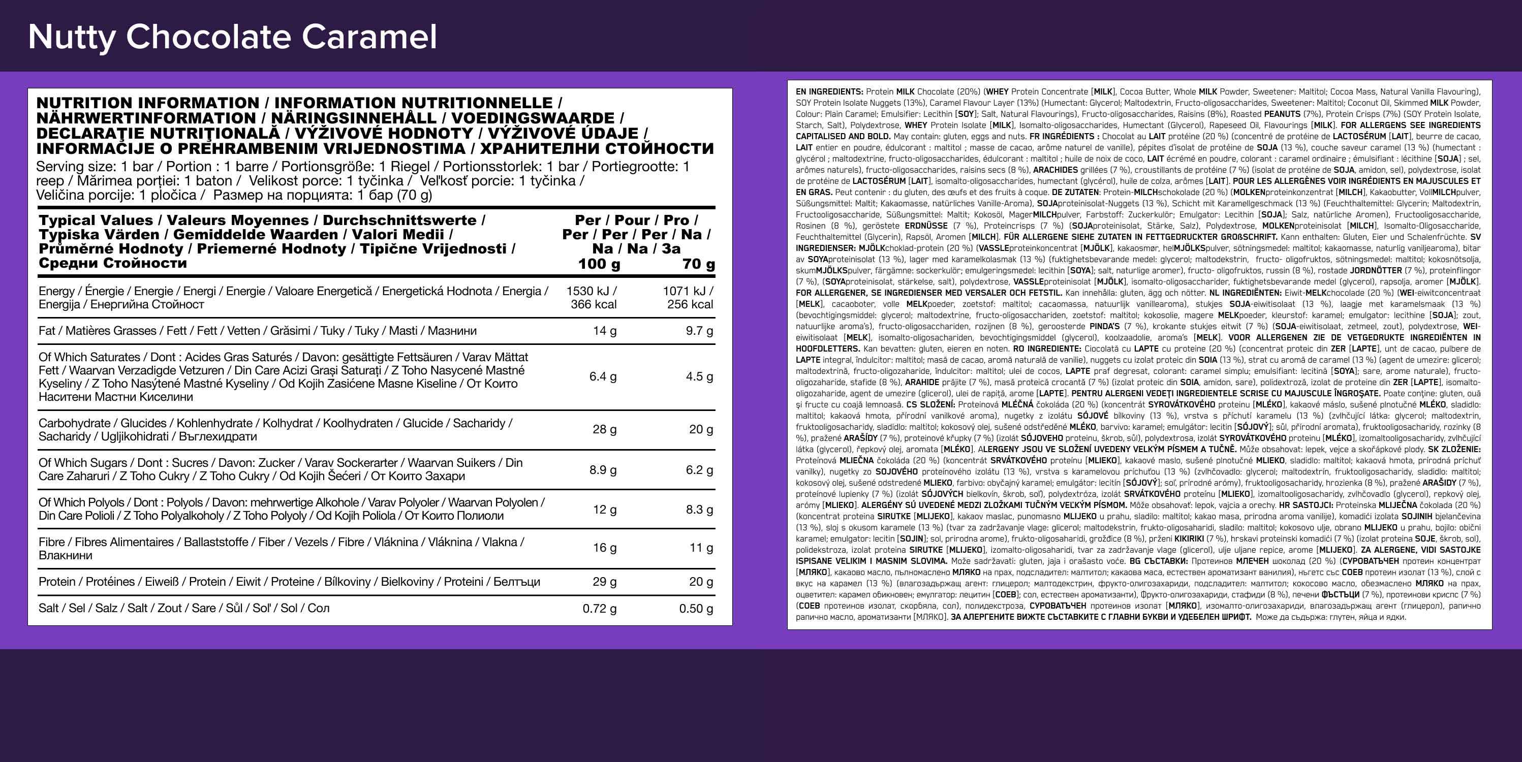 • Chaque barre protéinée fournit 20 g de protéines de grande qualité, notamment de l’isolat de protéines de whey, qui aide à réparer et à reconstruire les muscles après des entraînements intenses.