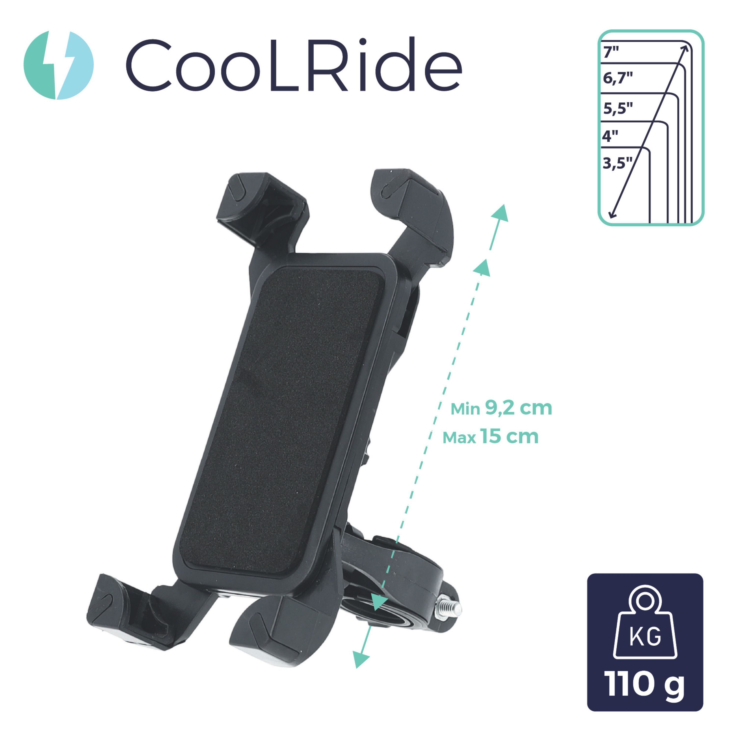 Ce support de téléphone de la marque COOLRIDE est ultra-léger et compatible avec des écrans de 3,5'' à 7''.
